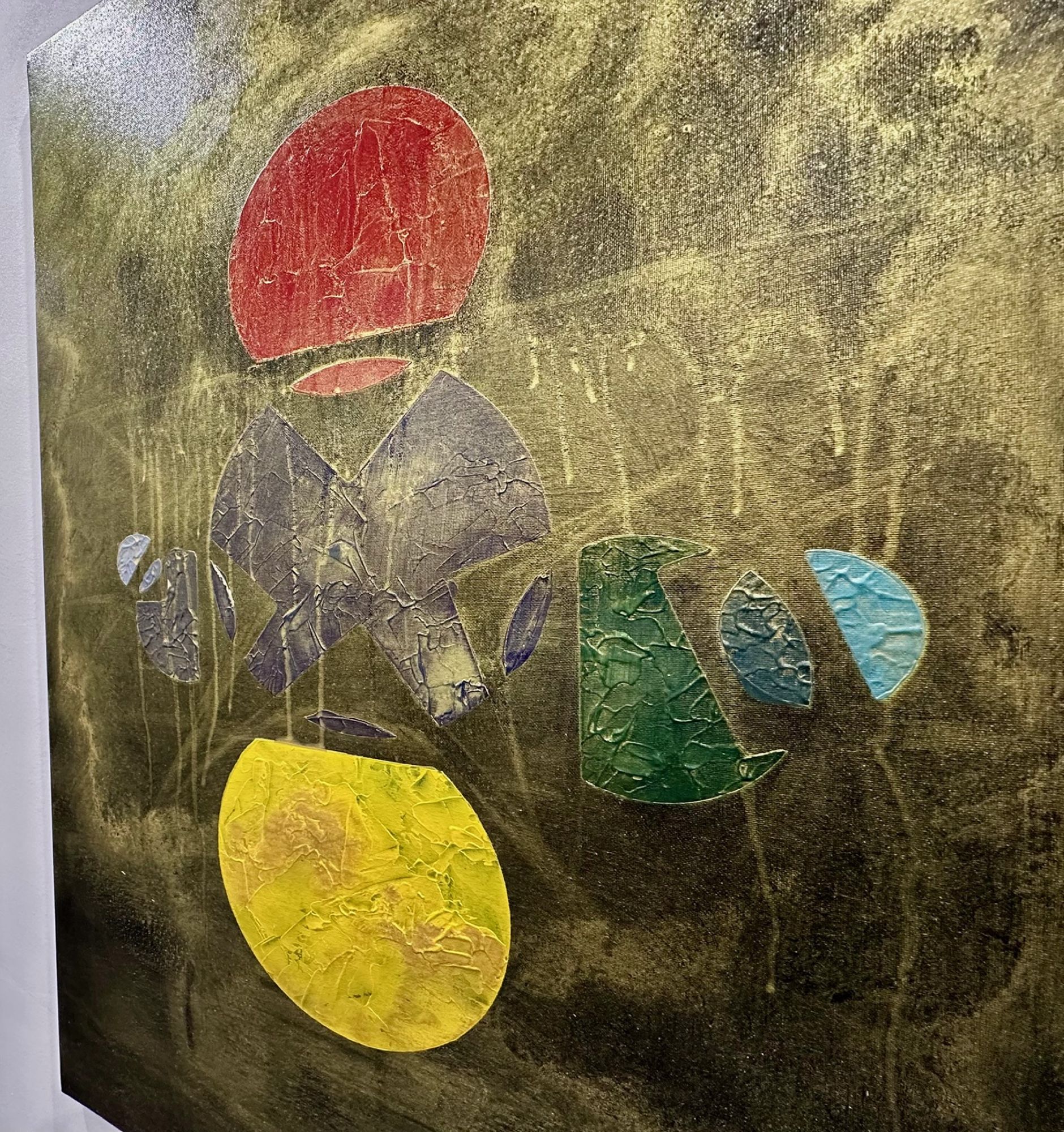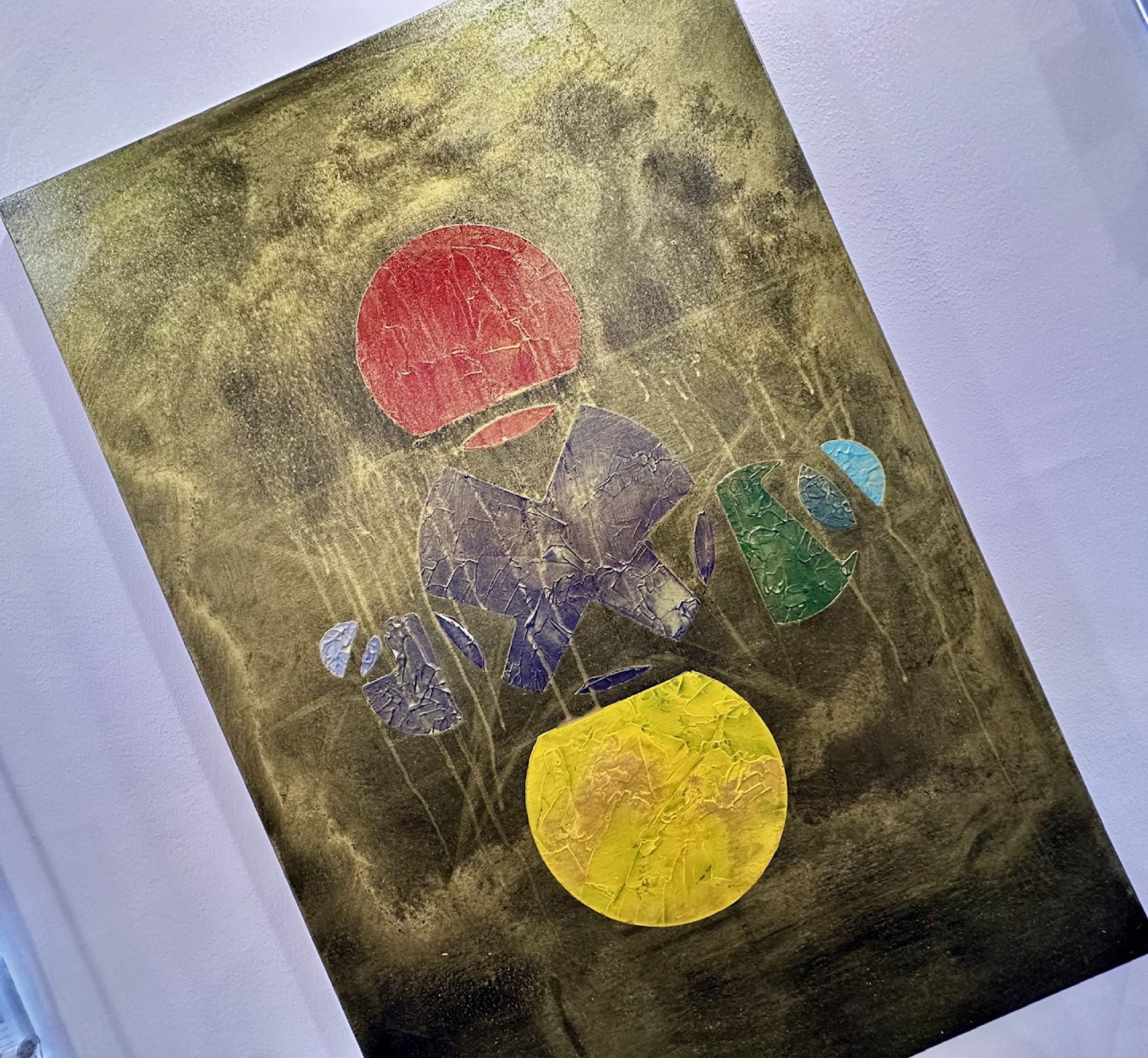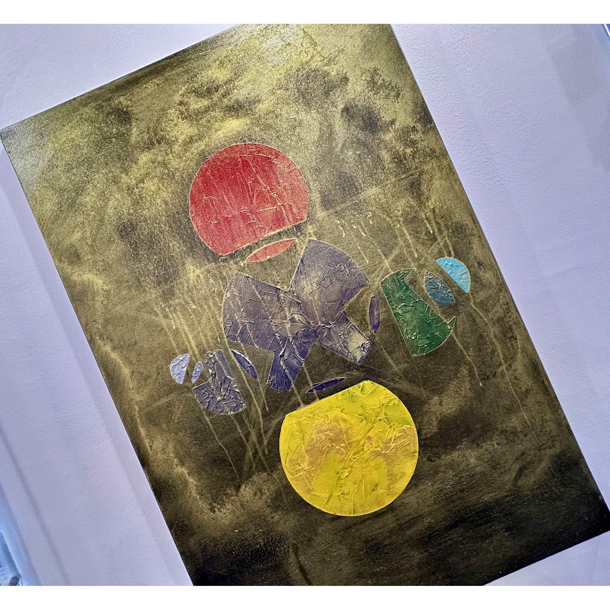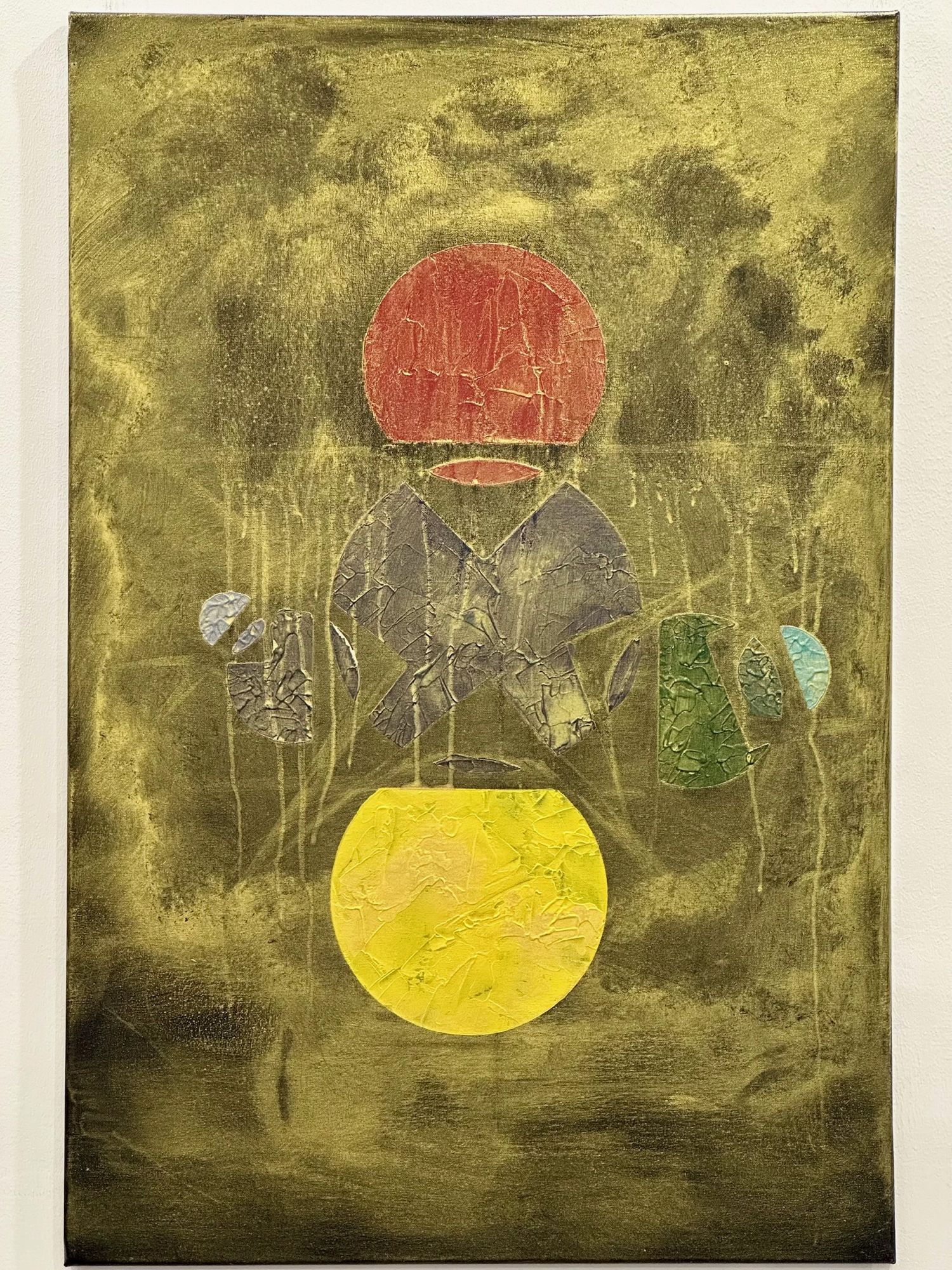 Al centro, la materia appare fratturata e stratificata: superfici crepate, texture e colature suggeriscono un processo di trasformazione continuo. I frammenti sembrano cercare un equilibrio, come se dal caos stesse lentamente emergendo un linguaggio.