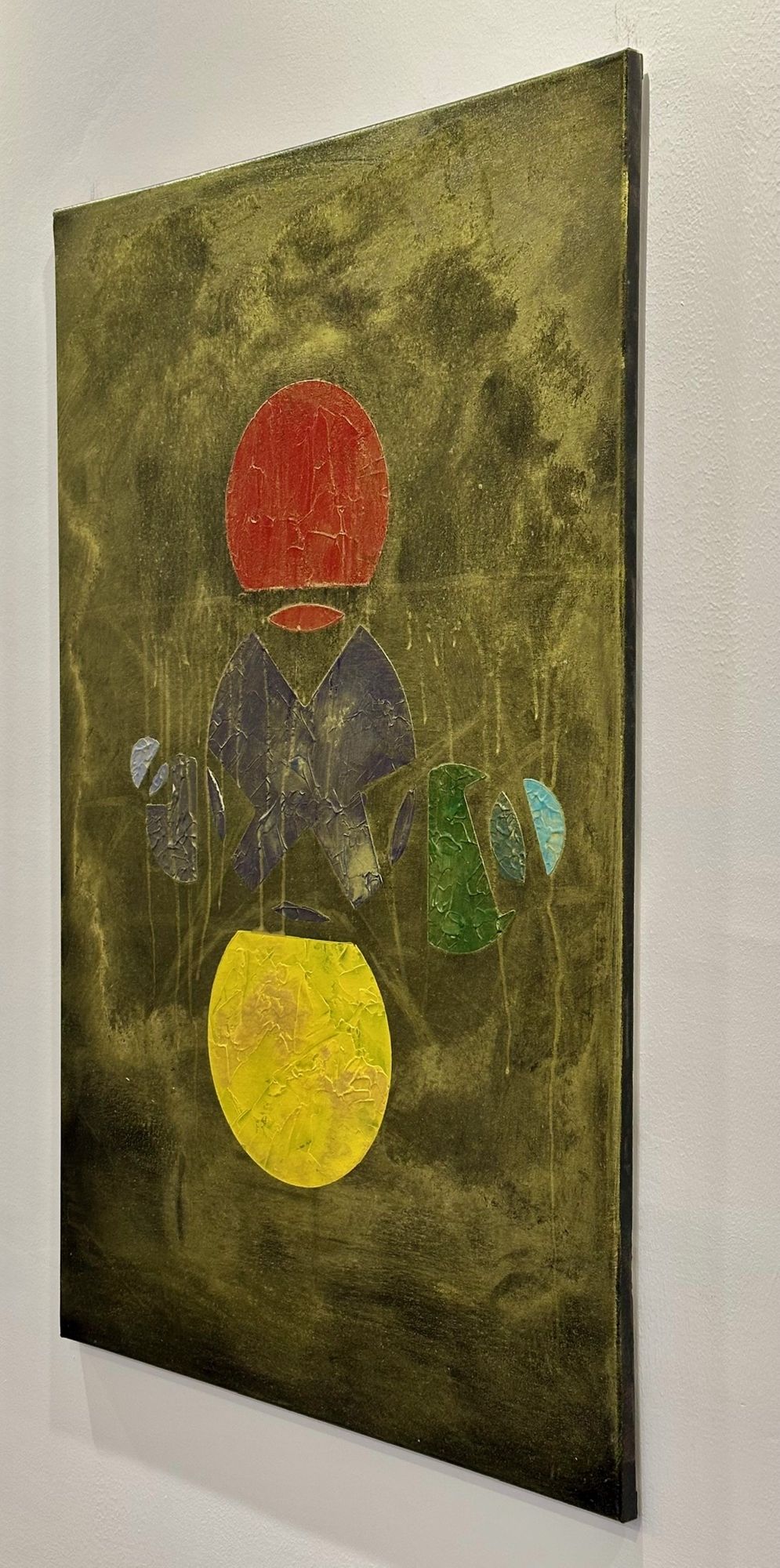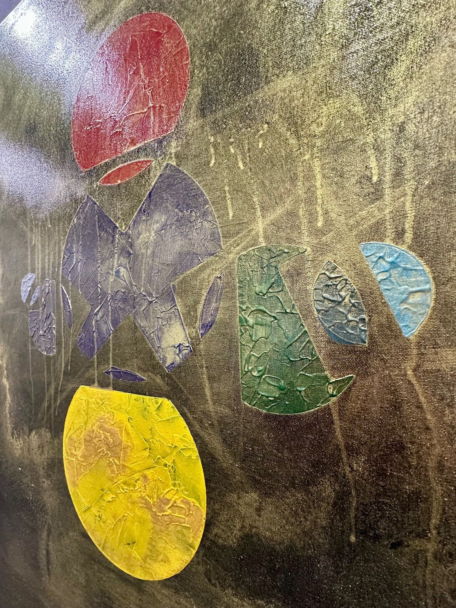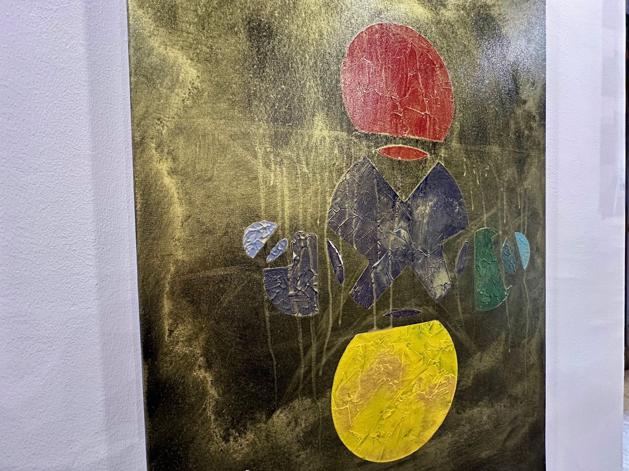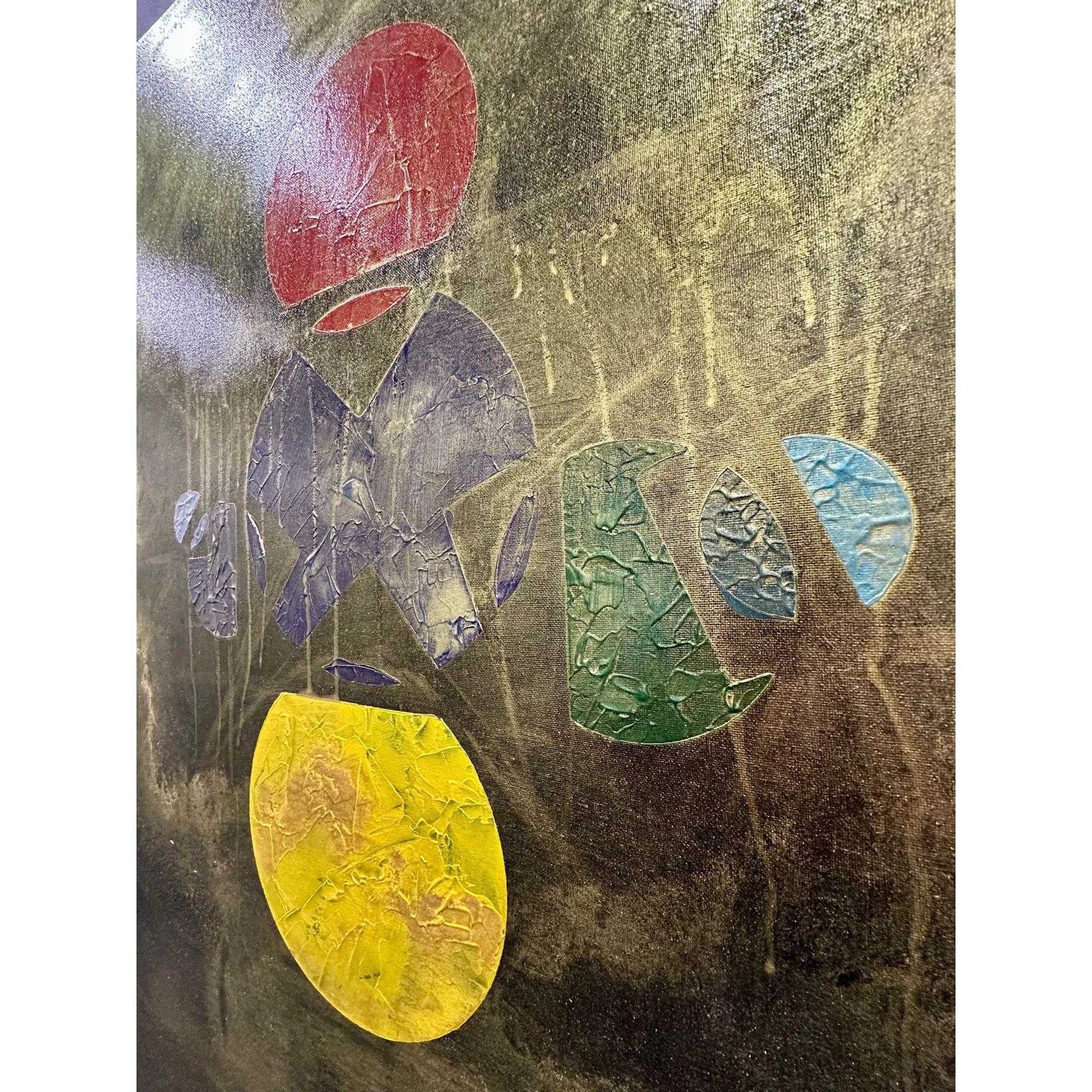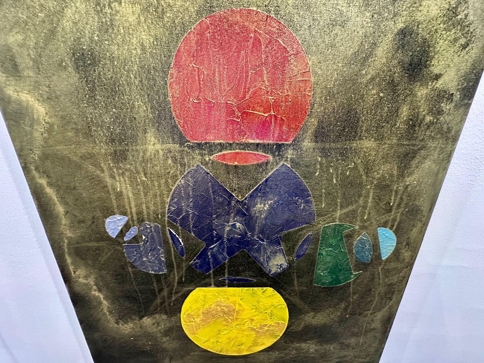 Al centro, la materia appare fratturata e stratificata: superfici crepate, texture e colature suggeriscono un processo di trasformazione continuo. I frammenti sembrano cercare un equilibrio, come se dal caos stesse lentamente emergendo un linguaggio.