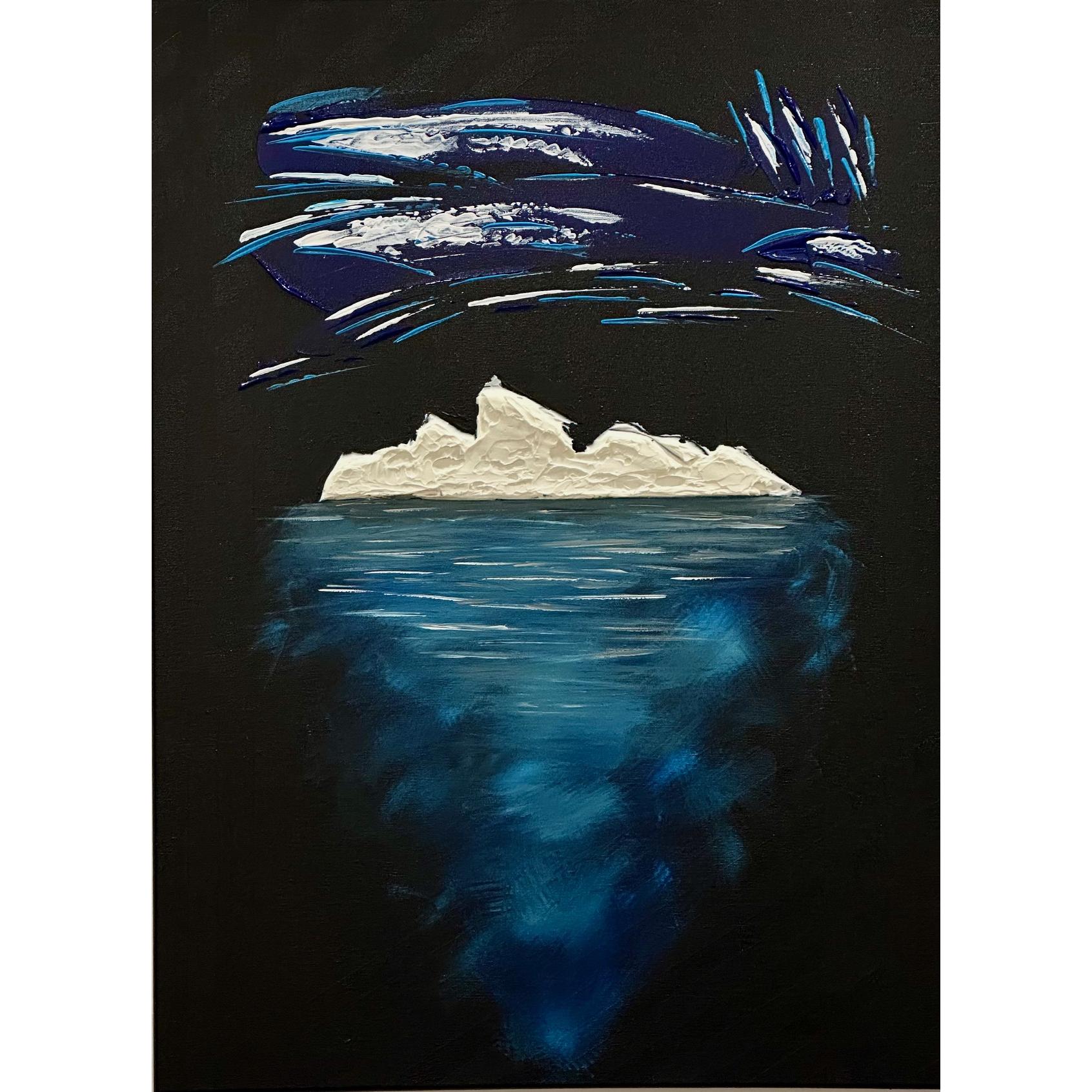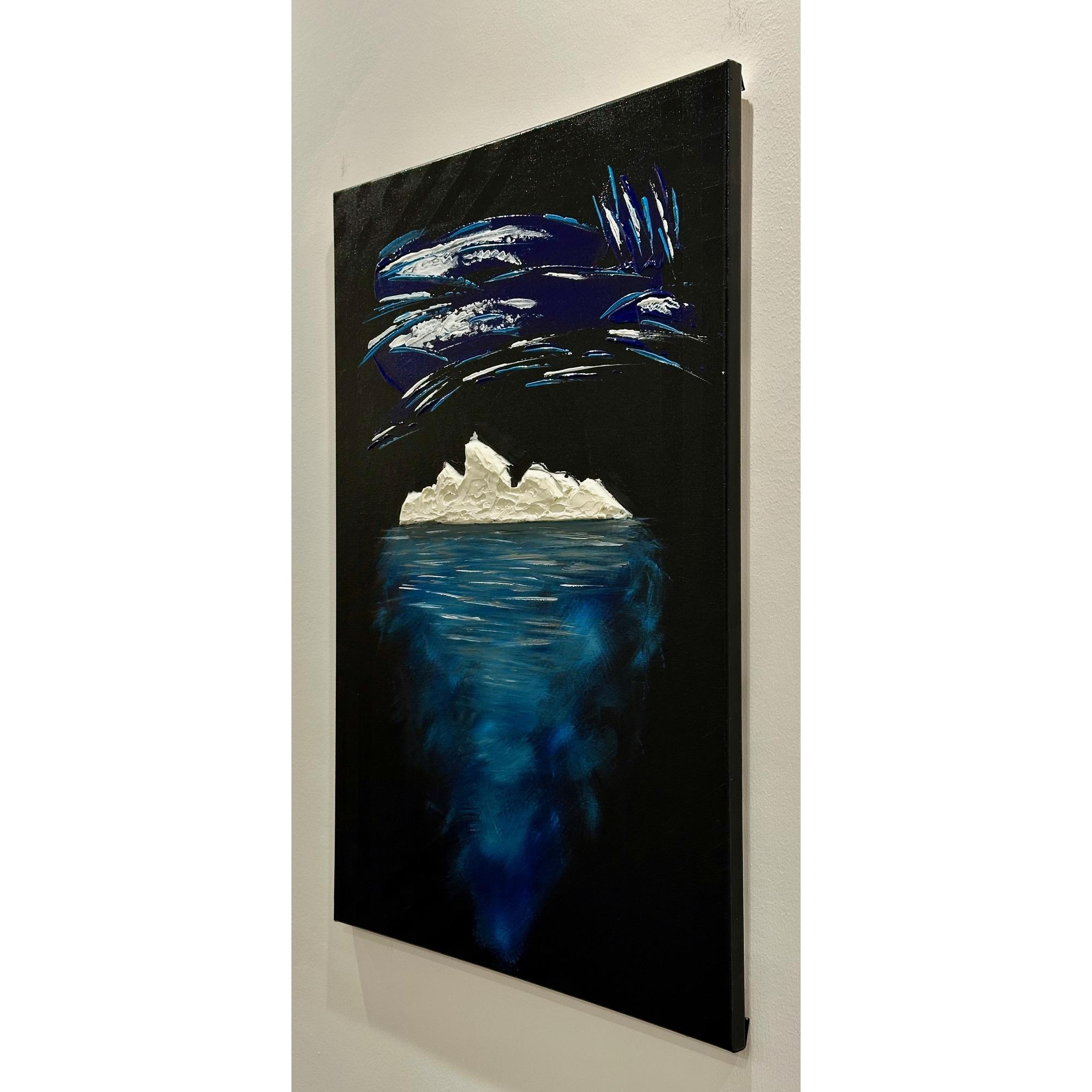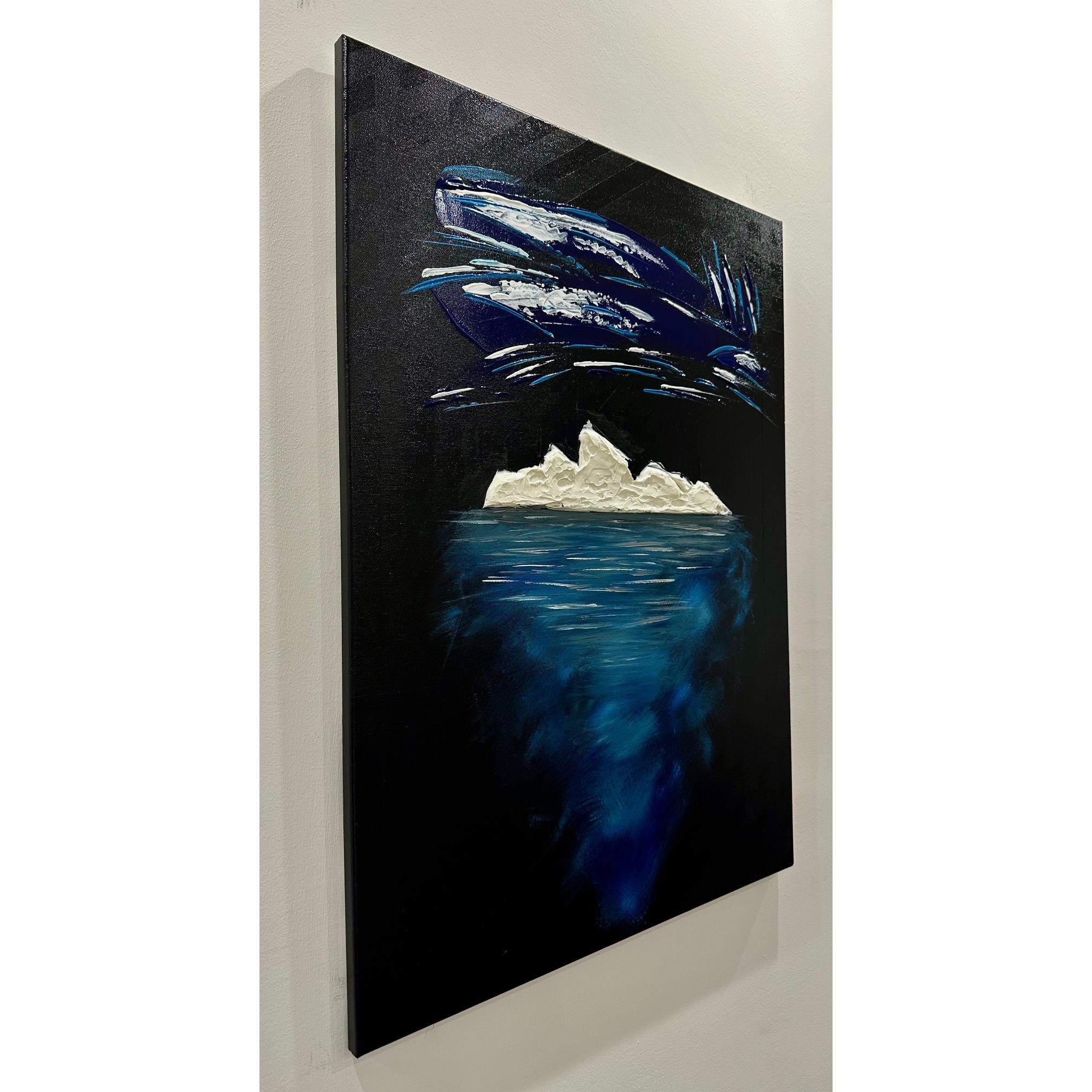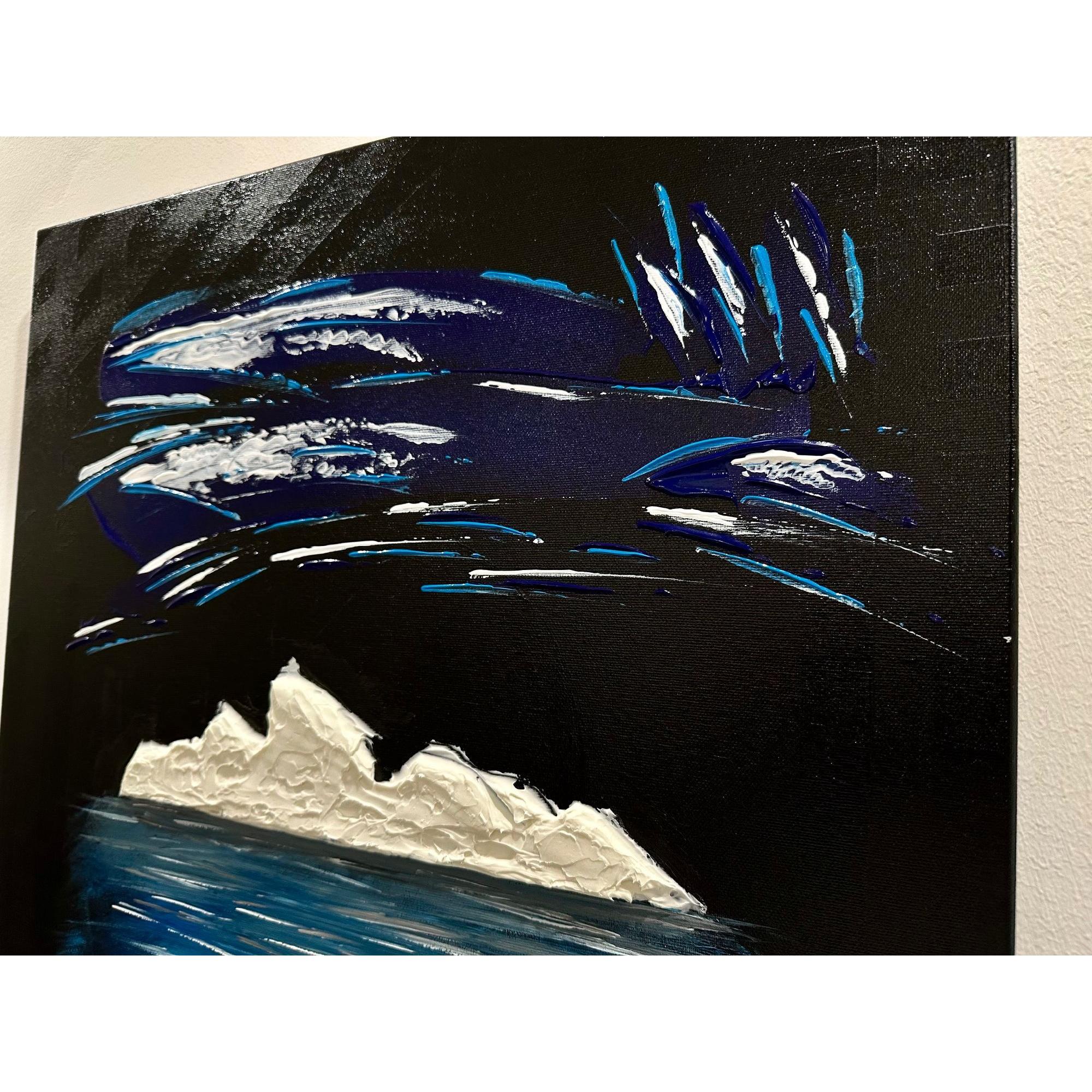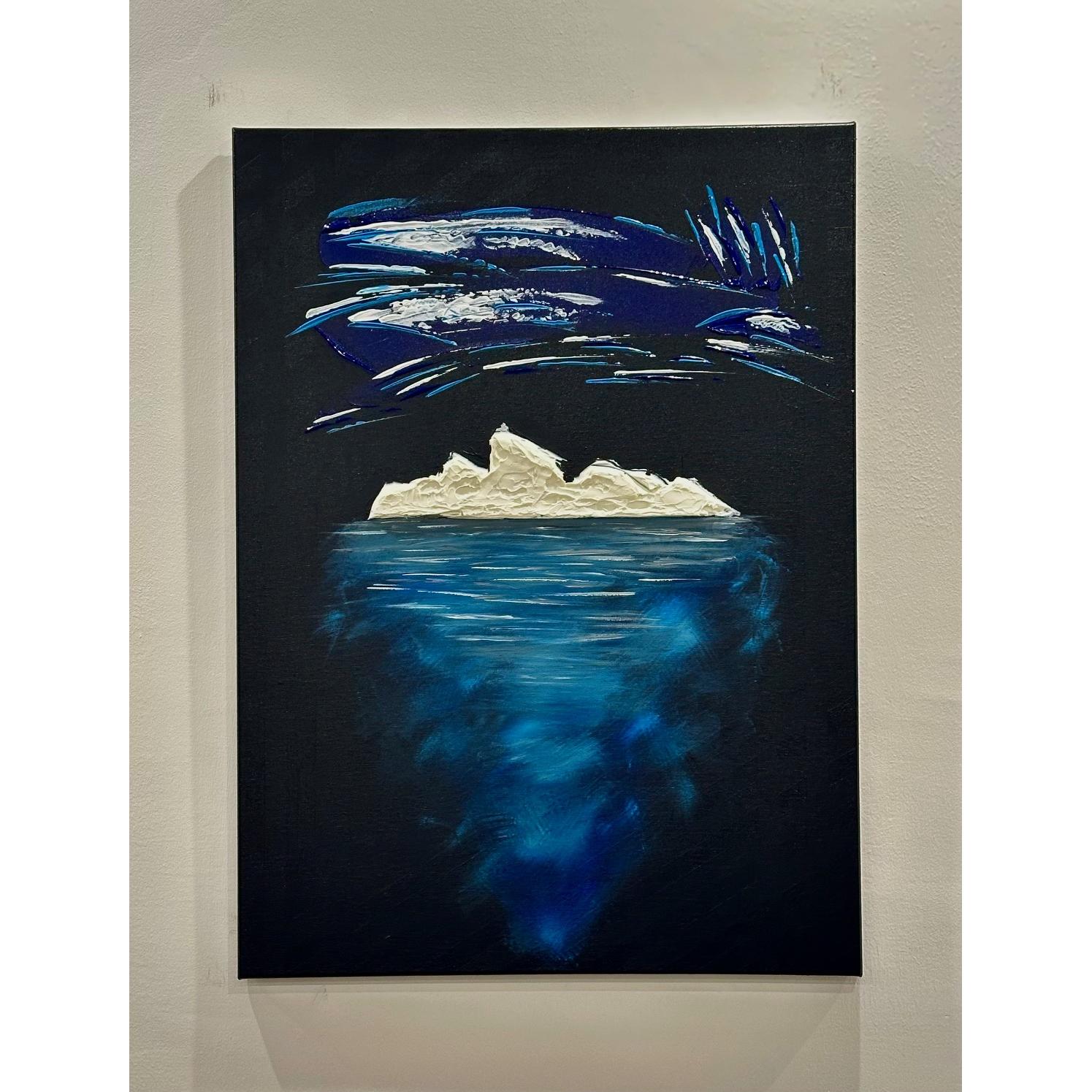 La parte che emerge è solo una soglia bianca, fragile, esposta alla notte. Ma sotto si apre la vera dimensione: un corpo blu, profondo, in movimento continuo.