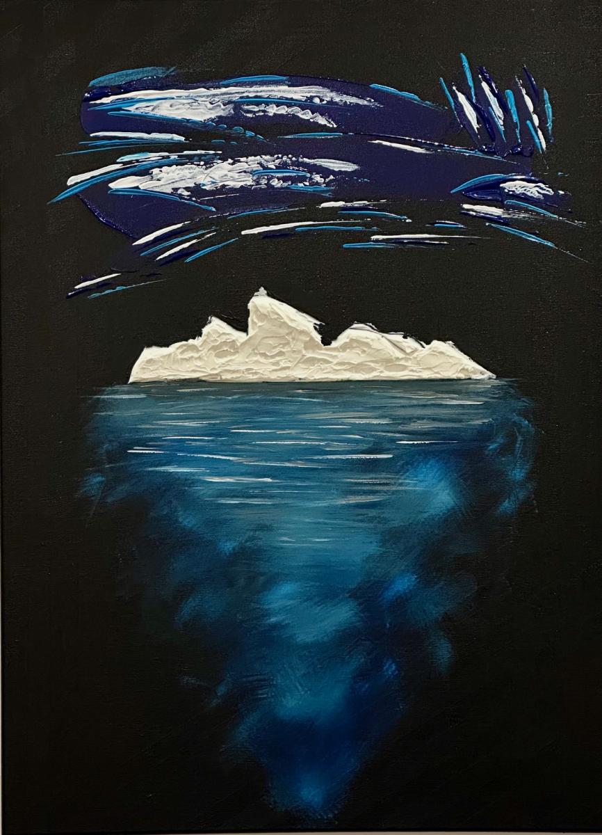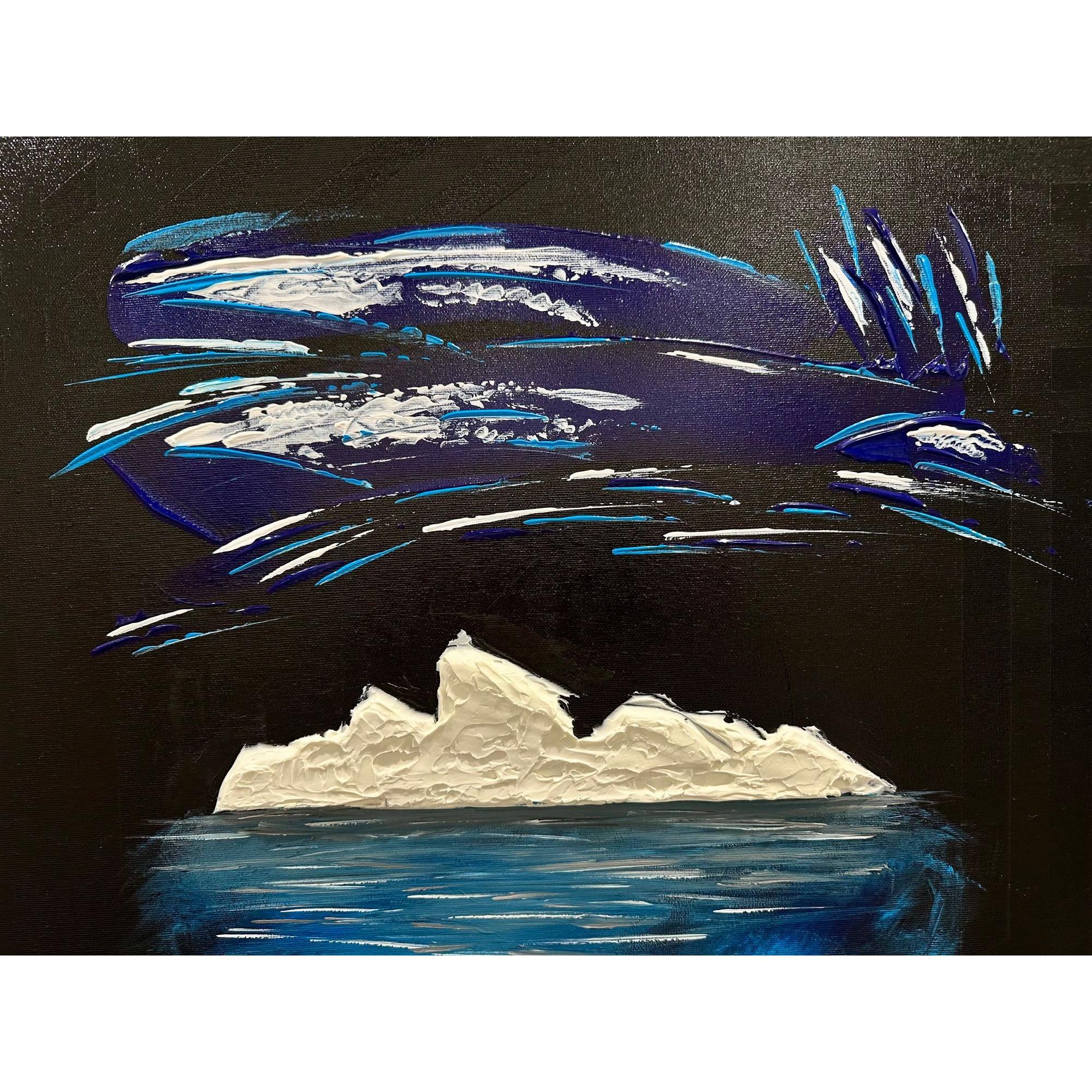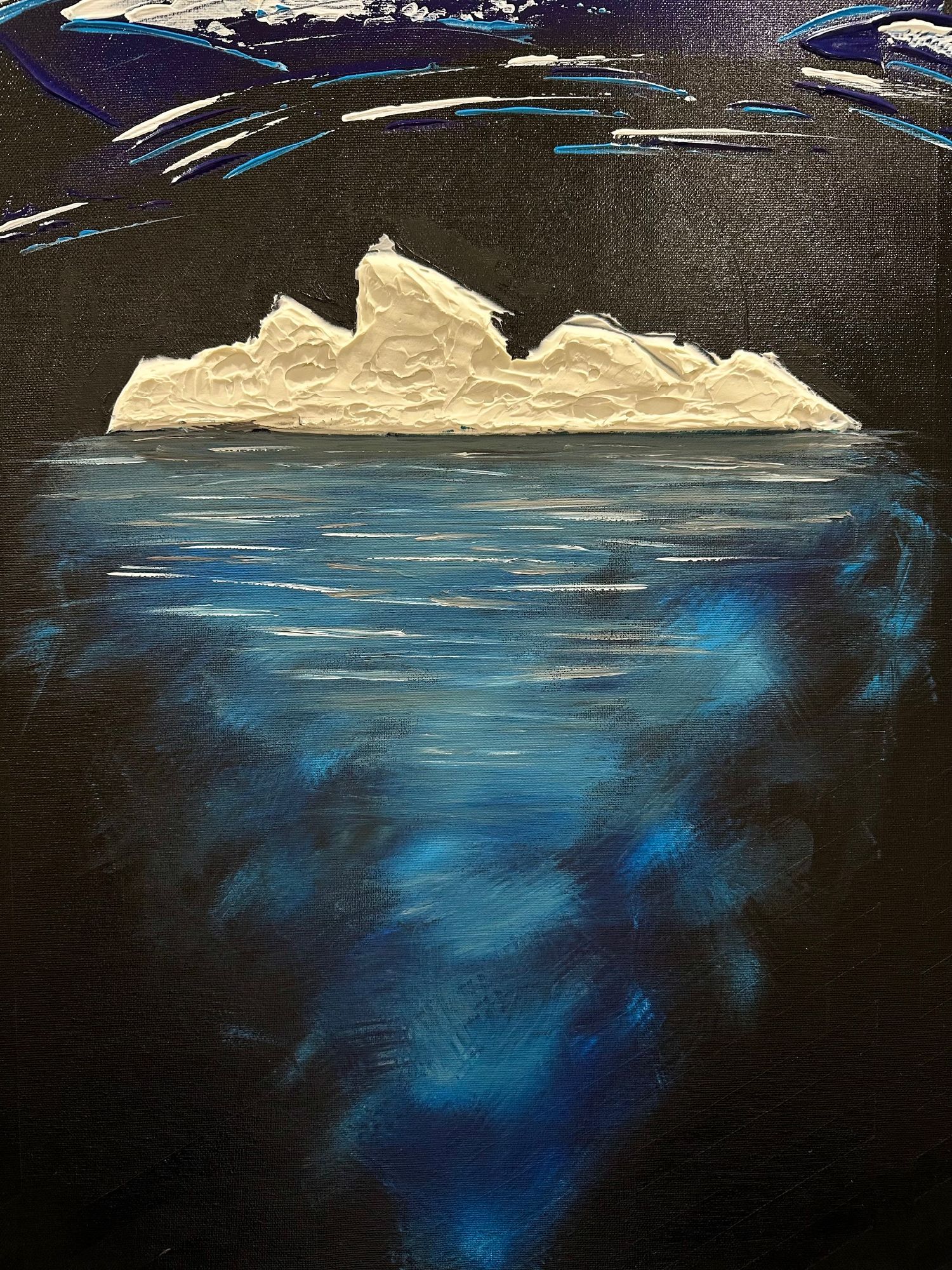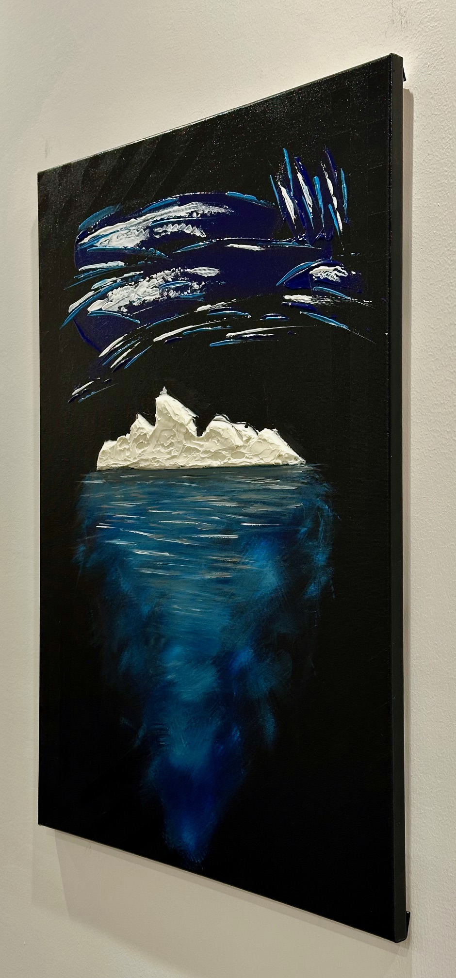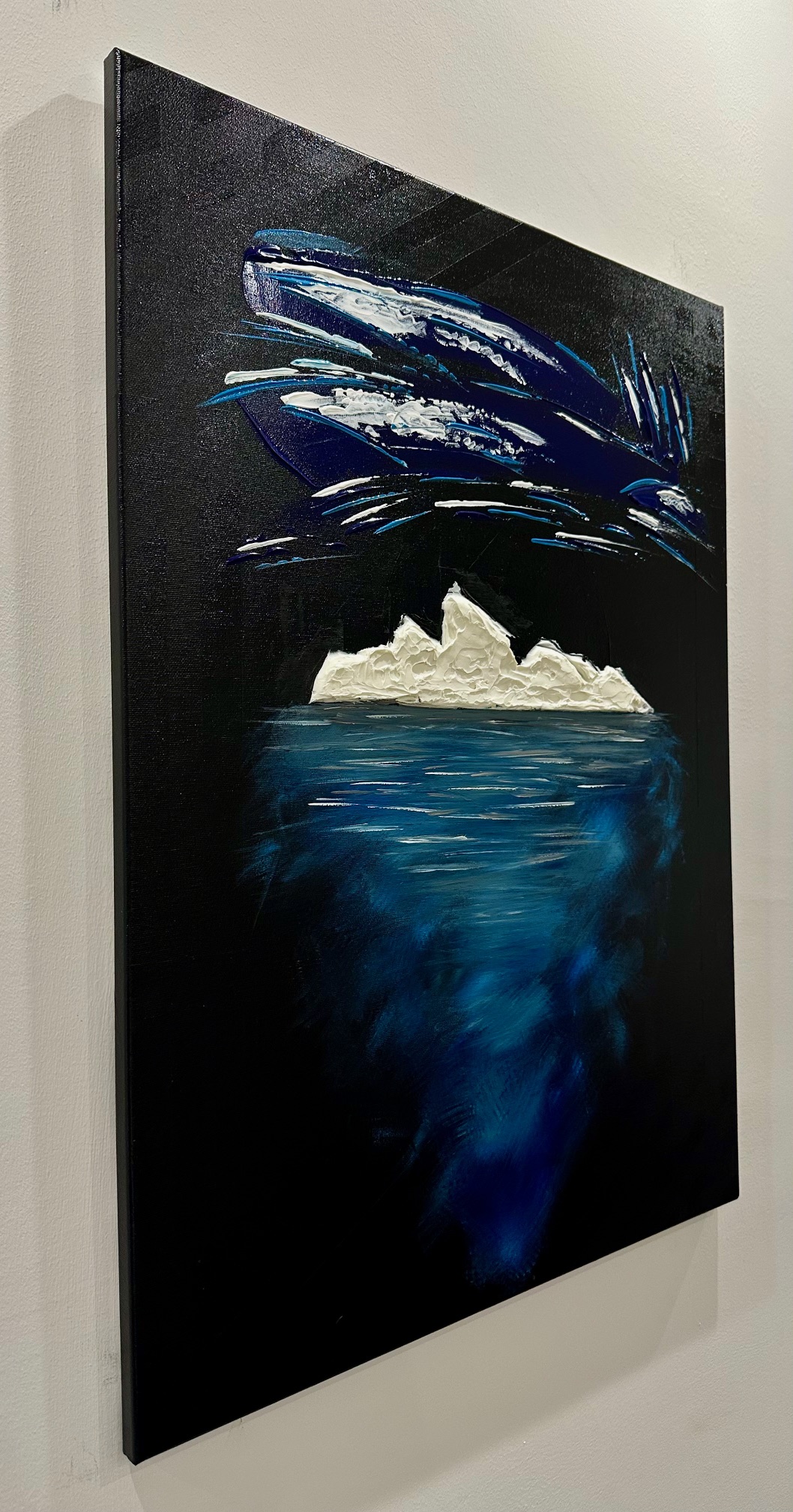 La parte che emerge è solo una soglia bianca, fragile, esposta alla notte. Ma sotto si apre la vera dimensione: un corpo blu, profondo, in movimento continuo.