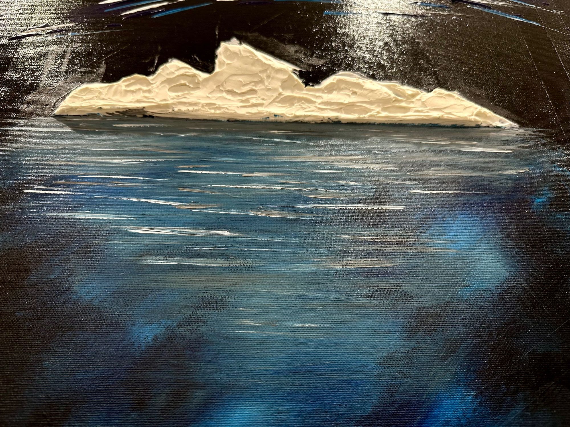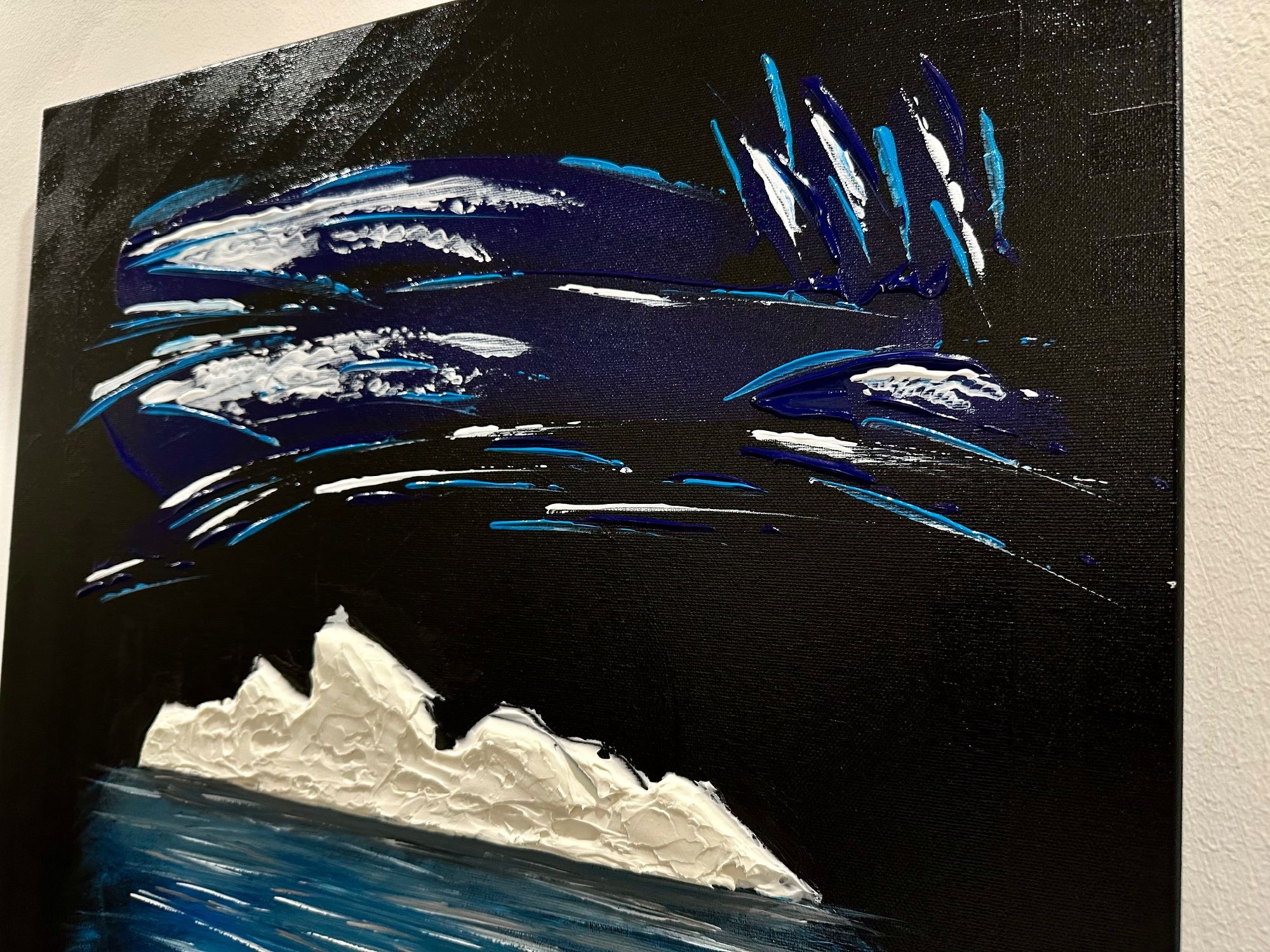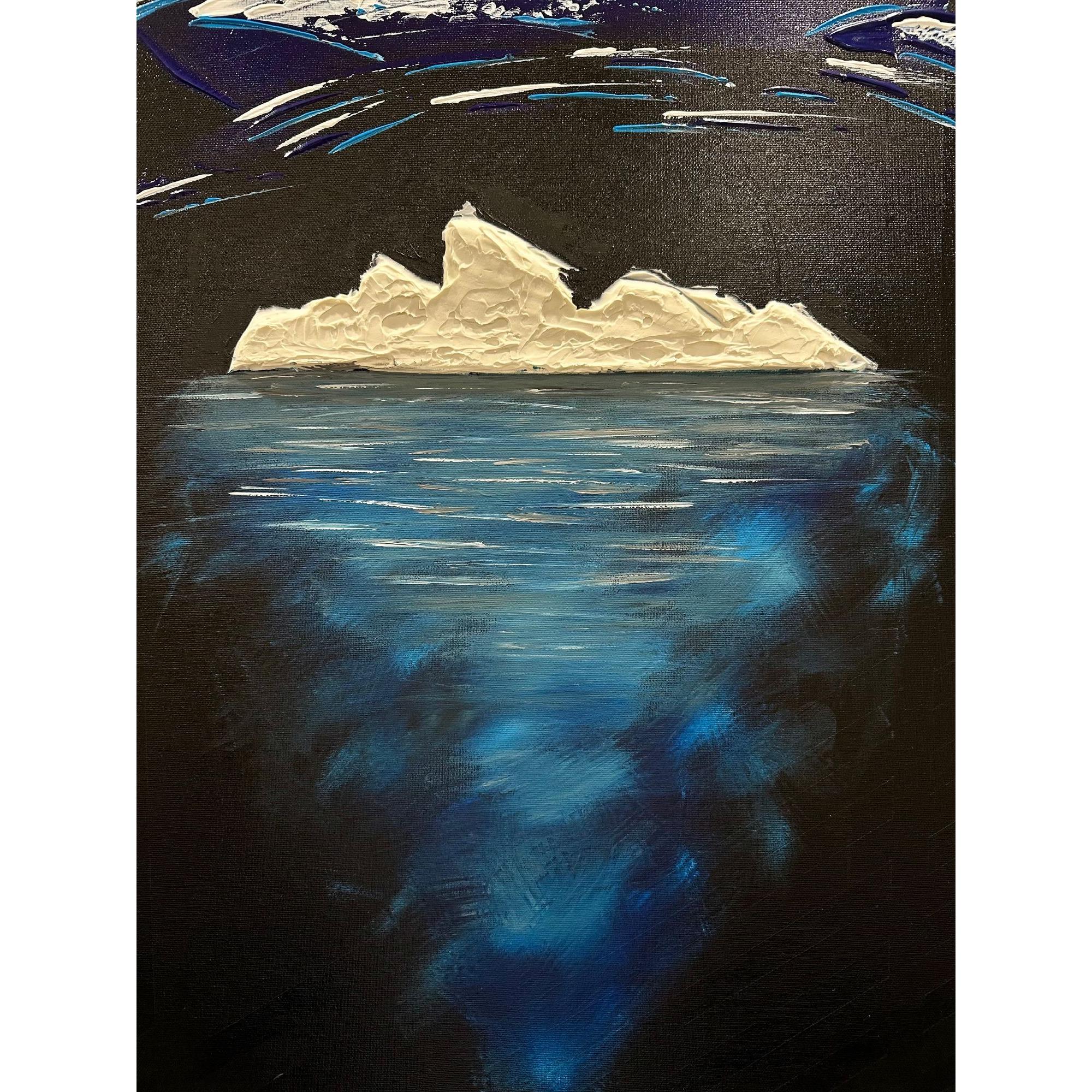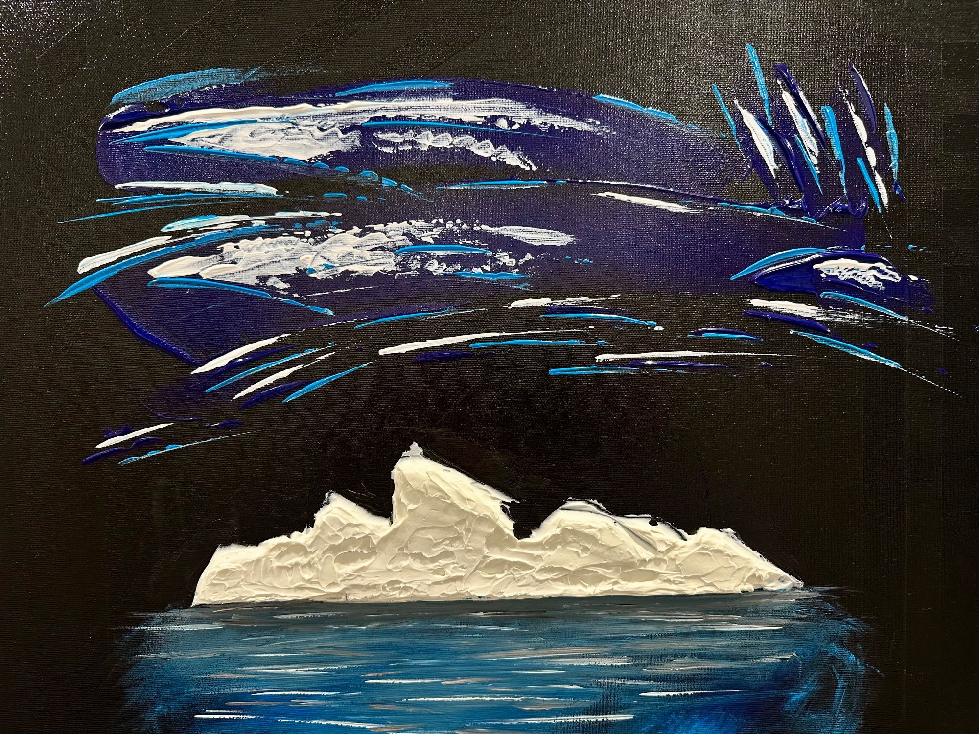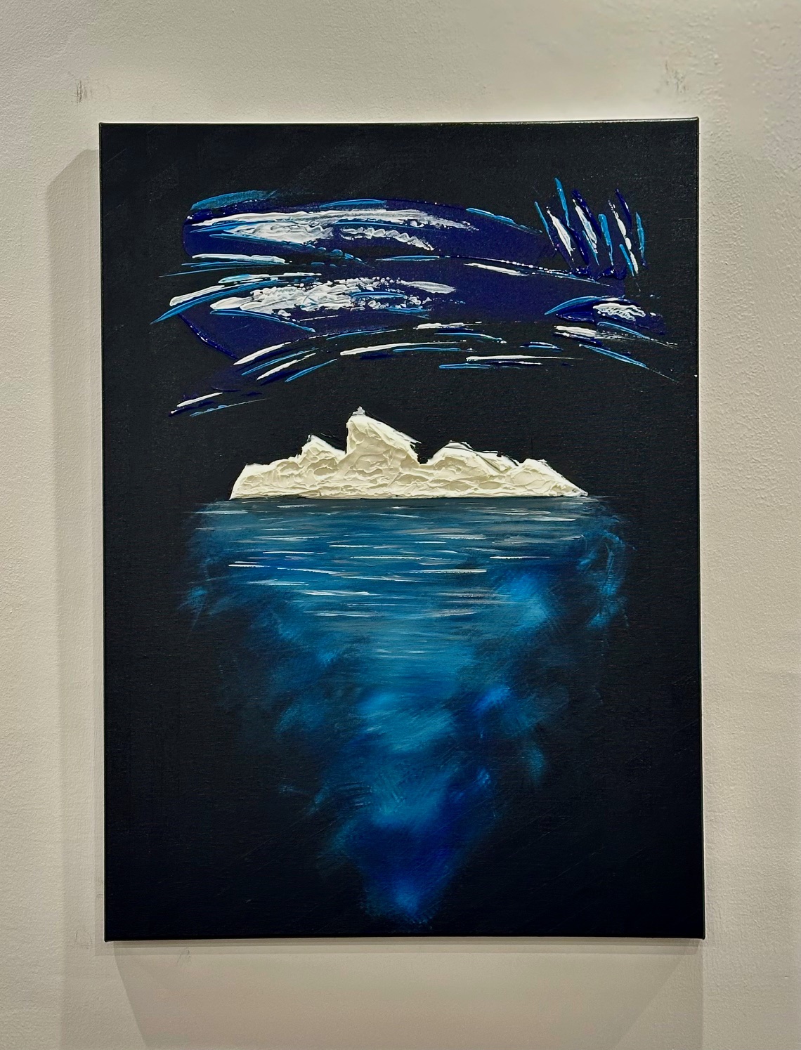 La parte che emerge è solo una soglia bianca, fragile, esposta alla notte. Ma sotto si apre la vera dimensione: un corpo blu, profondo, in movimento continuo.