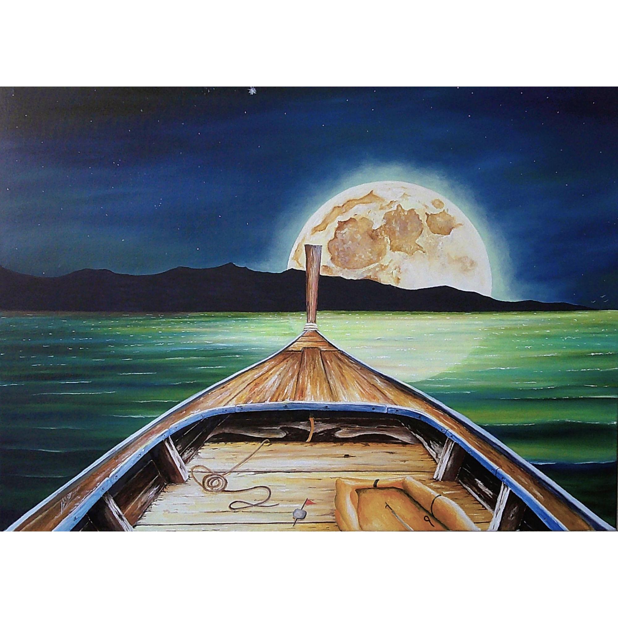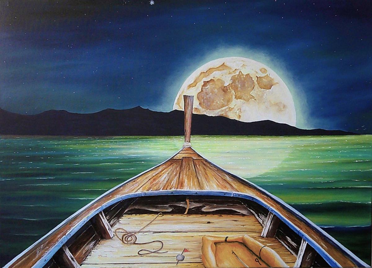 Quella notte il vento soffiava piano, quasi a non voler disturbare il respiro delle onde. La luna quella notte era enorme e il mare ne catturava la luce e la trasformava in un tappeto scintillante. Fu lì che vidi un'imbarcazione, non era grande, ma la chiglia consumata e le vele raccolte sembravano ali a riposo e per un momento sentii il profumo del legno e del sale.