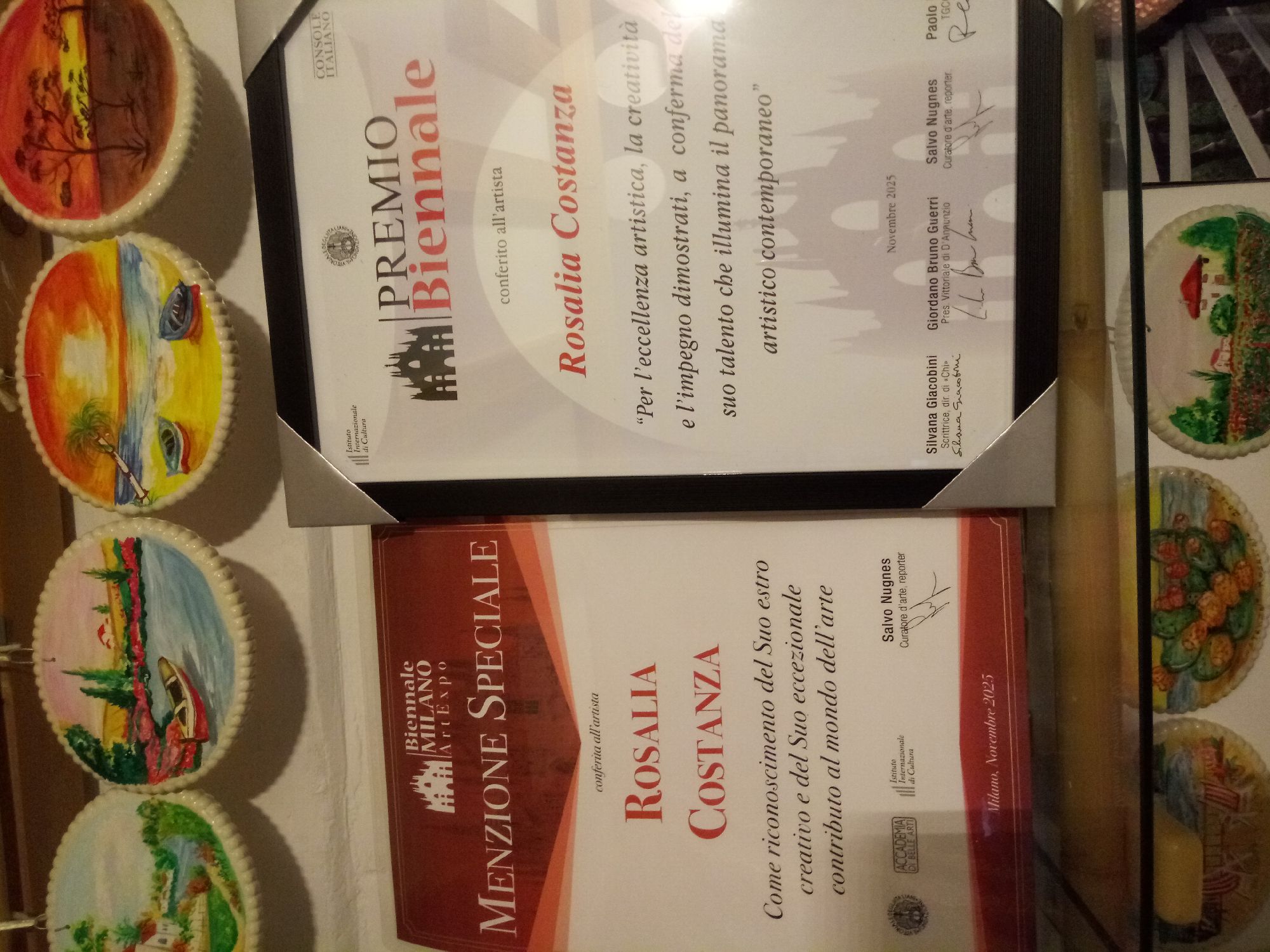 premio Van Gogh , premio Michelangelo, premio Paolo Levi , premio Biennale D'Arte amici del quadrato, trofeo La Vela D'oro, Biennale di Palermo , premio arte Expo ecc..... Attestato accademia internazionale delle avanguardie artistiche ecc... esposizione opere Museo del Louvre , Museo del Presente , Museo Miit , Opera " Il pappagallo sull'oceano " opera in permanenza al Museo di Monreale ( Pa) , esposizione opere per la Triennale di Roma , Prossimo evento dall'11 al 19 agosto esposizione opera Biennale di Chianciano inserimento nel volume D'arte De Agostini prossimo evento Partecipazione a : PADIGLIONE EUROPA