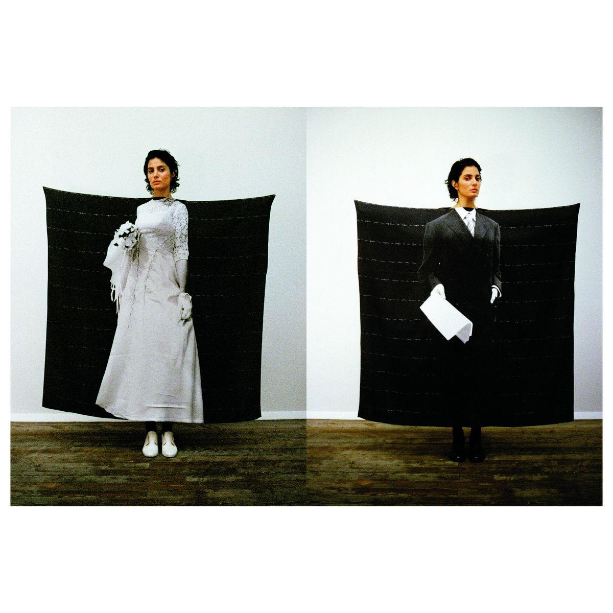 «Il lavoro manualeimpiegato nella realizzazione della collezione – prosegue Calderara –rimanda direttamente alla rimozione storica del lavoro artistico femminile,alla sua marginalizzazione. È lo stesso meccanismo che ha spinto Bianca adadottare un nome maschile, rendendo evidente come l’accesso al riconoscimentoartistico fosse, e in parte continui a essere, profondamente segnato da unadisparità di genere». Questo concetto prende forma in un abito essenziale,ridotto a una struttura rettangolare, attraversata da un’apertura per il capo edue per le braccia, su cui è stampato il dittico fotografico Bianca Menna eTomaso Binga. Oggi spose (1977). Pensato per essere indossato su entrambi ilati, il vestito invita a un gioco consapevole di ribaltamento dell’identitàsfidando stereotipi consolidati.