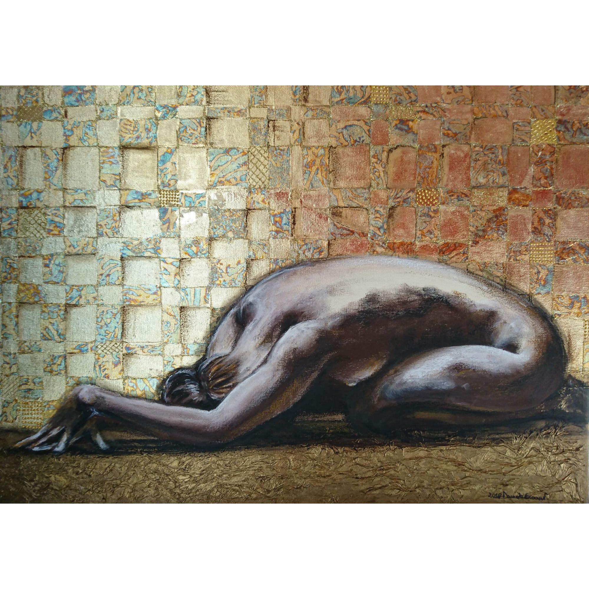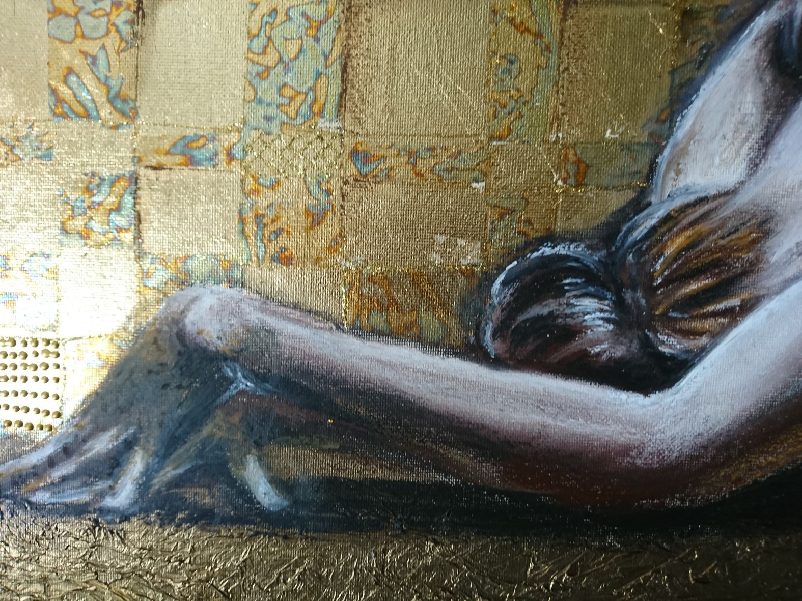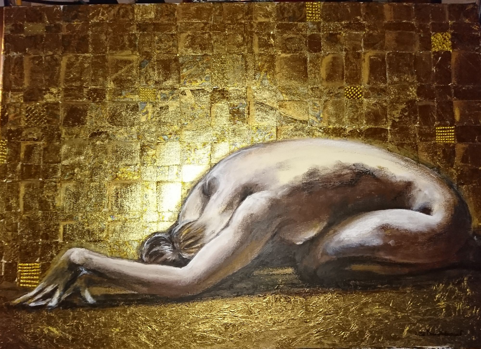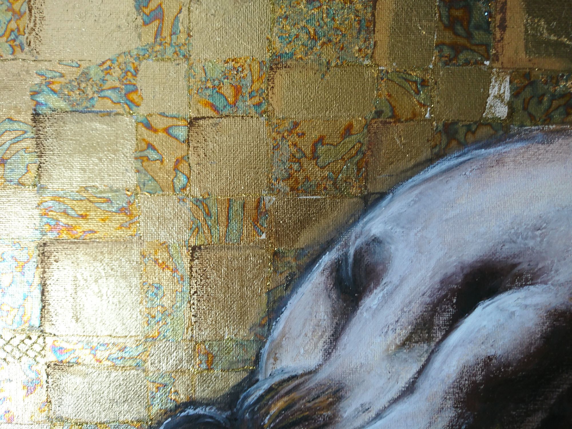 - Materiale:: Pastelli ad olio, foglia oro e variegata, colori acrilici