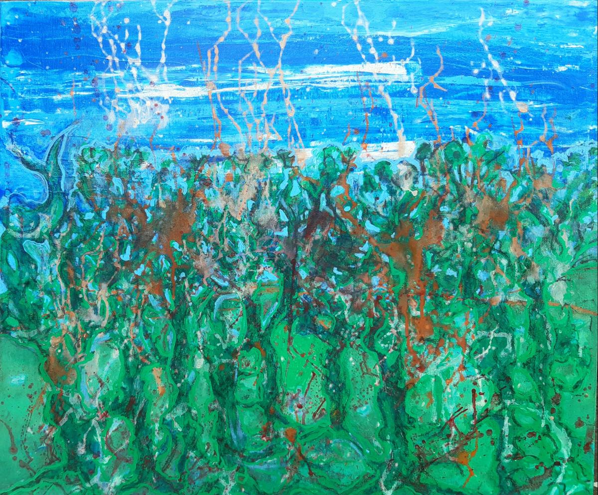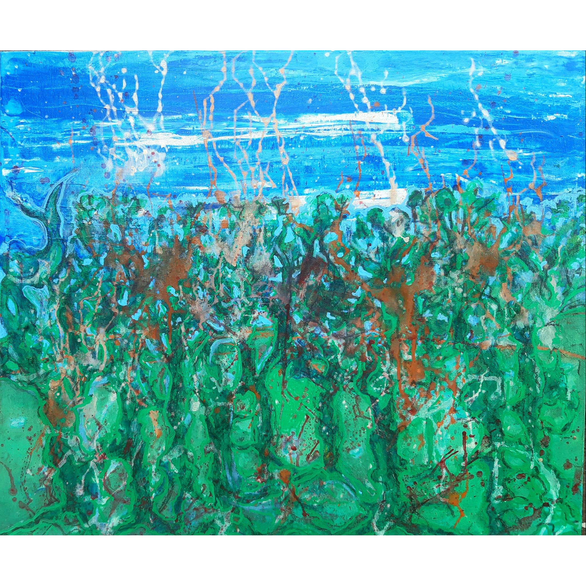 Nella mia opera ho mescolato acrilici e tratti di penna per esplorare l'energia vibrante della natura in primavera. Il vibrante blu e il verde predominanti evocano la freschezza e il rinnovamento della stagione. Questo quadro trasmette un senso di crescita e speranza, un'esplosione di vita che invigorisce lo spirito e trasforma ogni ambiente con la sua presenza dinamica. Serie Visioni di Maggio ,il punto della profondità interiore come trasformazione .In questa opera ho cercato di far emergere l'intensa acqua che cadeva nel Maggio e non come disgrazie ,ma più per far emergere una sorta di ri equilibrio degli ELEMENTI ; ho usato colori dell'ARIA ed ACQUA come base ,in una veduta di un paesaggio che diventa un tutt'uno con la Terra fino a diventare un paesaggio Marino .