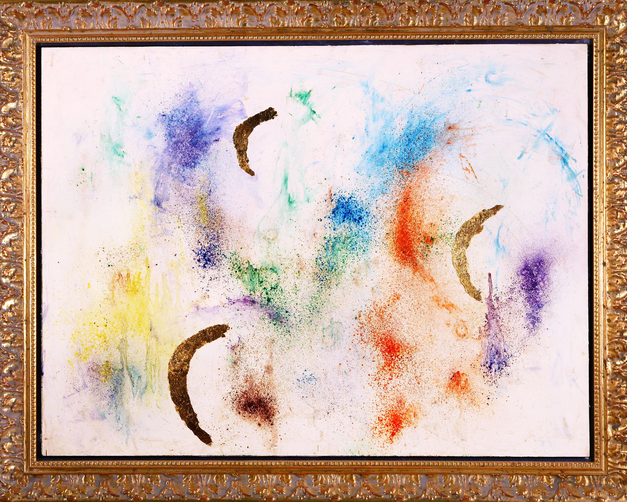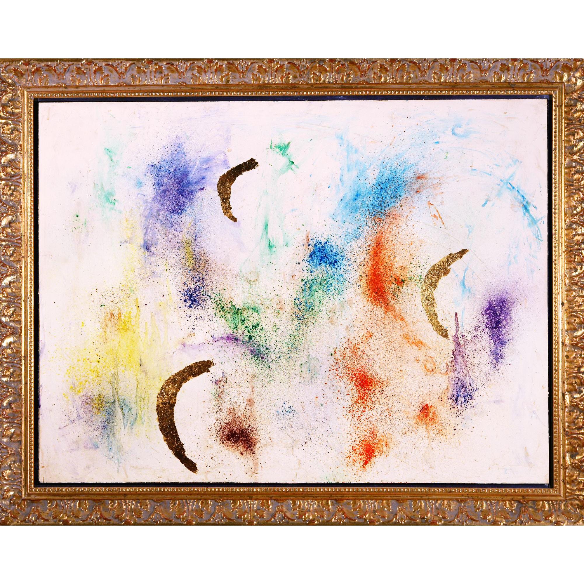 Una mia interpretazione e visione , " andare oltre i propri limiti , spesso motivo di sofferenza. L'ispirazione in quest'Opera avviene in una soffusa vibrazione di bianco insieme ai pigmenti creando immagini e profili , la foglia d'oro da la forza, la direzione per andare oltre il conosciuto. Opera con Cornice dorata compresa nel prezzo