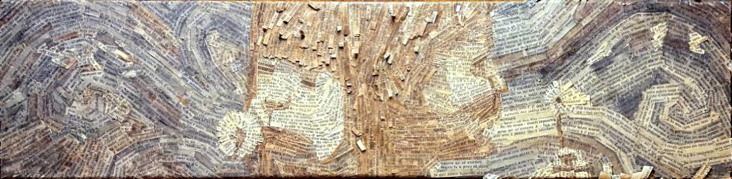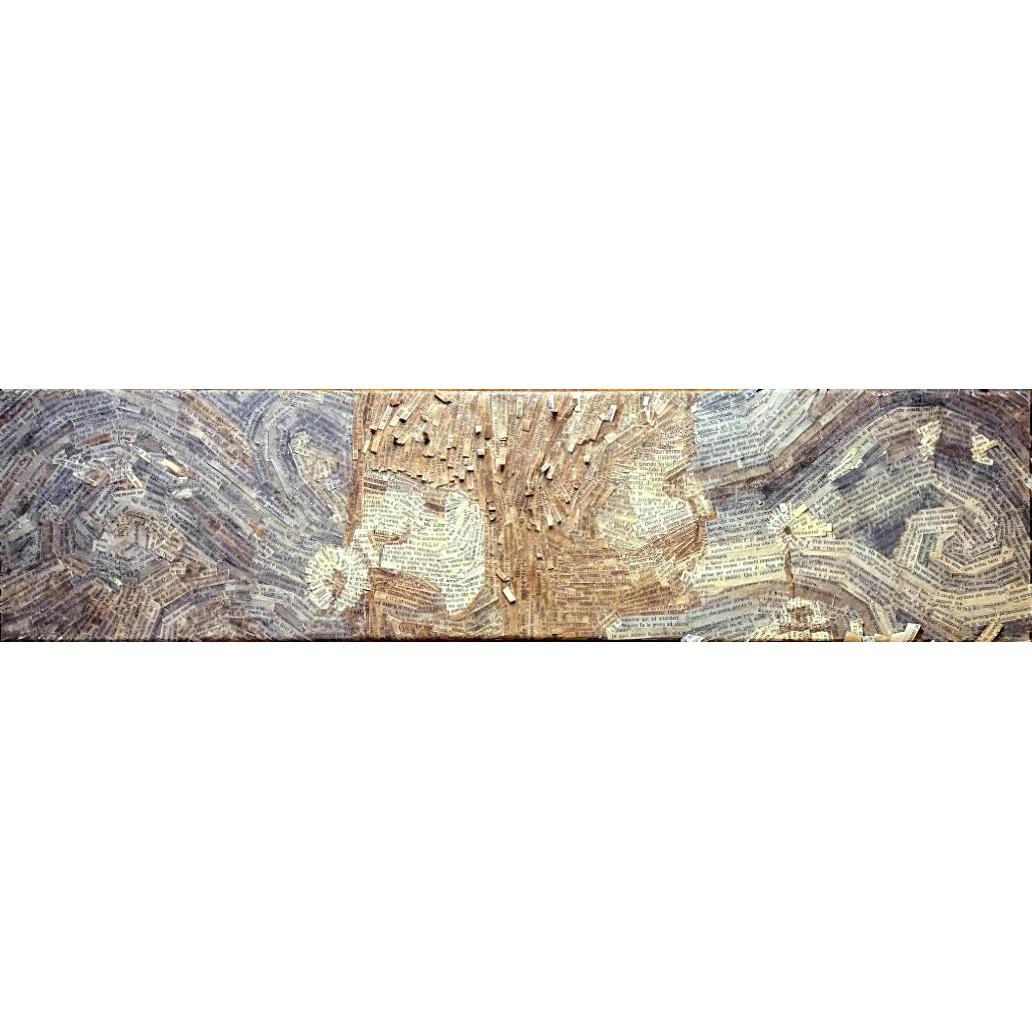 Genesi: androgino (2015) di Danilo Lavorgna affronta il tema archetipico dell’unità originaria del maschile e del femminile, rappresentata come una condizione ancora immatura e inconsapevole. Le due polarità sono unite ma di spalle, incapaci di riconoscersi, e proprio in questa distanza interna all’unione si colloca l’origine del viaggio umano. I tasselli di recupero, lavorati con ossidi e pigmenti naturali su supporto ligneo, portano con sé una memoria stratificata che rafforza l’idea di una genesi segnata dalla frattura e dalla perdita. I semi di tarassaco, dispersi in vortici spiraliformi, simboleggiano il cammino separato dell’essere, sospinto da forze più grandi di lui, attraverso prove e trasformazioni che richiamano i gironi danteschi dell’esistenza. L’opera non rappresenta una sintesi finale, ma afferma la ricerca come condizione necessaria per un possibile ricongiungimento.