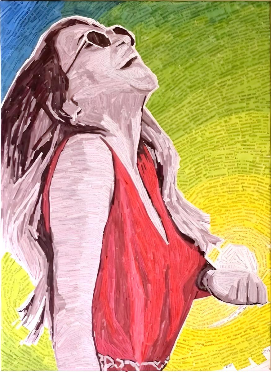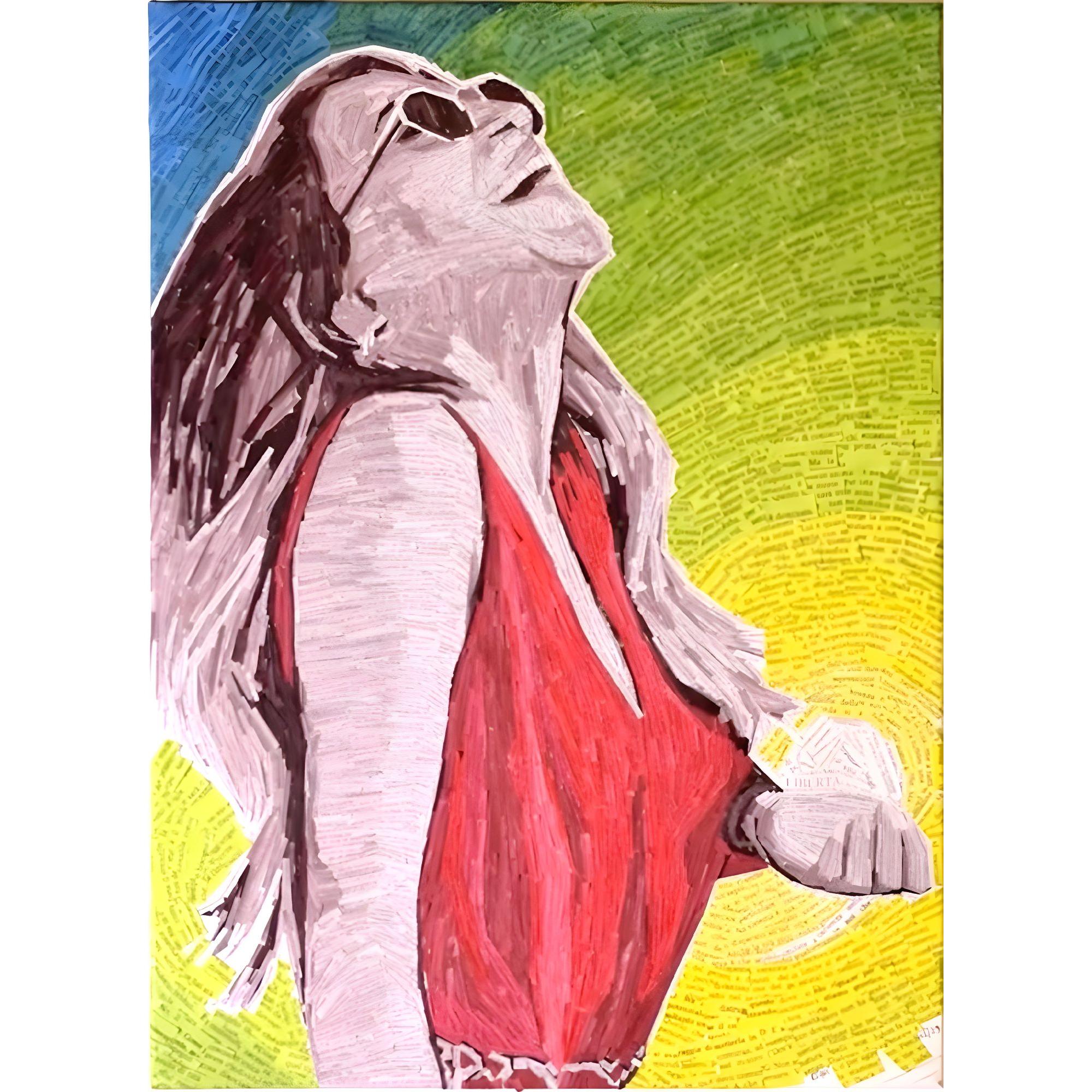 La risata è perfezione: RosAnna Portrait (2024) si configura come un’opera che indaga la libertà interiore come atto di consapevolezza e presenza. Realizzata con tasselli testuali tratti dal libro Libertà dal conosciuto e applicati su tela, l’immagine nasce dalla stratificazione di parole che diventano materia pittorica e struttura del volto. La risata, colta come gesto spontaneo e non mediato, è qui intesa come forma di perfezione: non ideale, ma autentica, perché libera da condizionamenti mentali. Il ritratto di RosAnna emerge come icona di un sapere incarnato, in cui pensiero e corpo coincidono. L’opera invita lo spettatore a un confronto diretto con il presente, suggerendo che la vera libertà non risiede nell’accumulo di conoscenza, ma nel superamento dei suoi limiti.