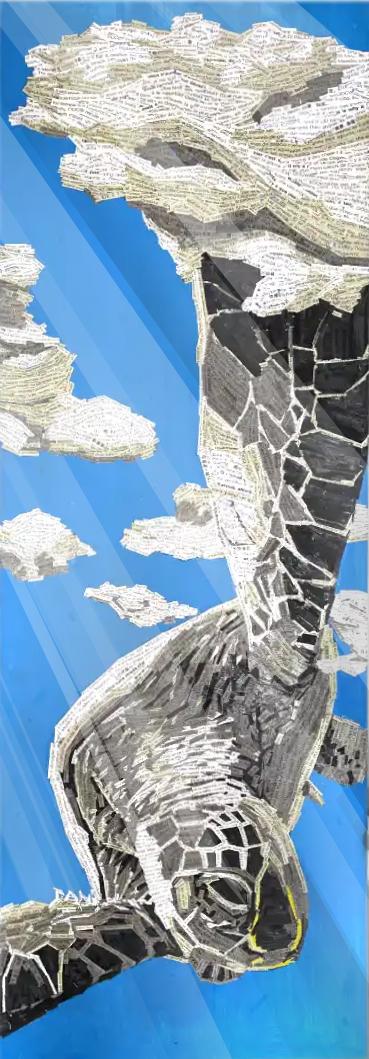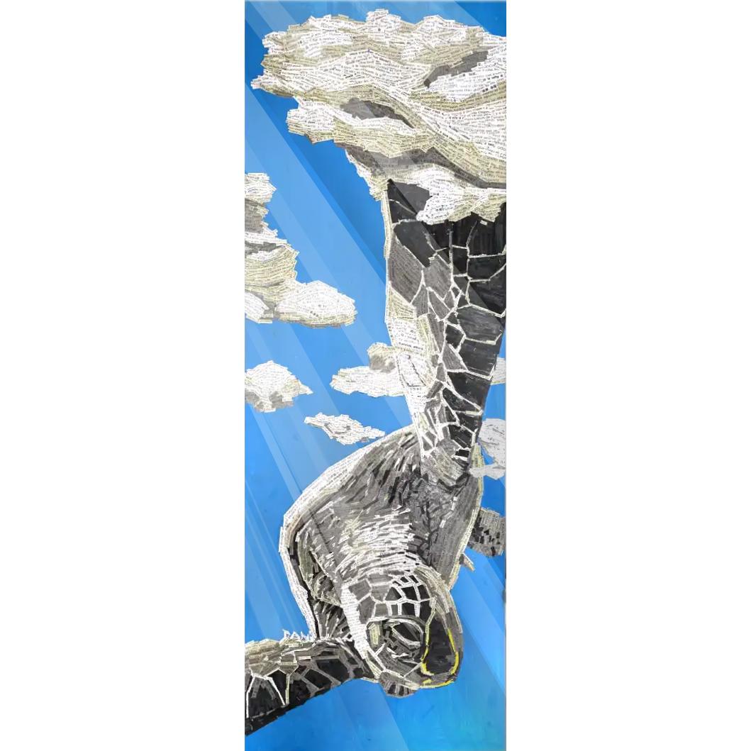 Tortue: il regalo del presente (2024) di Danilo Lavorgna riflette sul tempo come esperienza interiore ed etica, contrapponendo la lentezza consapevole all’urgenza del presente contemporaneo. La figura della tartaruga, ispirata al Maestro Oogway, diventa simbolo di saggezza, fiducia in sé e attenzione al qui e ora. L’opera è costruita attraverso tasselli testuali tratti dai suoi discorsi, frammentati e integrati nella materia pittorica fino a perdere la funzione narrativa per assumere un valore strutturale e simbolico. Le fratture visibili nella figura alludono alla vulnerabilità come condizione del cambiamento, mentre il fondo blu, mentale e astratto, amplifica il senso di sospensione e ascolto. Il presente è inteso non come passaggio, ma come dono: uno spazio di consapevolezza in cui abitare il proprio ritmo e il proprio percorso.