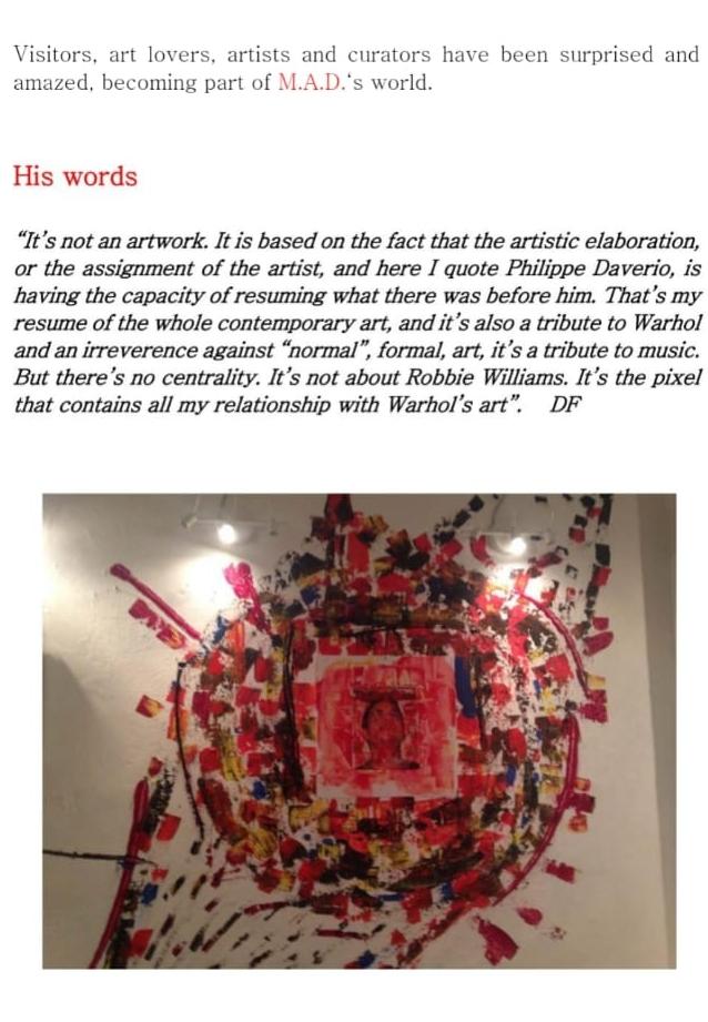 Visitatori, amanti dell'arte, artisti e curatori sono rimasti sorpresi e stupiti, entrando a far parte del mondo di M.A.D.S. Le sue parole "Non è un'opera d'arte. Si basa sul fatto che l'elaborazione artistica, o il compito dell'artista, e qui cito Philippe Daverio, sta avendo la capacità di riprendere ciò che c'era prima di lui. Questo è il mio curriculum del tutta l'arte contemporanea, ed è anche un tributo a Warhol e un'irriverenza contro l'arte "normale", formale, è un tributo alla musica. Ma non c'è centralità. Non riguarda Robbie Williams. È il pixel che contiene tutte le mie relazioni con Warhol arte". DF