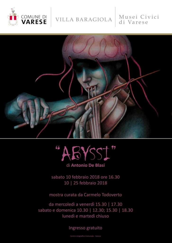 Sabato10 febbraio 2018 alle ore 16.30, presso lo “Spazio Espositivo Museale” di Villa Baragiola verrà inaugurata la personale “Abyssi” dell’artista saronnese Antonio De Blasi. La mostra, organizzata dal Comune di Varese rimarrà aperta fino a domenica 25 febbraio.