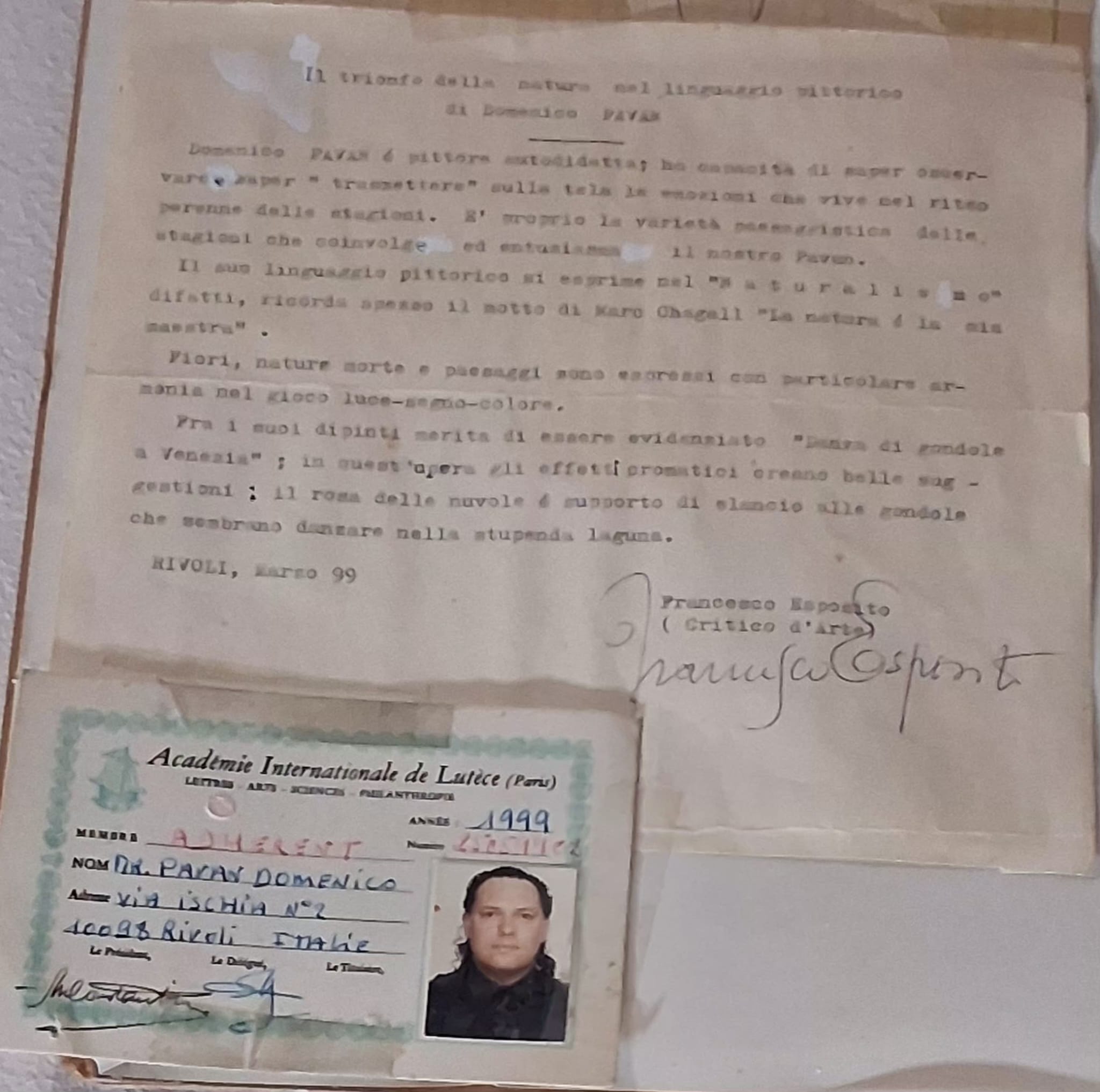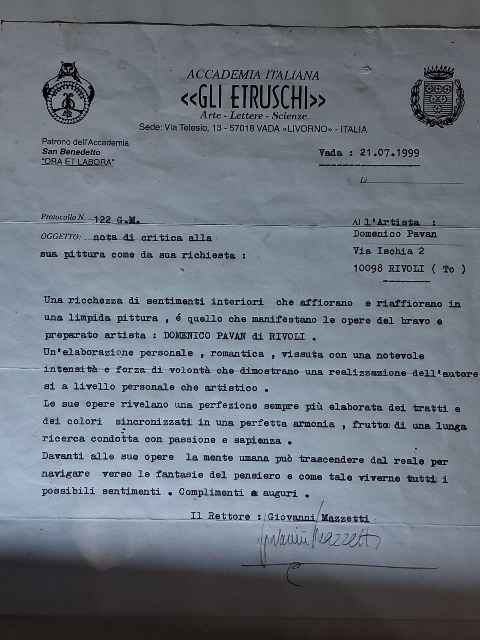 le opere del bravo e preparato artista Domenico Pavan di Rivoli (to) manifestano una ricchezza di sentimenti interiori che affiorano e riaffiorano in una limpida pittura, un'elaborazione personale, romantica vissuta con una notevole intensità e forza di volontà che dimostrano una realizzazione dell'autore sia a livello personale che artistico.le sue opere rivelano una perfezione sempre più elaborata dei tratti e dei colori sincronizzati da una perfetta armonia, frutto di una lunga ricerca condotta con passione e sapienza.
