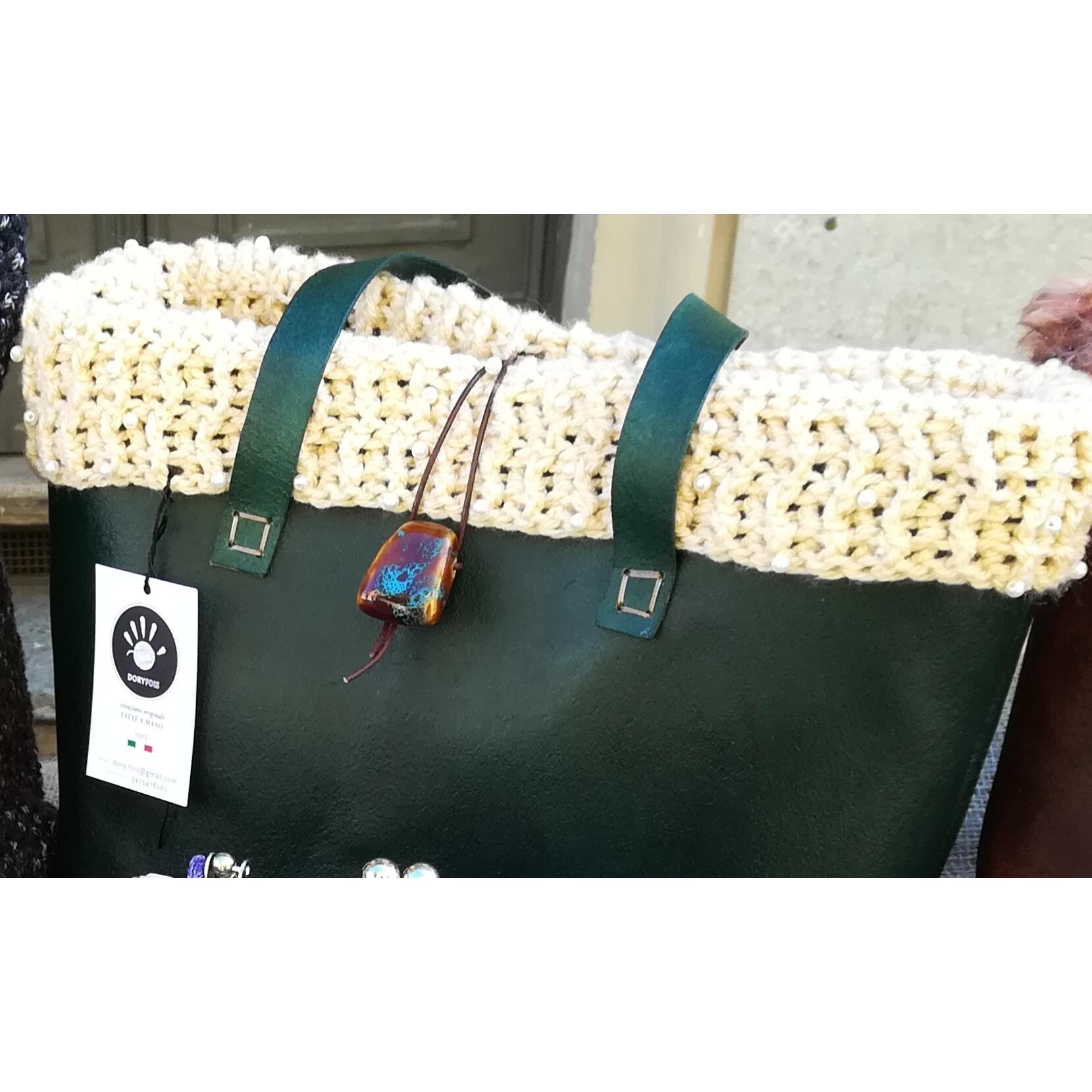 Borsa modello obag in cuoio, con bordo estraibile fatta a mano in pura lana all'uncinetto. Tasca interna e sacchetto in puro cotone richiudibile con lacci laterali e estraibile per un lavaggio in lavatrice a 30 gradi!!!!