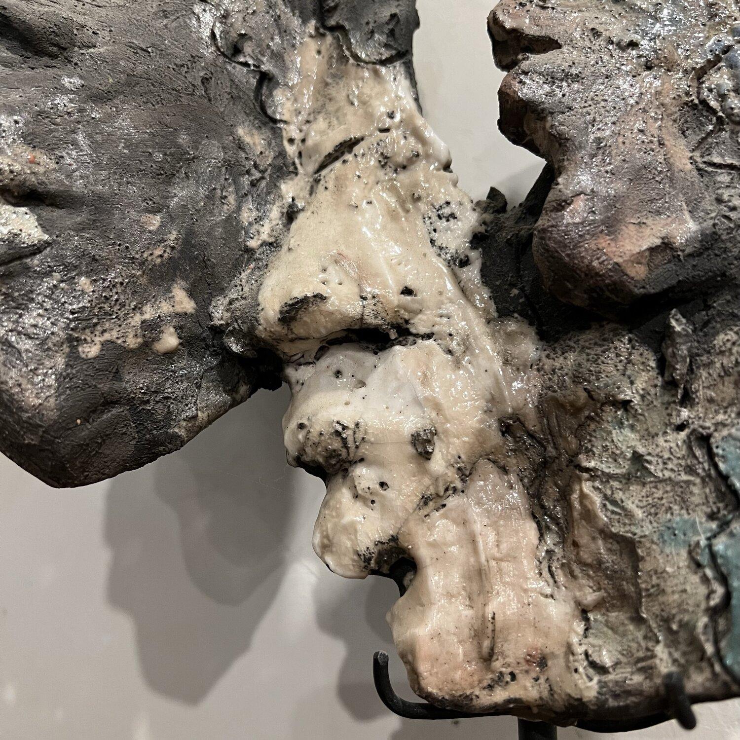"MASCHERE” è un'opera in ceramica Raku che affronta il tema delle maschere, tema ricorrente nell'opera dell'artista. A volte, le maschere rappresentano persone senza volto, persone che hanno bisogno di nascondersi dietro una maschera senza mostrare i loro veri sentimenti. L'opera invita lo spettatore a riflettere sulle diverse sfaccettature della persona umana e sulla necessità di mascherare la propria vera identità per proteggersi o per adattarsi alla società. La tecnica Raku utilizzata nell'opera crea un effetto unico e irripetibile, dando alla scultura un aspetto antico e misterioso.