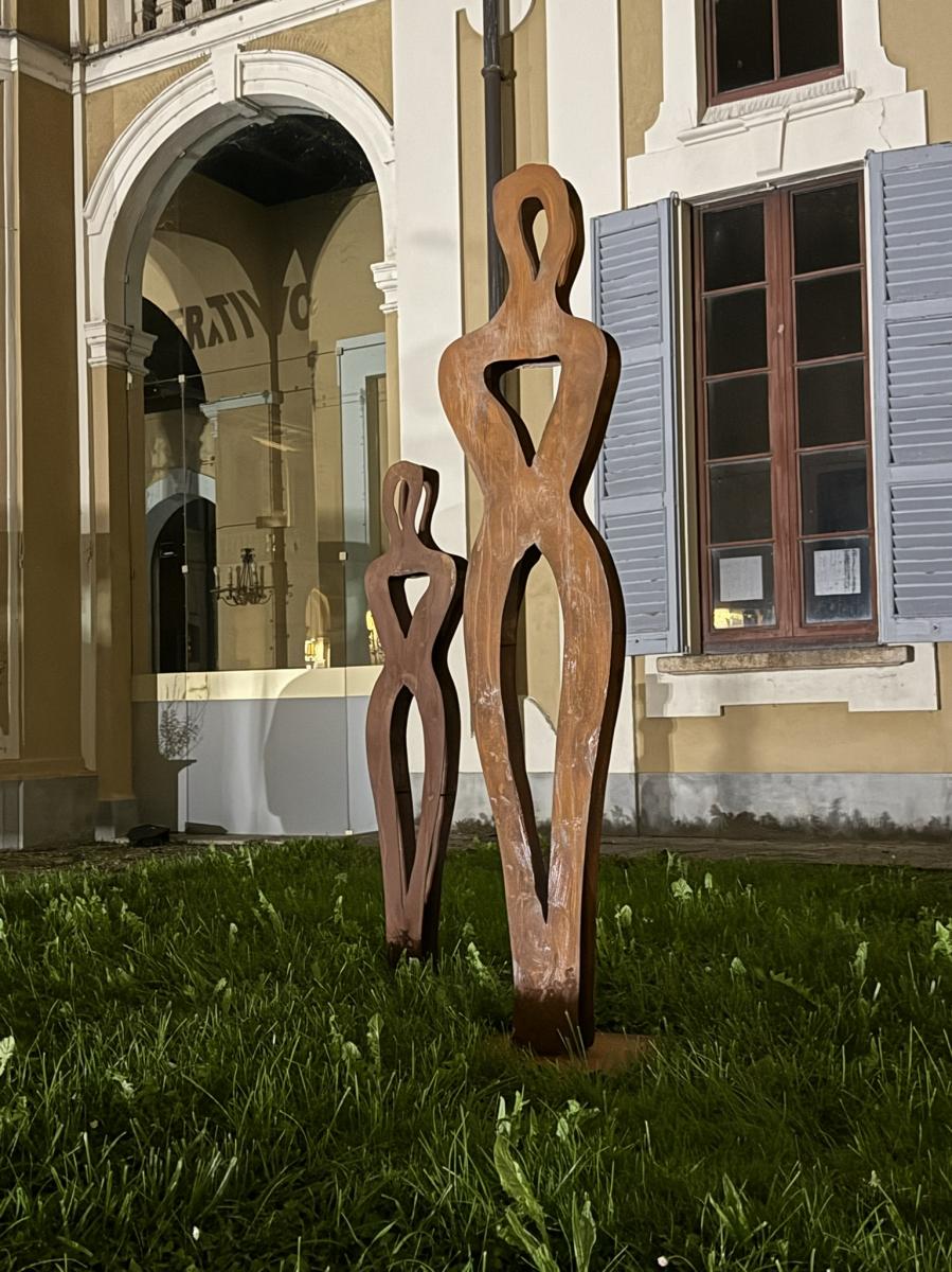 In questa coppia di sagome in ferro, Edi Mantovani sintetizza una riflessione profonda sulla natura umana e le dinamiche di potere. Le due figure, una più grande e una più piccola, si stagliano sul prato come simboli di una società in cui spesso vince chi alza la voce, chi si impone, chi prevarica. Ma il ferro è vuoto dentro: l’interno delle due forme è ritagliato, scavato, lasciando spazio allo sguardo.