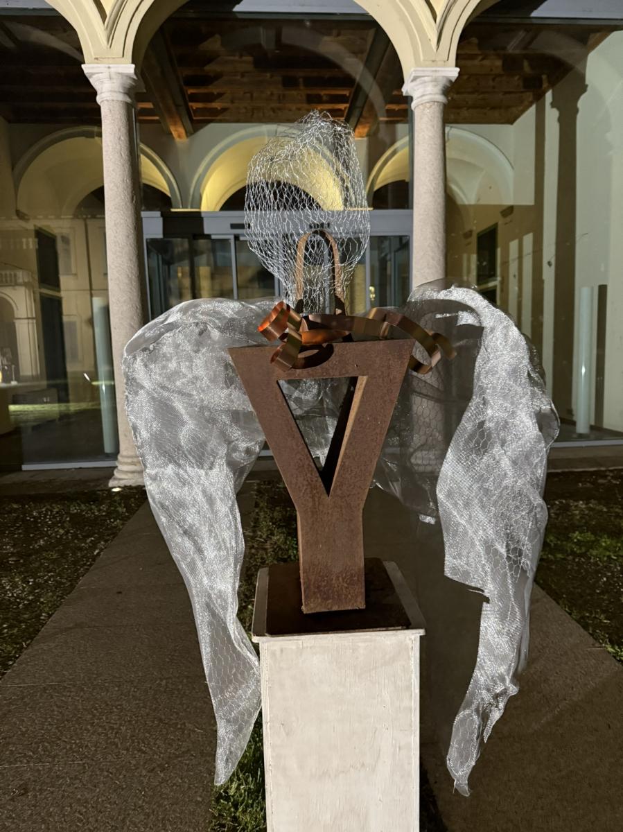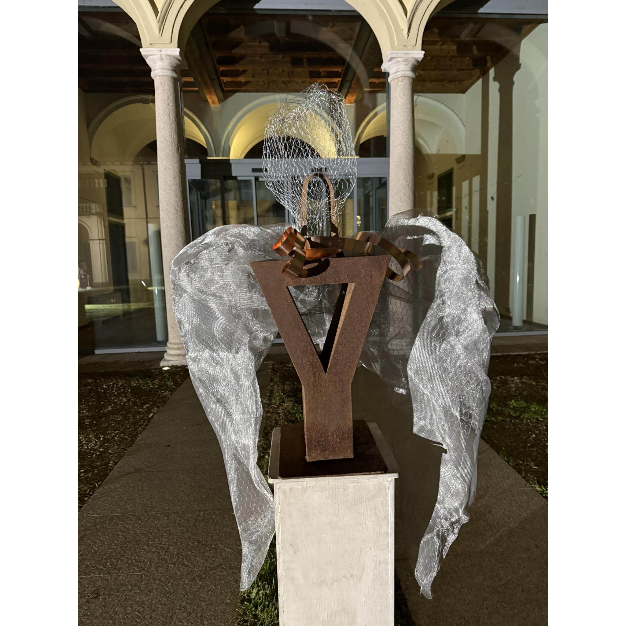 Un angelo emerge dal silenzio, composto da materiali diversi — ferro, rame, rete metallica — come a raccontare la complessità dell’essere umano: materia pesante e fragile, dura e sottile.