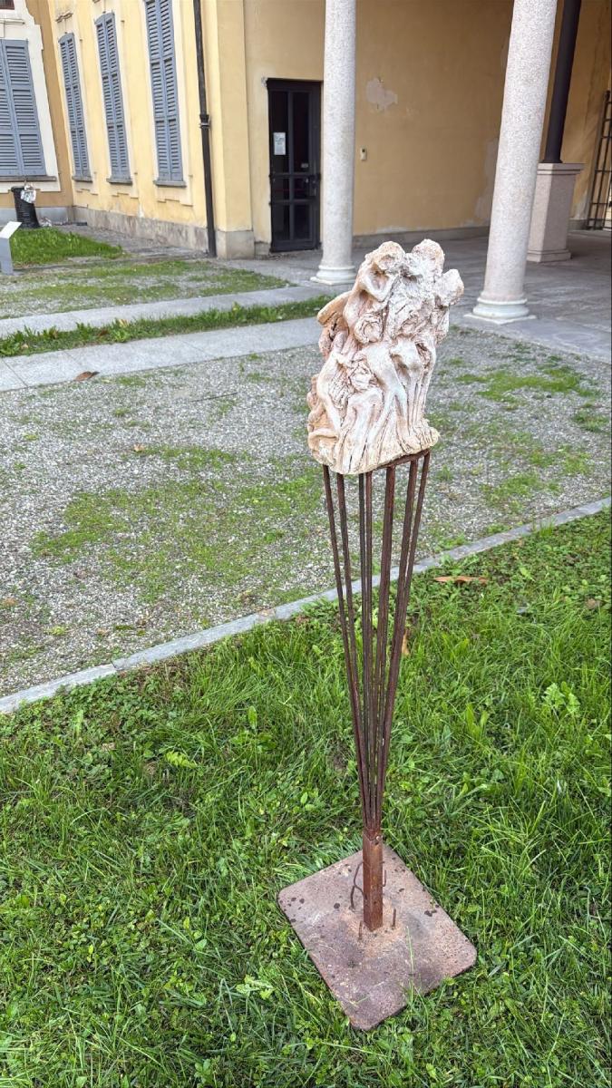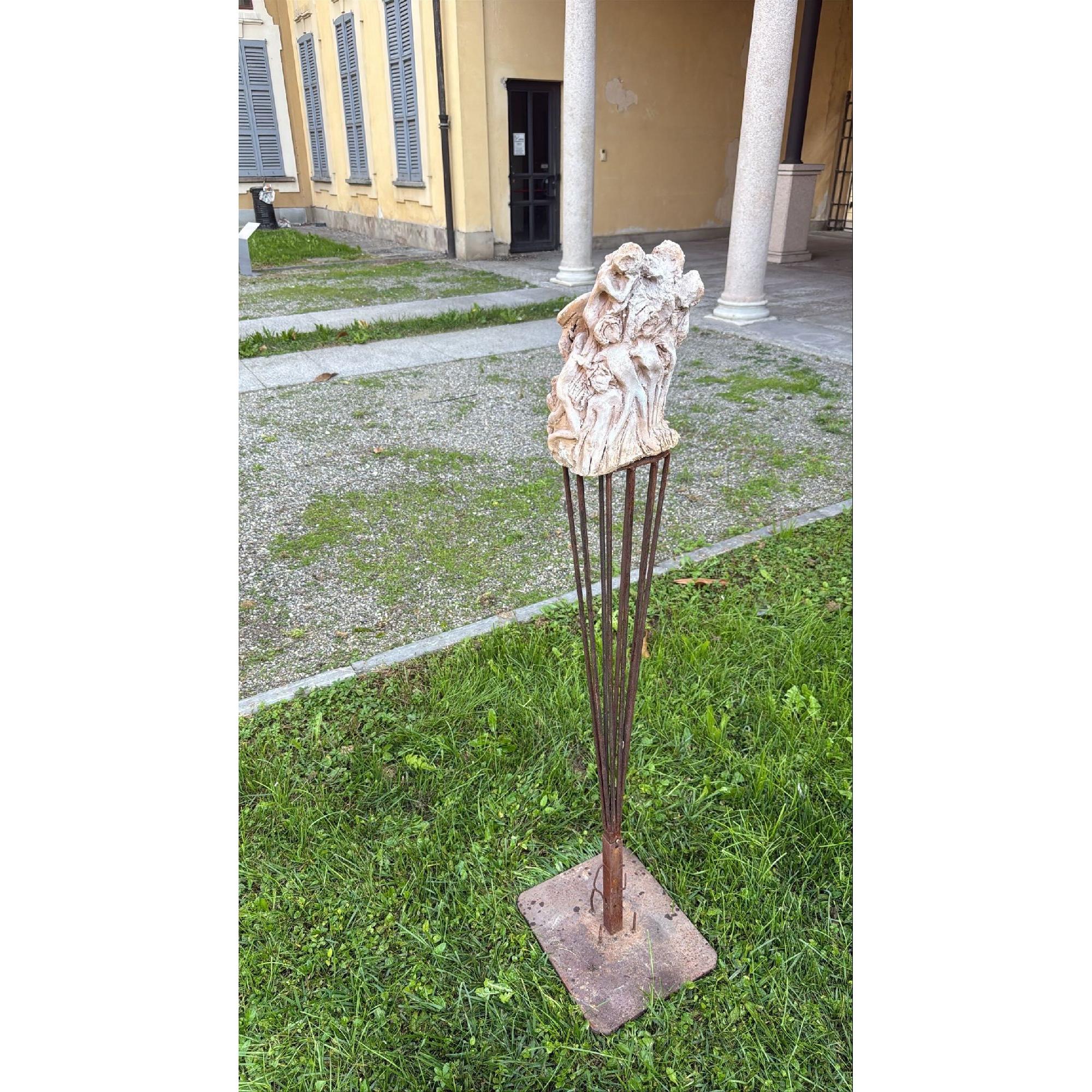 Una scultura in terracotta, montata su lunghi tondini di ferro arrugginiti, sembra librarsi e allo stesso tempo restare ancorata a terra.