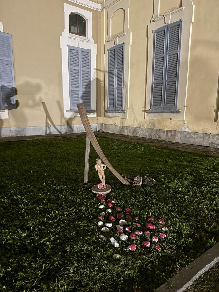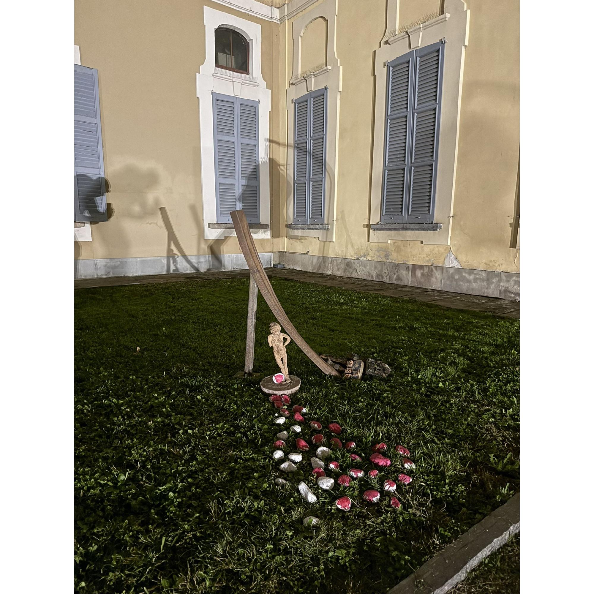 Sotto di esso, una piccola figura in ceramica — una bambina mutilata — sta ferma, fragile, nuda nella sua verità. Intorno a lei, decine di sassi dipinti di rosso e bianco: simboli di violenza, sangue, colpe.