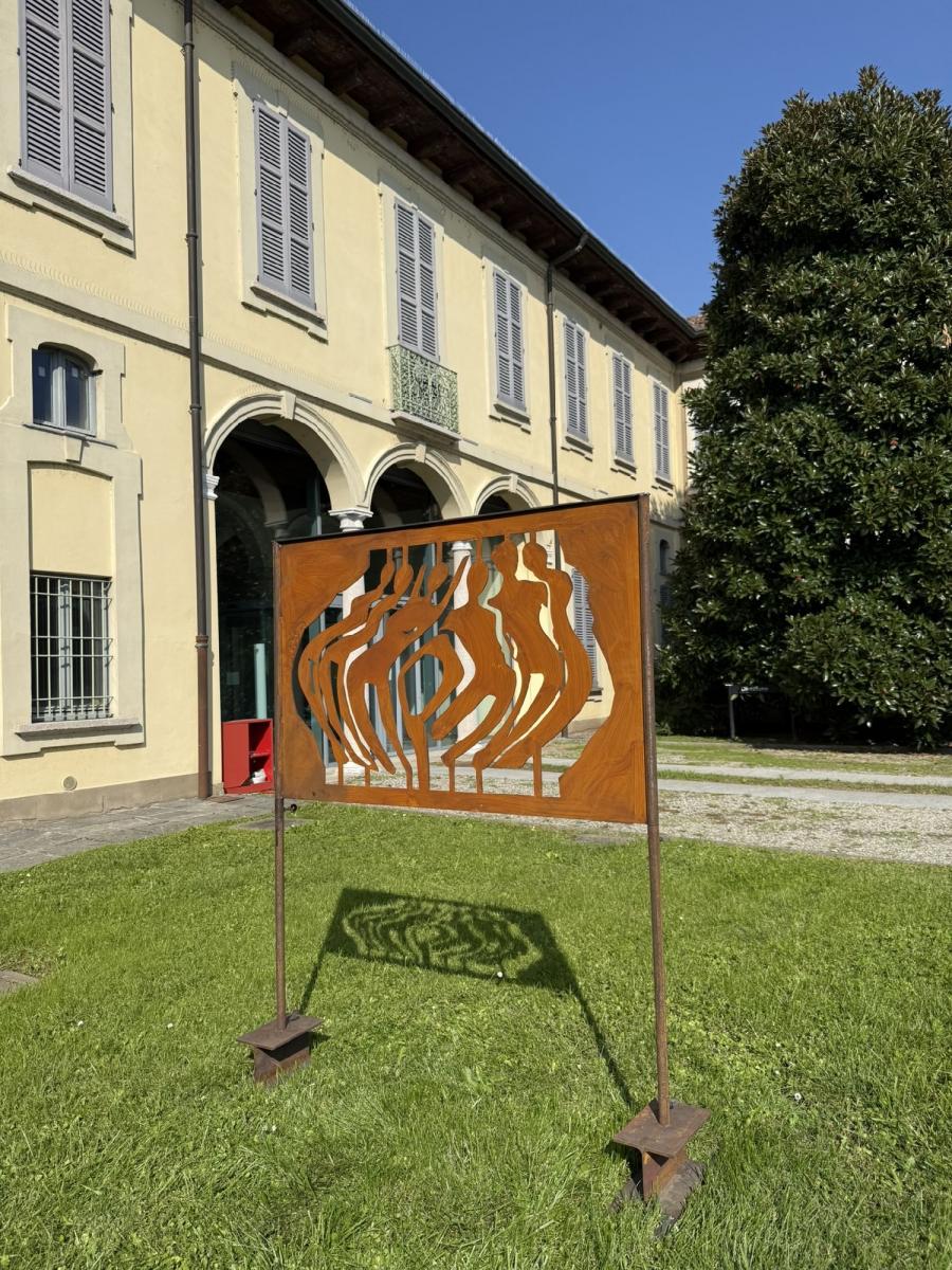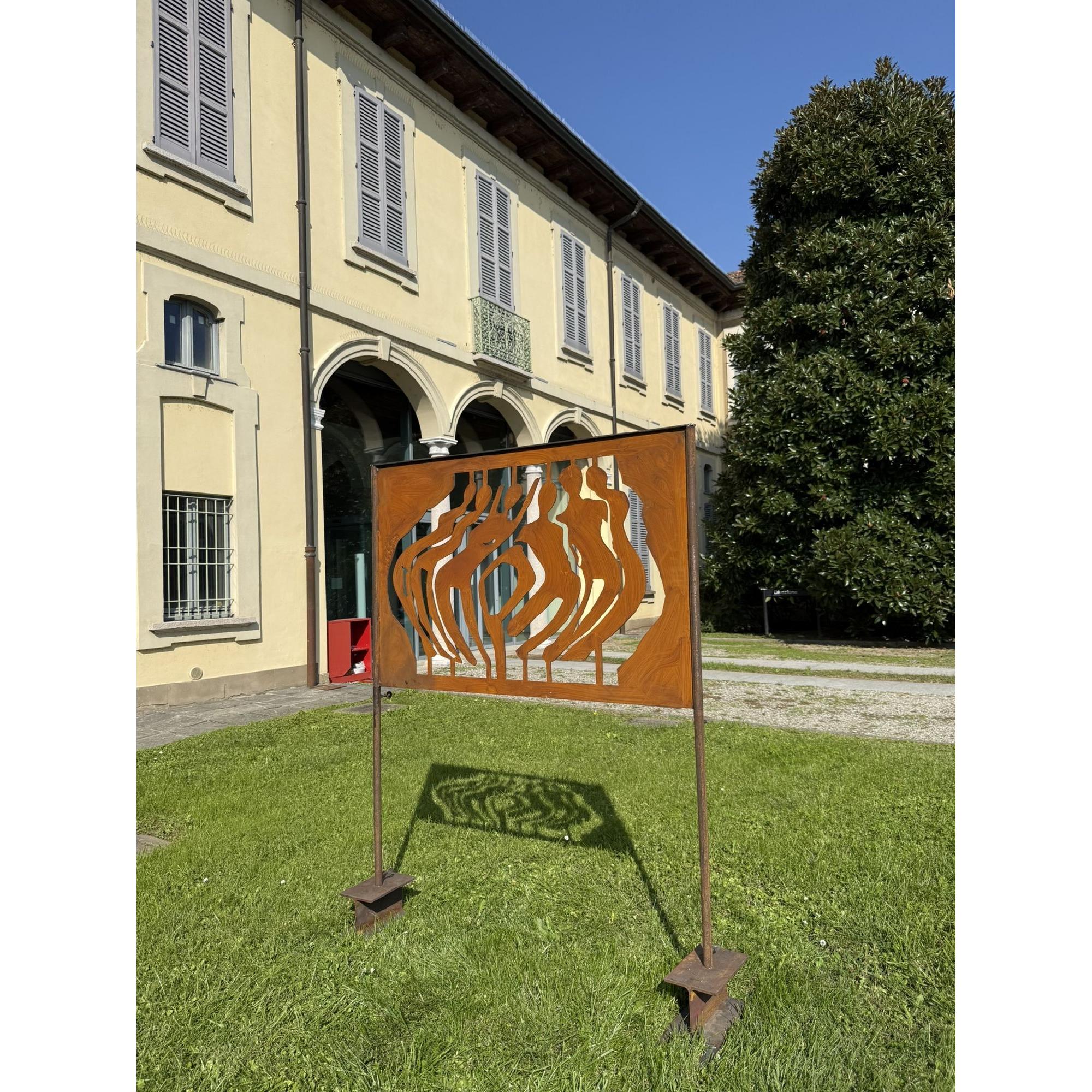Un pannello in corten, inciso come una tela, lascia filtrare la luce attraverso sagome stilizzate. Figure umane, slanciate, ripetute, che sembrano danzare — o fuggire.