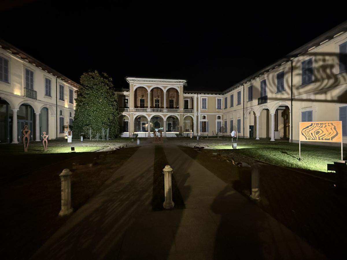Due lunghe strisce in acciaio corten si estendono a terra, una a sinistra, l’altra a destra, come fiumi che scorrono paralleli ma non si incontrano mai.