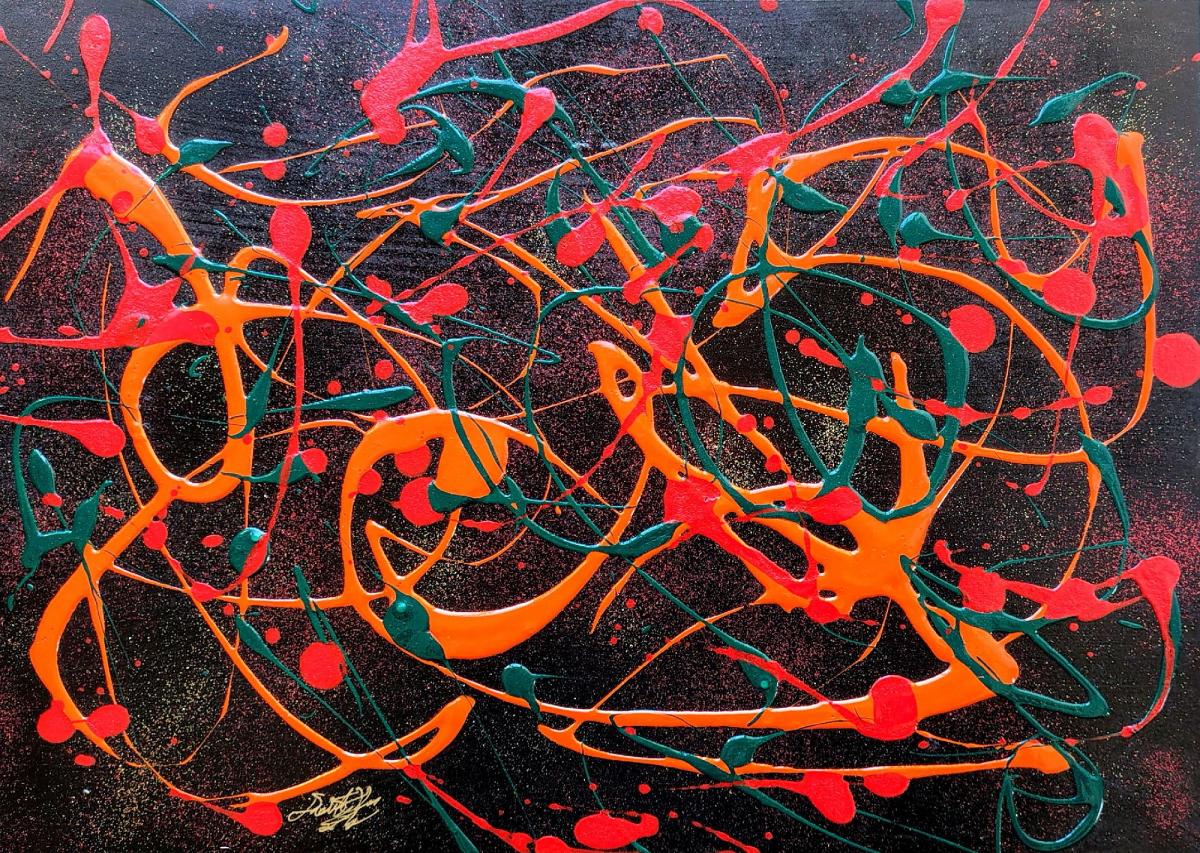 From a technical point of view, the artist uses a gestural dynamic reminiscent of action painting, but with evident compositional control. The lines do not disperse: they construct an internal balance, a symbolic network. Every drop finds its place. Every intersection generates visual tension.