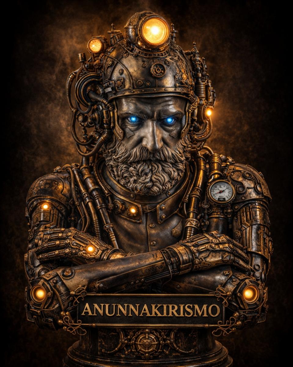 Within the emerging contemporary art scene, Anunnakirism has established itself as a movement capable of transcending the traditional boundaries of representation, introducing a vision in which humanity is no longer merely matter, but an evolved synthesis of consciousness, technology and divine origin. The work presented here perfectly embodies this tension: an ancient face, marked by time, which merges with complex mechanical structures, giving rise to a hybrid figure, suspended between past and future. This is not merely a matter of steampunk aesthetics or a cybernetic suggestion, but a visual manifesto: the human being as an entity in transformation.