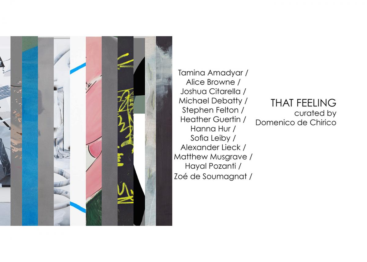 Affezionata a quel concetto di inscindibilità, That Feeling può essere considerata come una nuova e provocatoria condizione di apertura nei confronti delle più diverse forme di espressione, la cui bellezza non sarebbe altro che ‘l’adeguatezza dell’espressione’ nelle forme, nei segni e nei colori, i.e.: gli spazi pittorici aperti, nudi e astratti di Tamina Amadyar; il colore, la consistenza e il volume immersi in una dimensione di mondanità emotiva per Alice Browne; le superfici incontaminate e magicamente digitalizzate di Joshua Citarella; gli spazi per visioni alternative di Michael Debatty; le linee arrotondate, i colori tenui e le forme estremamente semplificate per Stephen Felton; gli spazi astratti e i caratteri, prima inventati poi narrati, per Heather Guertin; le curve e le tracce che emergono fluidamente dalle tele di Hanna Hur, mediante l’utilizzo di strumenti di disegno e materiali tradizionali; i segni e gli impulsi legati alla grafologia e alla psicometria che si esibiscono in coreografie improvvisate nei dipinti di Sofia Leiby; le gesta emotive e interrotte nei quadri astratti di Alexander Lieck; l’interesse di Matthew Musgrave nel pensare attraverso la pittura, considerandone la natura mutevole ed espansiva; un alfabeto inventato, algoritmi e figure ibride nei dipinti geometrici di Hayal Pozanti; le meditazioni intime e le distorsioni sensuali, tagliate, sbiadite, sottolineate e fanta- sticate sulle tele di Zoé de Soumagnat.