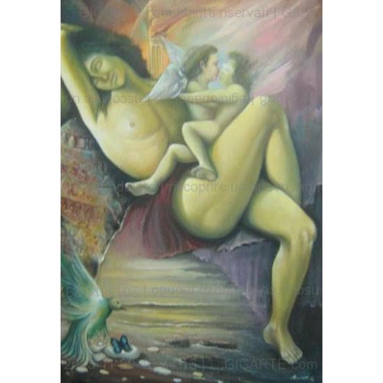 trovarsi dinnanzi all'opera è come trovarsi in un poema d'amore dove il sogno galoppa tra emozioni e segni trasparenti le figure sono riflessione del pensiero,pur partendo da elementi d'immaginazione si sviluppano notevolmente con un' ideazione intellettuale