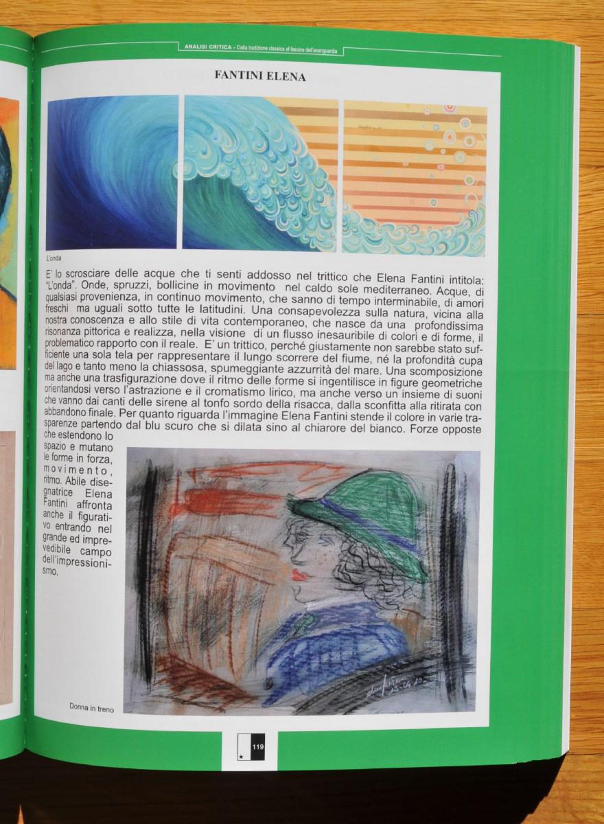 E' lo scrosciare delle acque che ti senti addosso nel trittico che Elena Fantini intitola: "L'onda". Onde, spruzzi, bollicine in movimento nel caldo sole mediterraneo. Acque, di qualsiasi provenienza, in continuo movimento, che sanno di tempo interminabile, di amori freschi ma uguali sotto tutte le latitudini. Una consapevolezza sulla natura, vicina alla nostra conoscenza e allo stile di vita contemporaneo, che nasce da una profondissima risonanza pittorica e realizza, nella visione di un flusso inesauribile di colori e di forme, il problematico rapporto con il reale. E' un trittico, perché giustamente non sarebbe stato sufficiente una sola tela per rappresentare il lungo scorrere del fiume, né la profondità cupa del lago e tanto meno la chiassosa, spumeggiante azzurrità del mare. Una scomposizione ma anche una trasfigurazione dove il ritmo delle forme si ingentilisce in figure geometriche orientandosi verso l'astrazione e il cromatismo lirico, ma anche verso un insieme di suoni che vanno dai canti delle sirene al tonfo sordo della risacca, dalla sconfitta alla ritirata con abbandono finale. Per quanto riguarda l'immagine Elena Fantini stende il colore in varie trasparenze partendo dal blu scuro che si dilata sino al chiarore del bianco. Forze opposte che estendono lo spazio e mutano le forme in forza, movimento, ritmo. Abile disegnatrice Elena Fantini affronta anche il figurativo entrando nel grande ed imprevedibile campo dell'impressionismo.