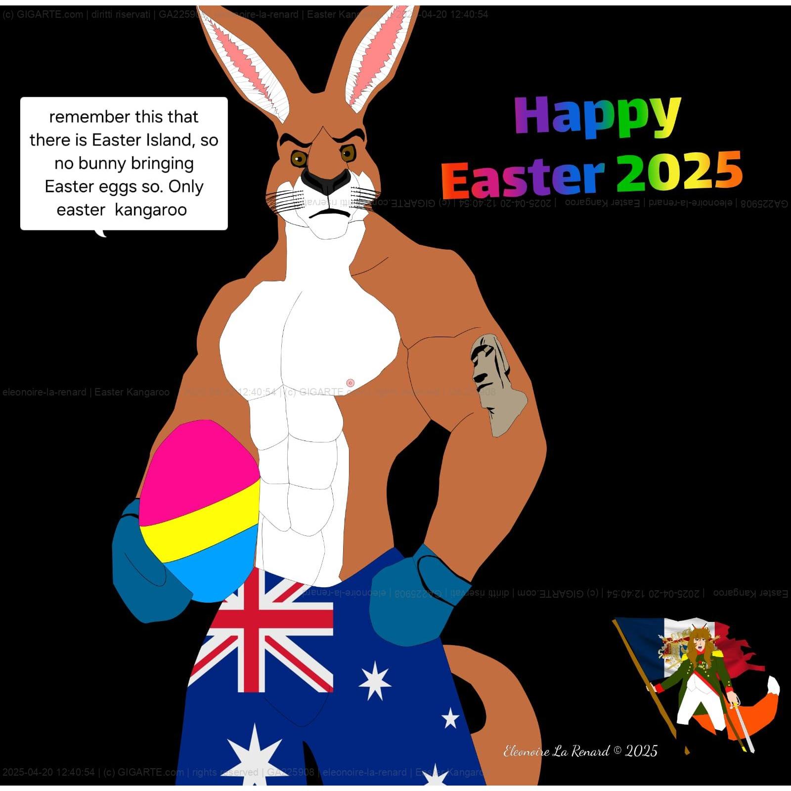 During Easter, the rabbit is the main character, but this year I was inspired by something a bit different—a kangaroo carrying an Easter egg. The egg features the colors of the pansexual flag, symbolizing inclusivity and diversity. The kangaroo is dressed in men's boxers with the Australian flag pattern, paying homage to its native habitat.