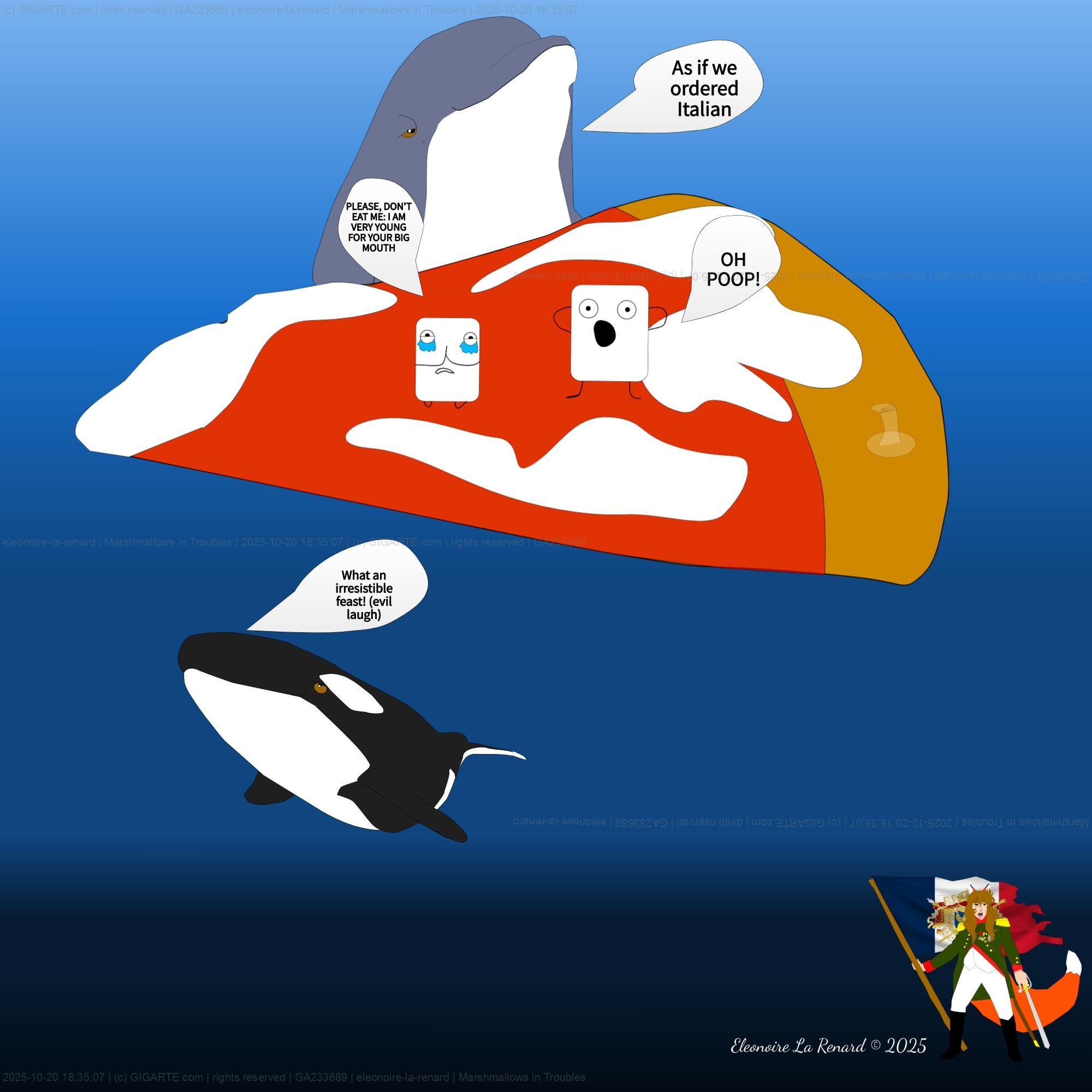 Two marshmallows were having a vacation at the seaside ???? and they went too far, they found themselves in the ocean with a hungry dolphin ???? and a killer whale who wanted to eat the inflatable pizza.