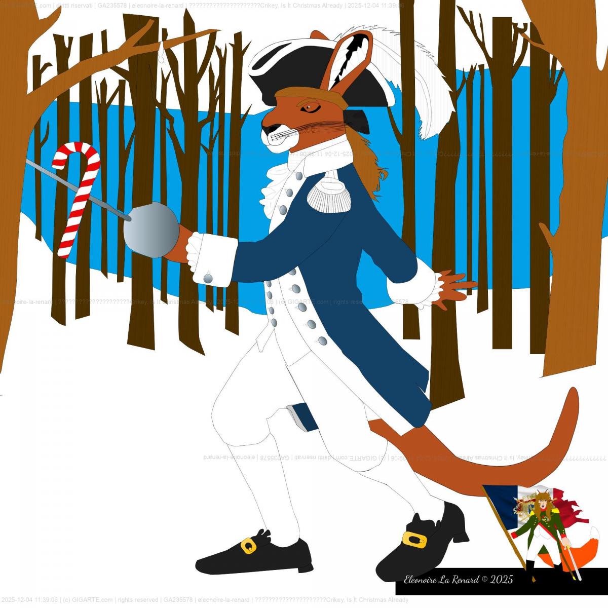 A kangaroo of superior rank (notice the blue uniform and white epaulets?) ventures into the forest during the American Revolution, and suddenly it starts snowing. The kangaroo looks around with a sharp, circular gaze and exclaims in an Australian accent, <<Crikey, is it Christmas already?>>