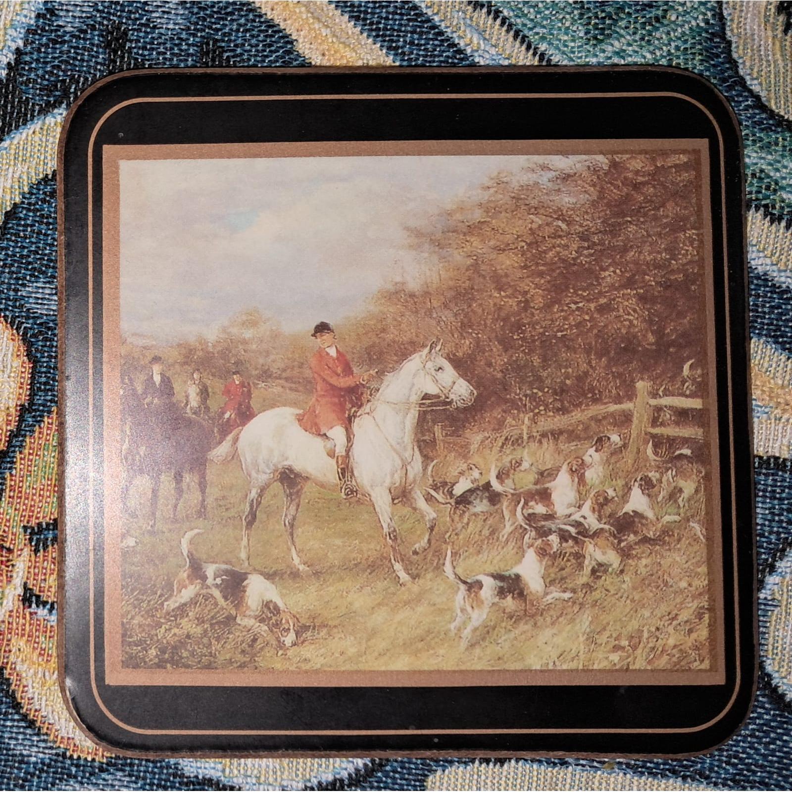 This artwork depicts a traditional English fox hunt set in a rural landscape. In the foreground, a rider dressed in a red hunting coat and black riding hat sits atop a white horse, surrounded by a lively pack of hounds actively searching through the grass. Behind them, other riders in formal hunting attire follow along the trail, framed by wooden fences and dense trees. The scene captures the energy, ritual, and social pageantry of 19th-century fox hunting, emphasizing the harmony between horse, rider, and hound within a pastoral setting. The image is bordered in black and brown and appears printed on a decorative coaster.