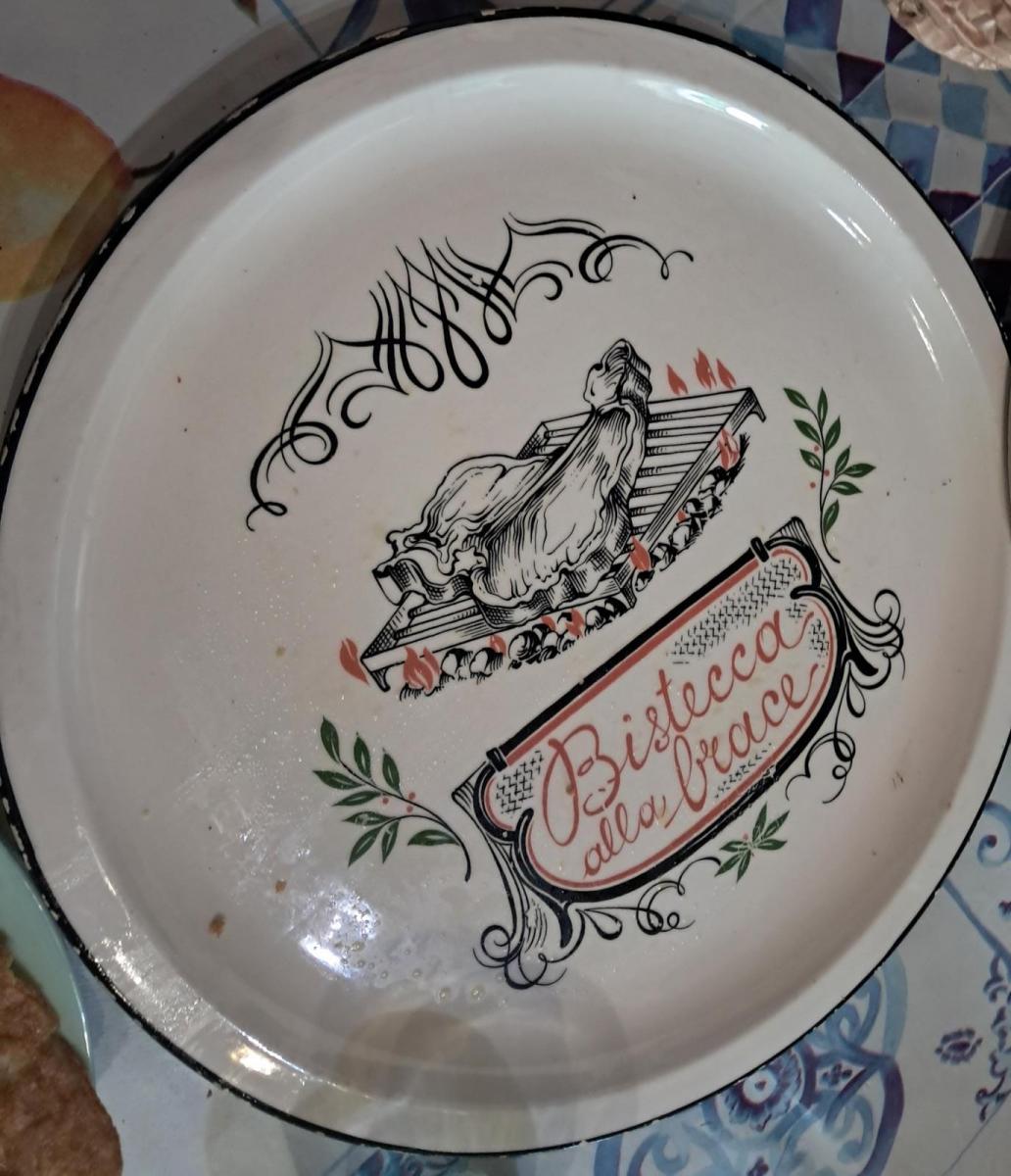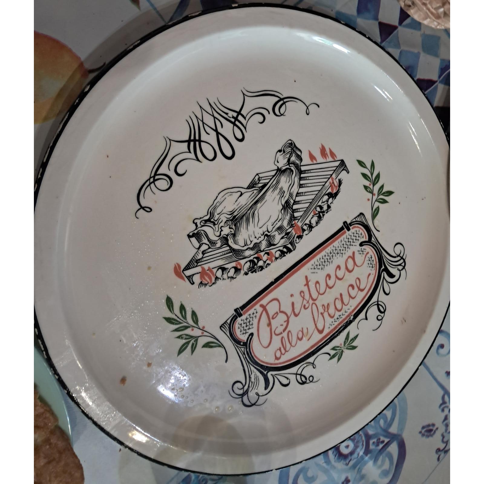 This is a charming Italian serving plate, likely made of ceramic or enameled metal. It features beautiful calligraphic art and an illustration of a steak on a grill. The red cursive text reads "Bistecca alla brace", which translates to "Grilled Steak" in English. It’s a classic piece of Italian kitchenware often found in traditional trattorias or rustic homes.