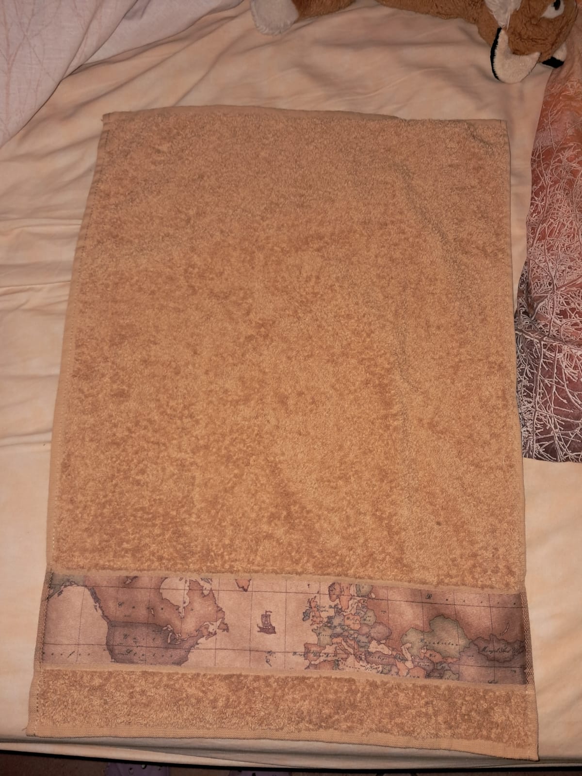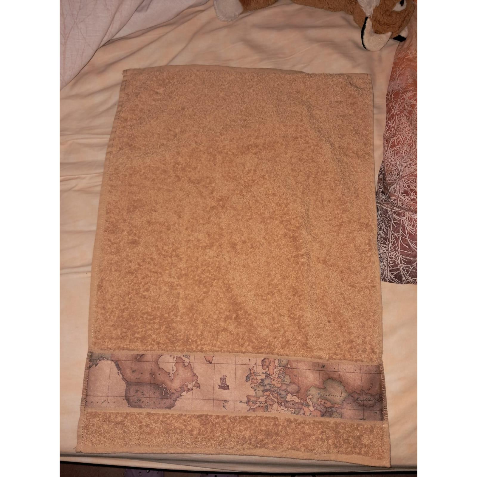 Add a touch of adventure to your home decor with this sandy-tan terry cloth towel. The highlight of this piece is the vintage-style world map border along the bottom, featuring a classic parchment-colored aesthetic with illustrations of continents and a traditional sailing ship. The soft, absorbent texture makes it as functional as it is stylish—ideal for a guest bathroom, kitchen, or as a gift for someone with a passion for travel.