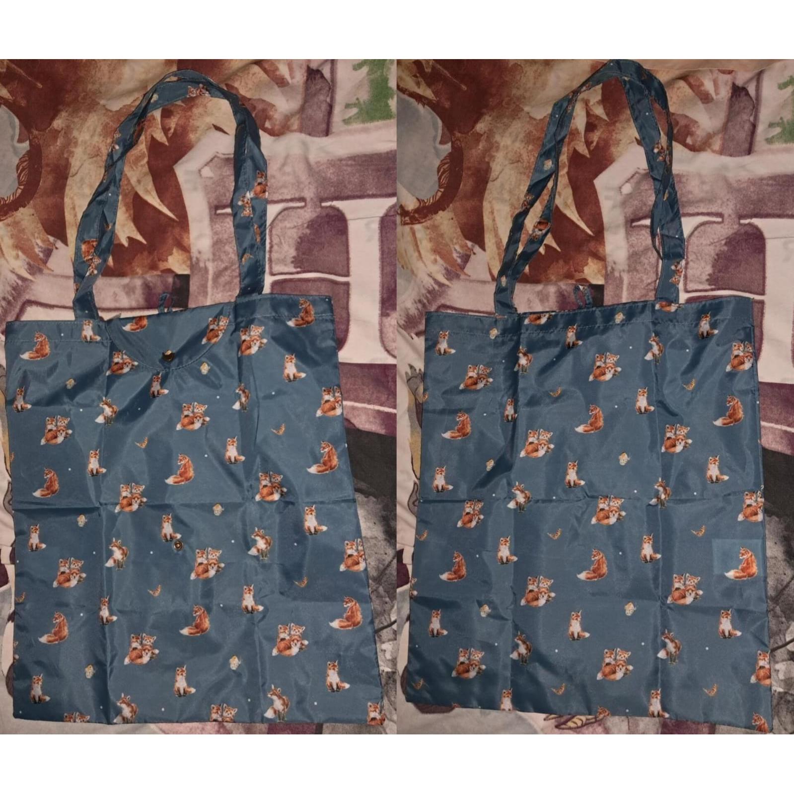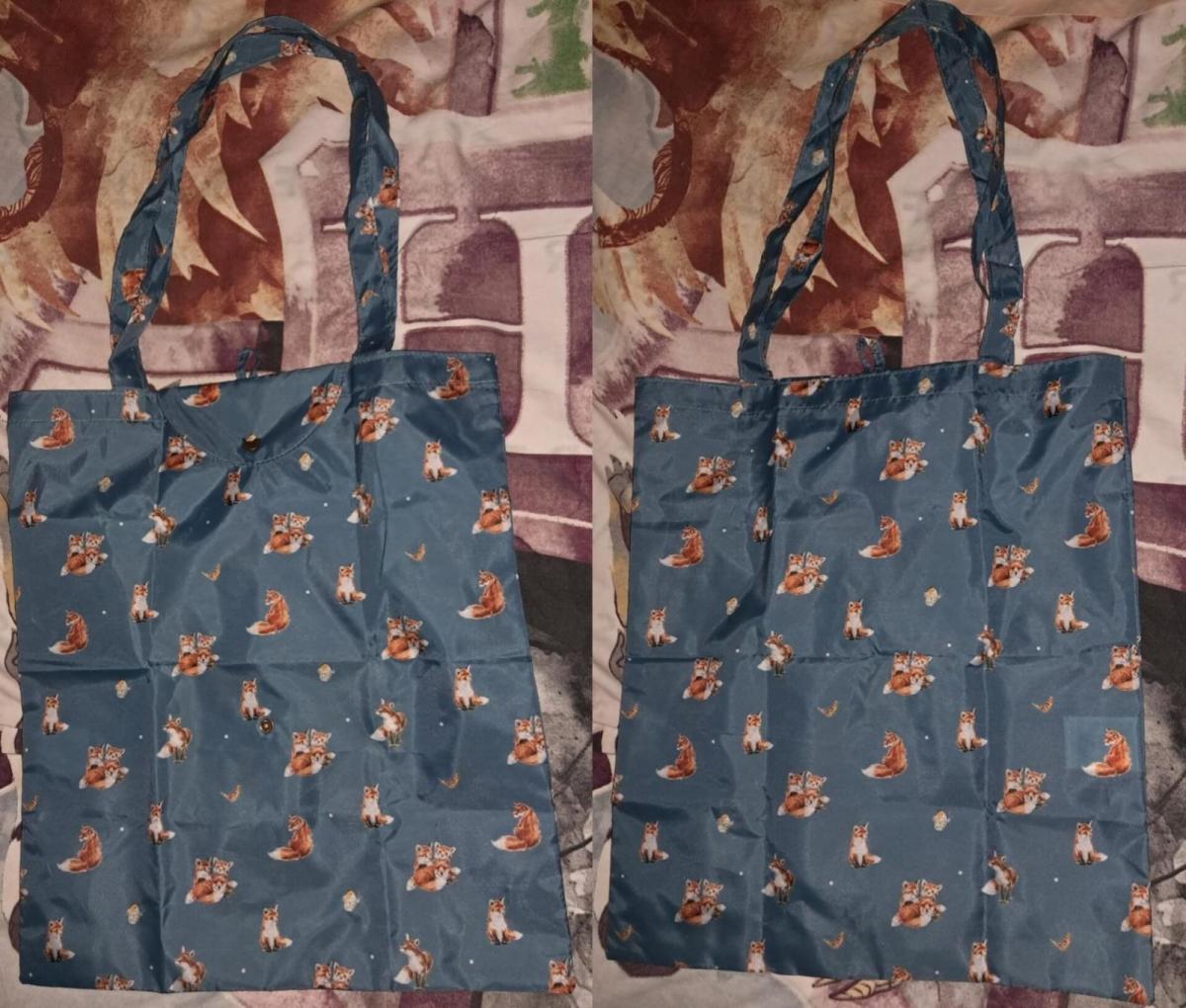 ?This charming and practical tote bag features a delightful all-over print of red foxes in various playful poses against a deep teal or slate blue background. Made from a lightweight, durable synthetic material (likely polyester or nylon), it is designed to be easily folded and secured with its built-in snap button flap for convenient storage in a purse or car. Perfect for nature lovers who want to add a touch of personality to their daily errands.