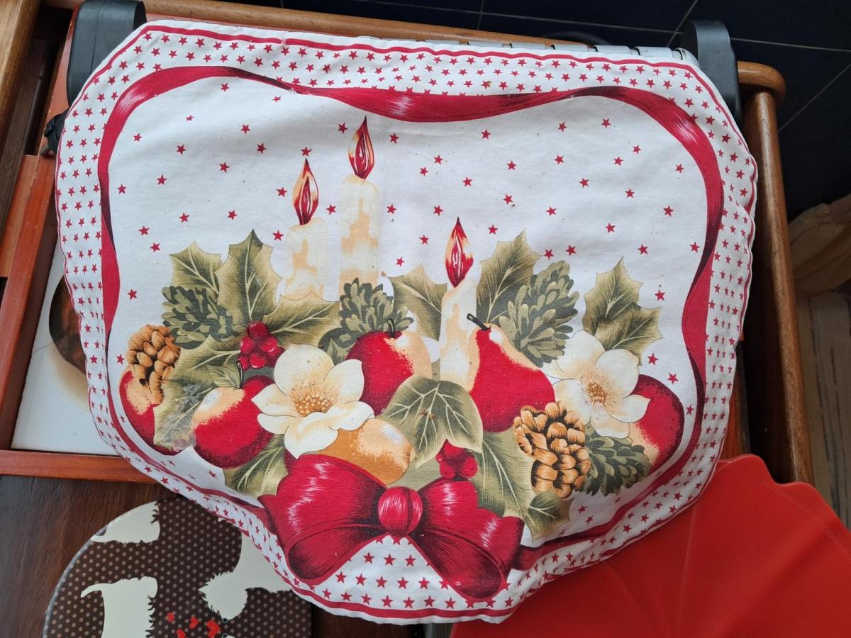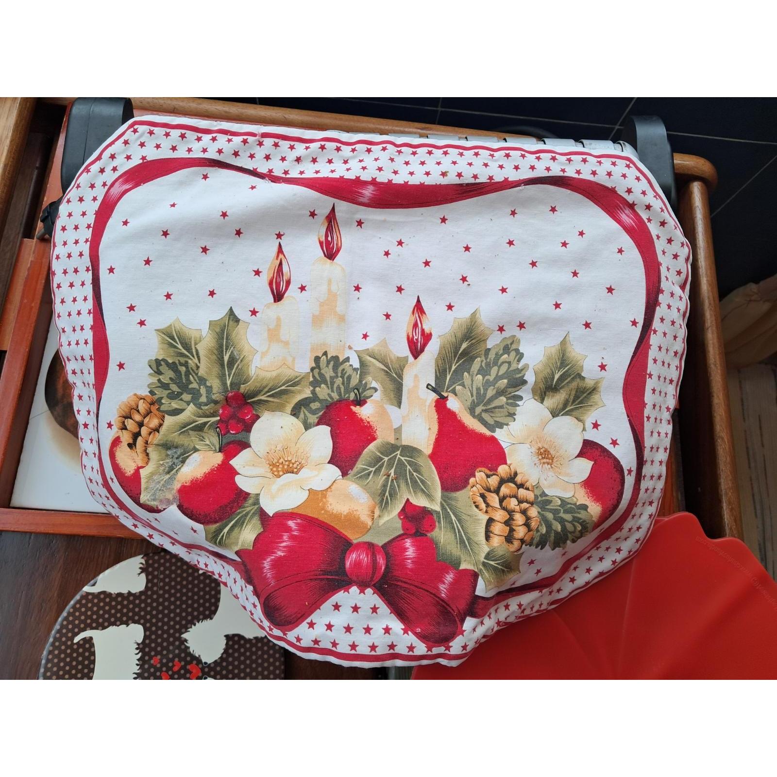 A decorative padded fabric cover (possibly for an appliance) featuring a festive centerpiece of three lit candles, red apples, pinecones, and white flowers, framed by a red star-patterned border and a large red bow.
