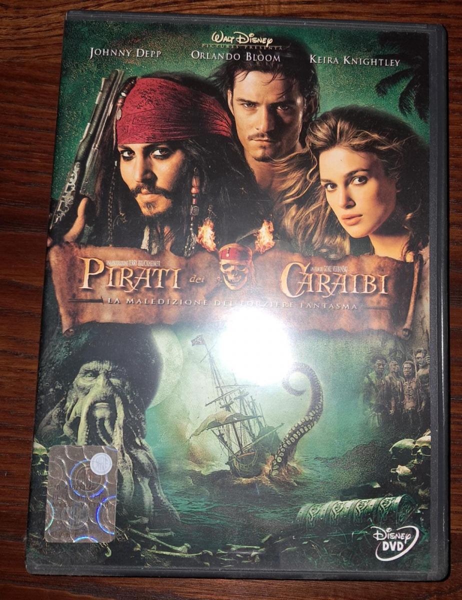 The Italian edition DVD cover for the Disney movie "Pirati dei Caraibi: La Maledizione del Forziere Fantasma", featuring lead actors Johnny Depp, Orlando Bloom, and Keira Knightley.