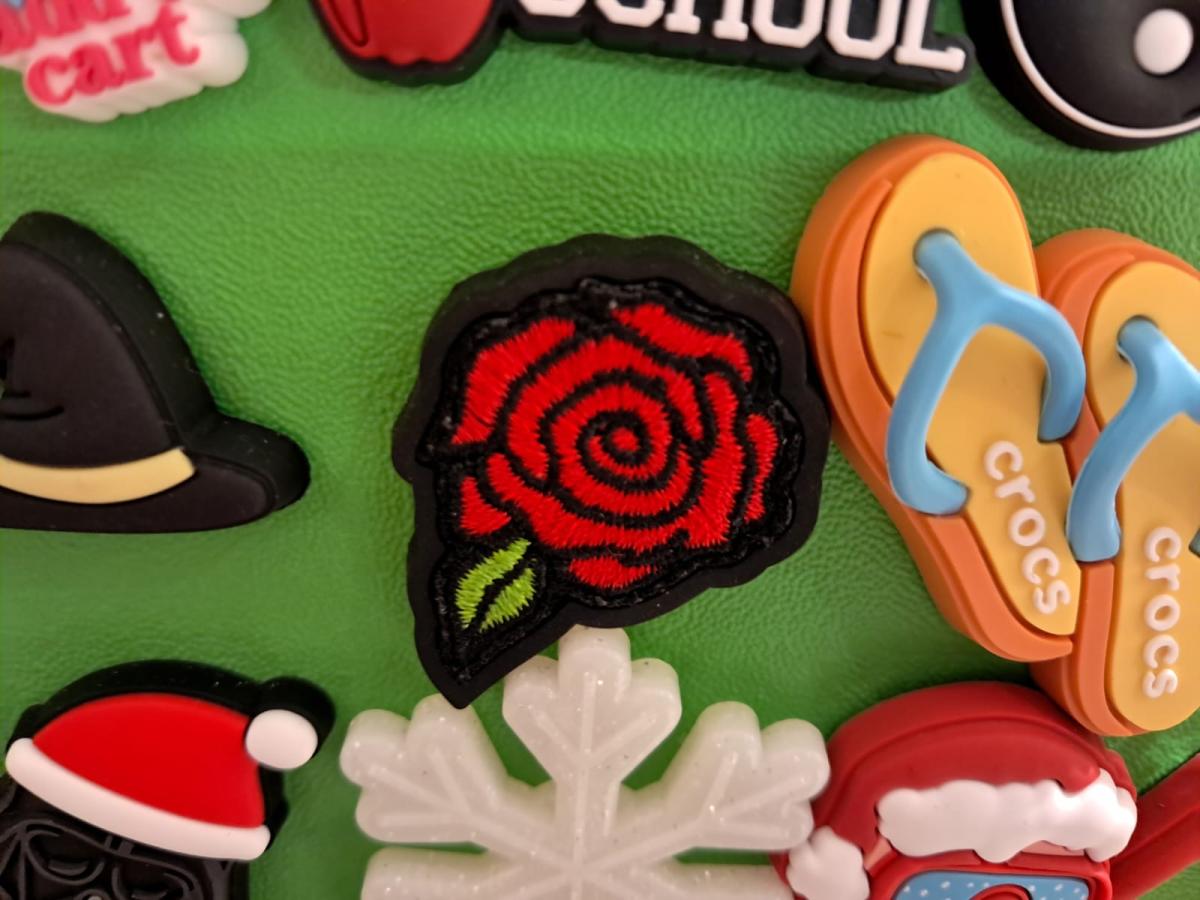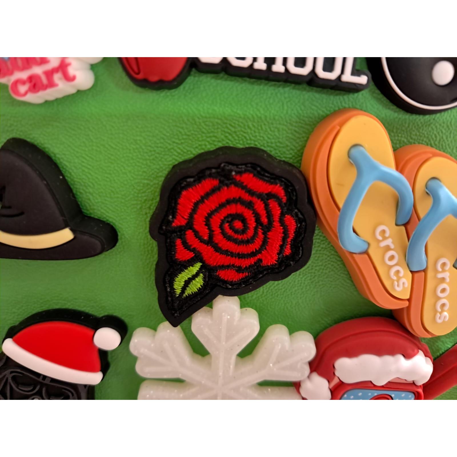A colorful assortment of Crocs charms including a red rose, flip?flops, a snowflake, a hat, a Santa cap, and partial themed icons.
