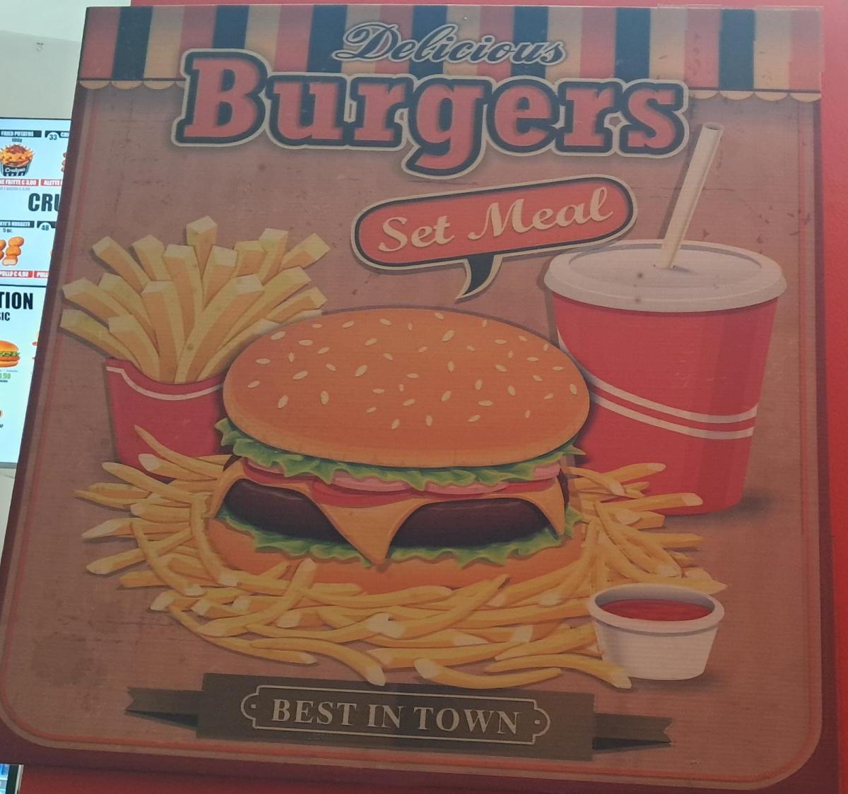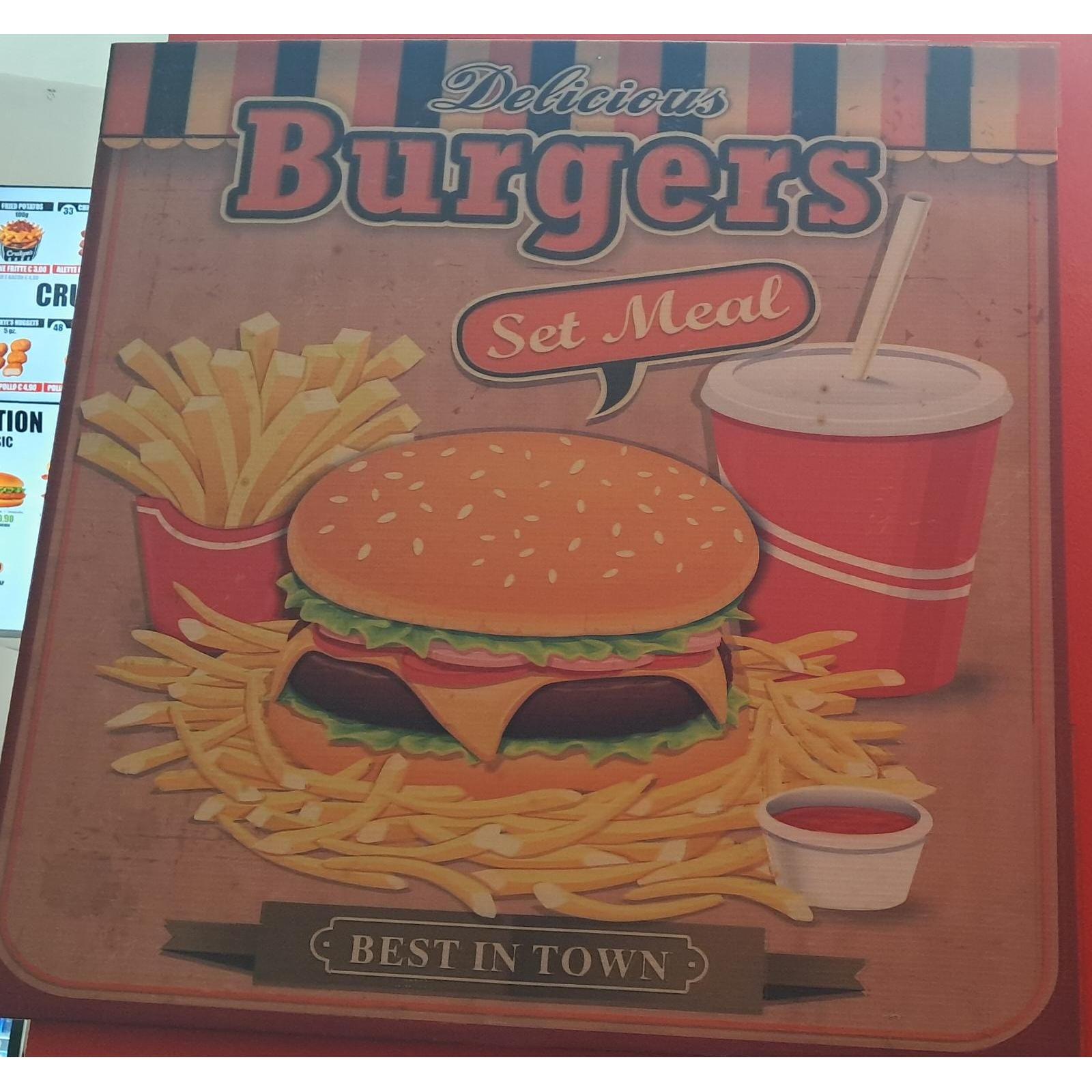 ?Item: A decorative wall plaque or poster featuring a vintage diner-style advertisement.?Visuals: The artwork depicts a classic "Set Meal" consisting of a large sesame seed cheeseburger, a red carton of French fries, a red soda cup with a straw, and a small side of ketchup. The burger is shown resting on a generous bed of loose fries.?Key Typography: * The top features the words "Delicious BURGERS" in a bold, retro font.?A stylized speech bubble contains the text "Set Meal".?A dark banner at the bottom reads "BEST IN TOWN".?Style: The poster has a weathered, "shabby-chic" finish with muted tones and artificial stains to give it an antique, 1950s American appearance.