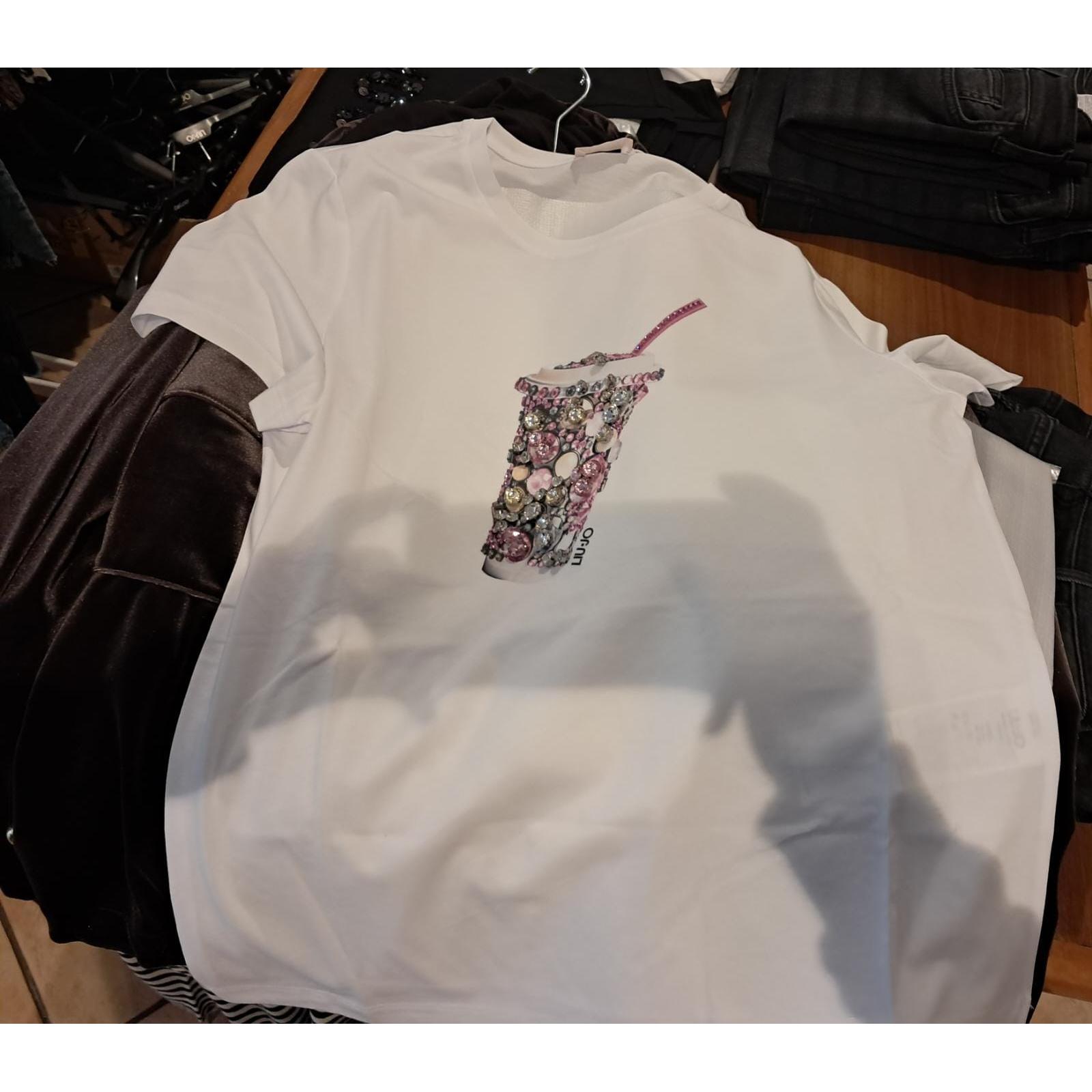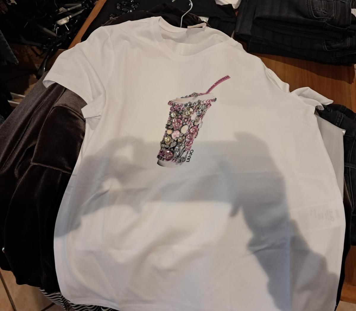 white graphic t shirt with a jeweled beverage cup design made of pink and silver crystals.Personal, non-commercial, non-advertising use only.