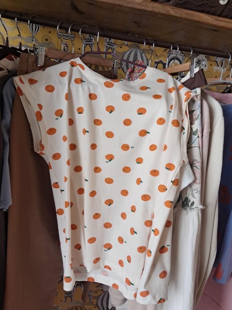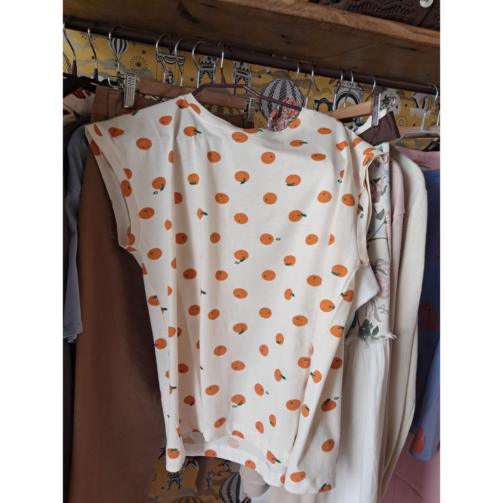 off white t shirt with an all over orange fruit pattern and small green leaves.Personal, non-commercial, non-advertising use only.
