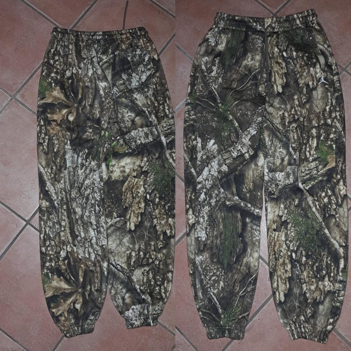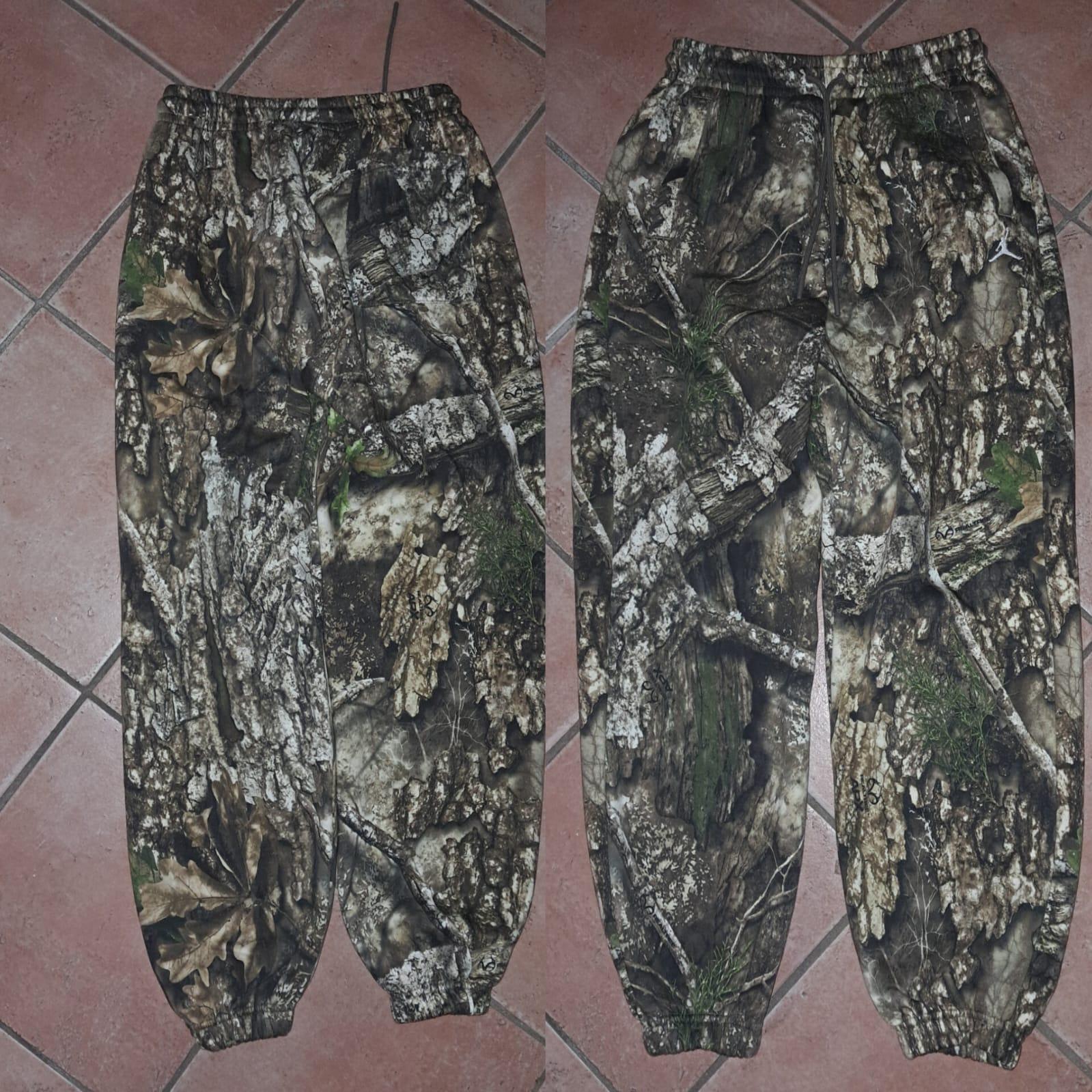Item: A pair of joggers/sweatpants featuring a high-definition "RealTree" or wood-effect camouflage pattern.