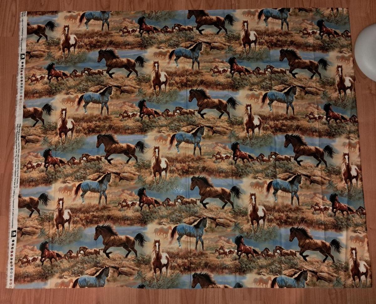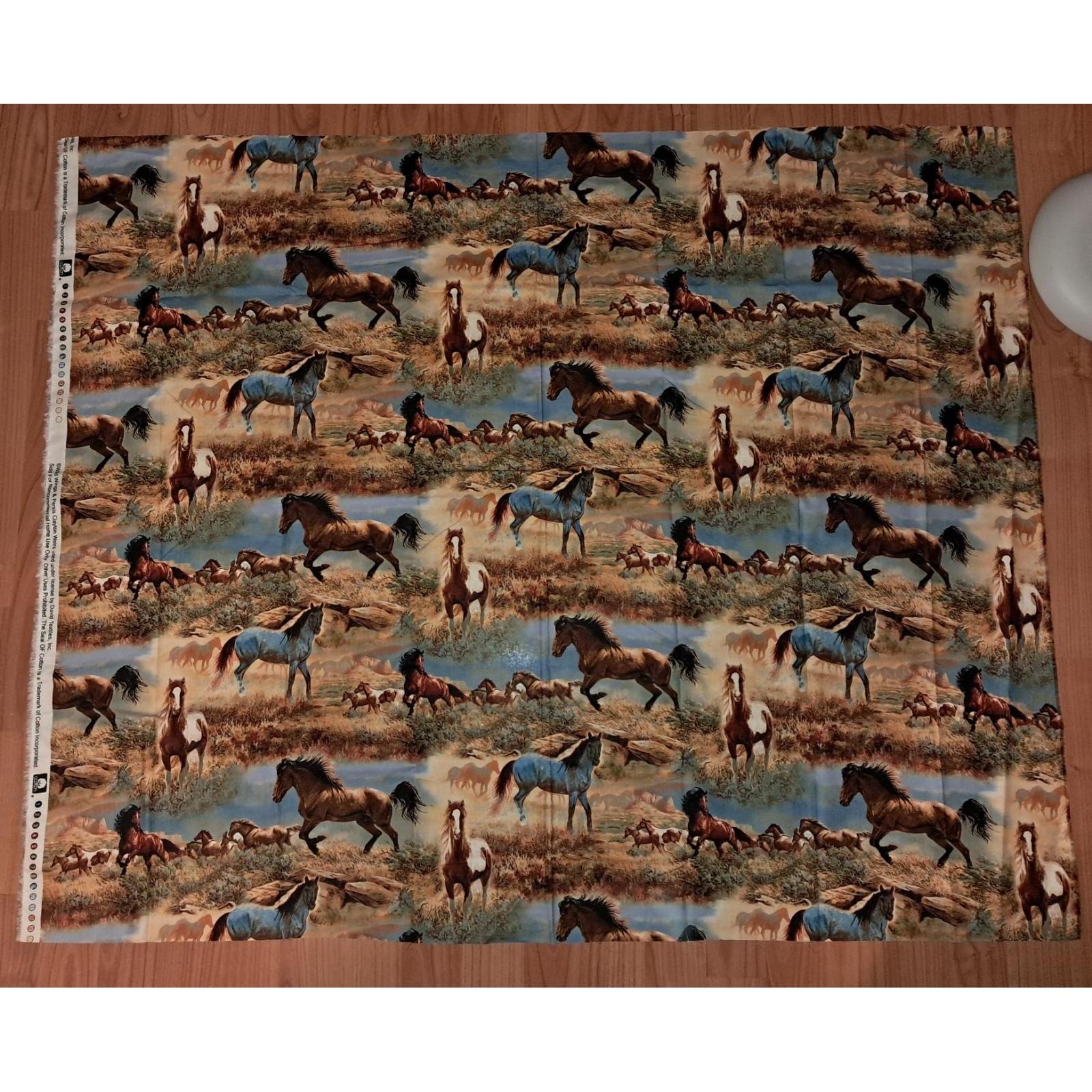 This textile features a high-quality, repeating panoramic print of wild horses in a naturalistic western setting.
