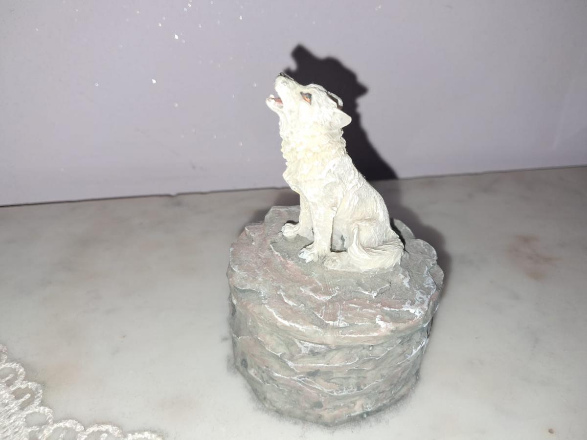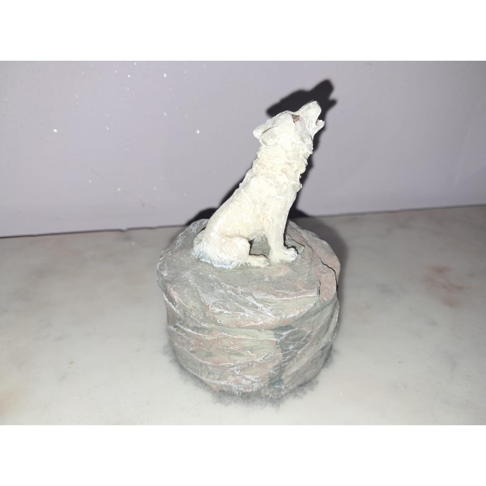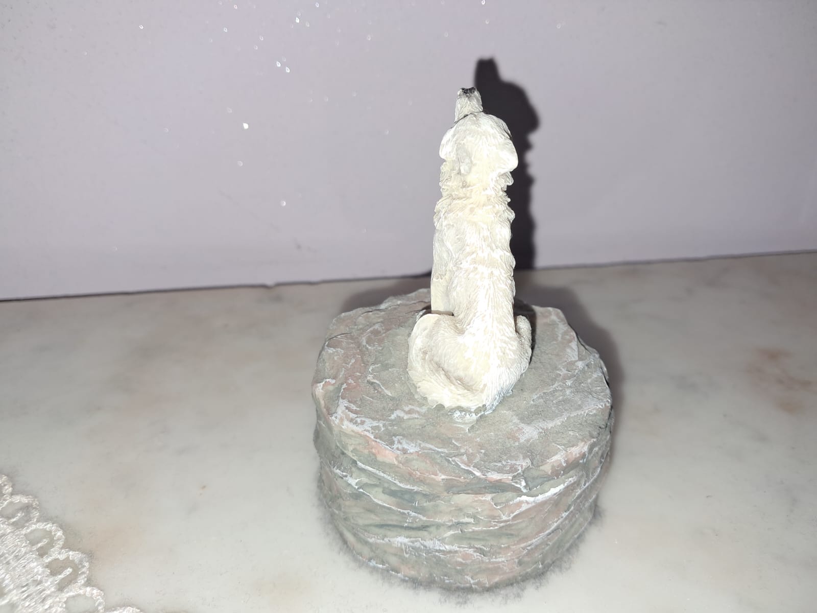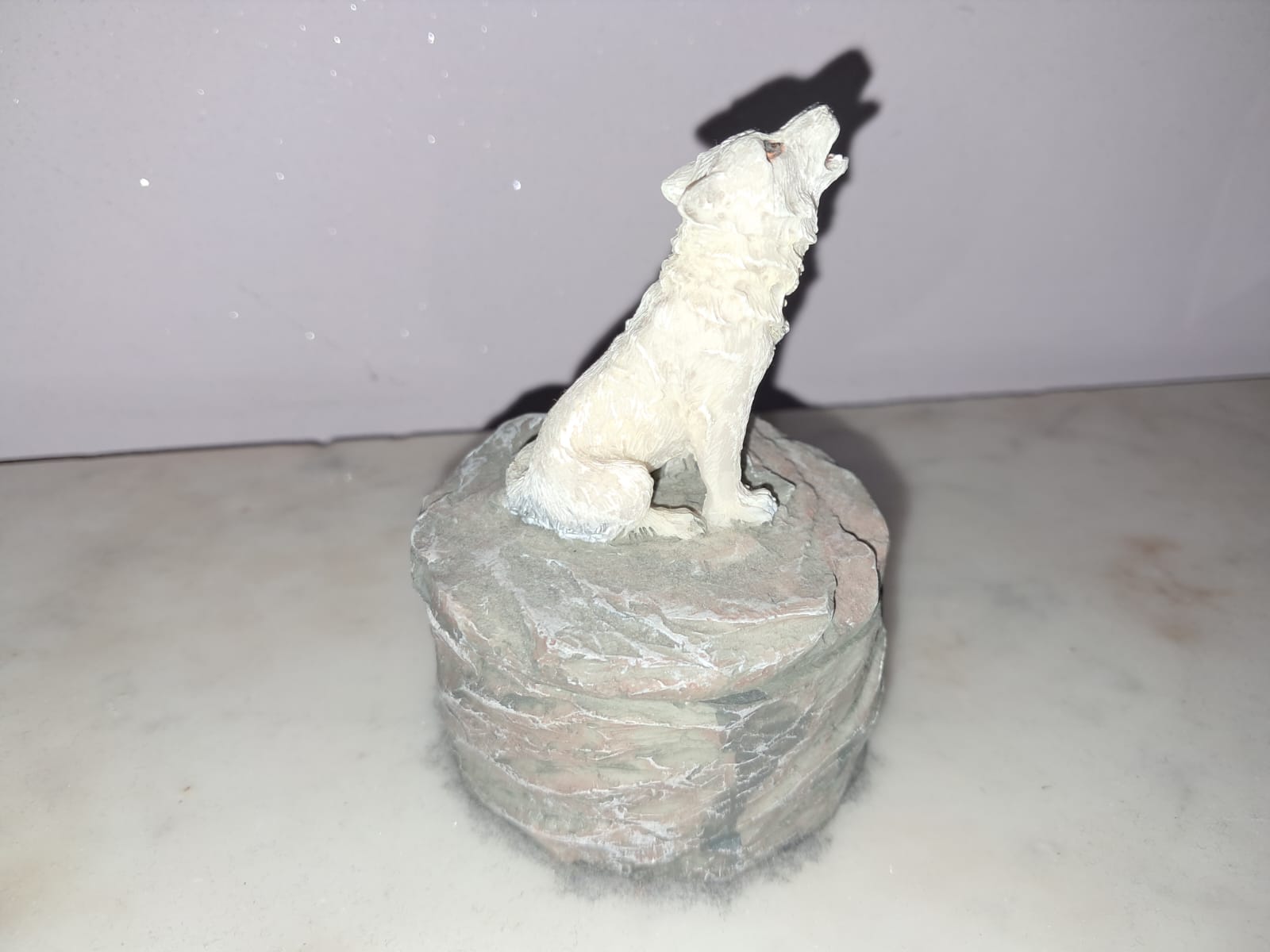 A finely detailed resin sculpture depicting a white wolf in a howling pose. The animal is perched on a circular base that mimics the texture of natural rock.