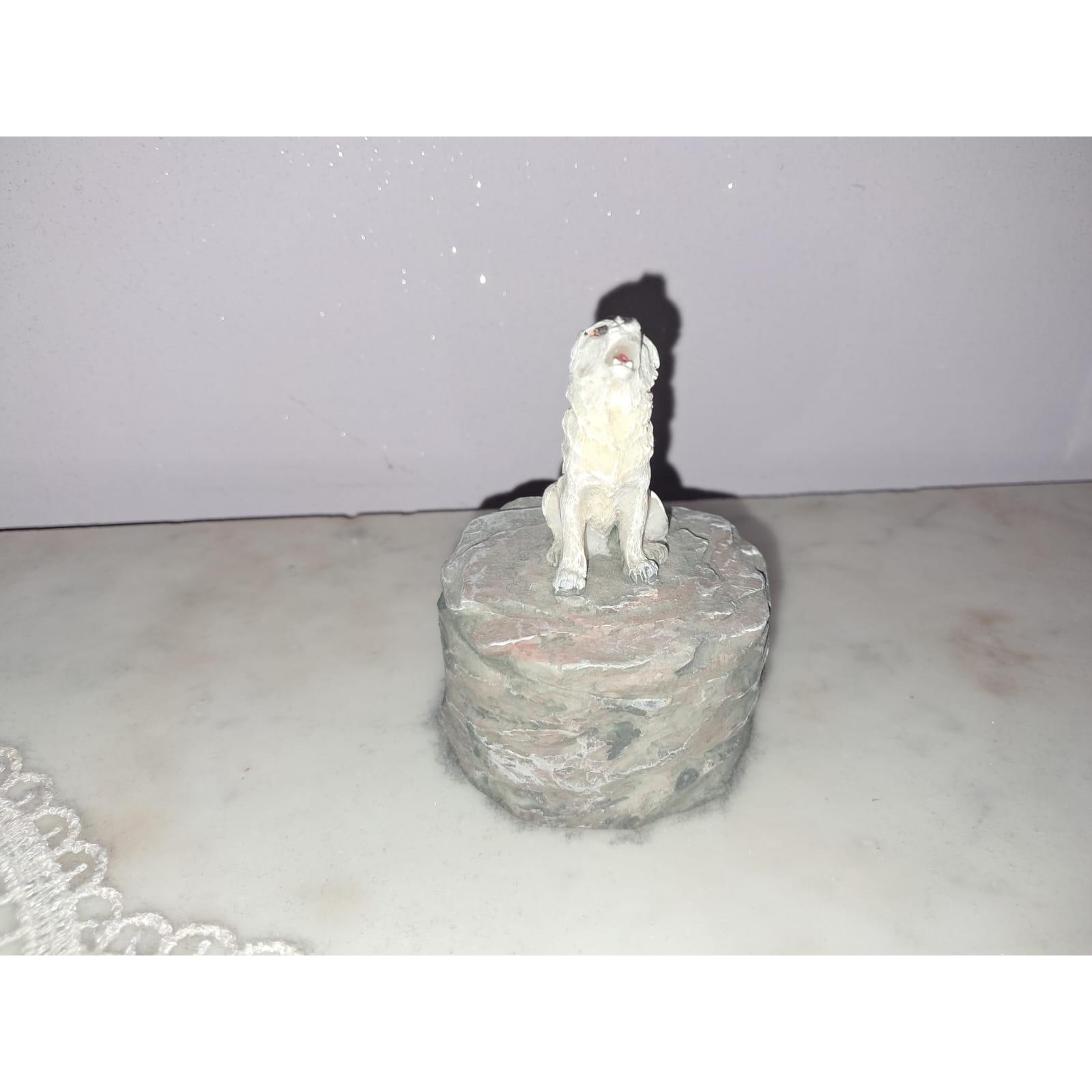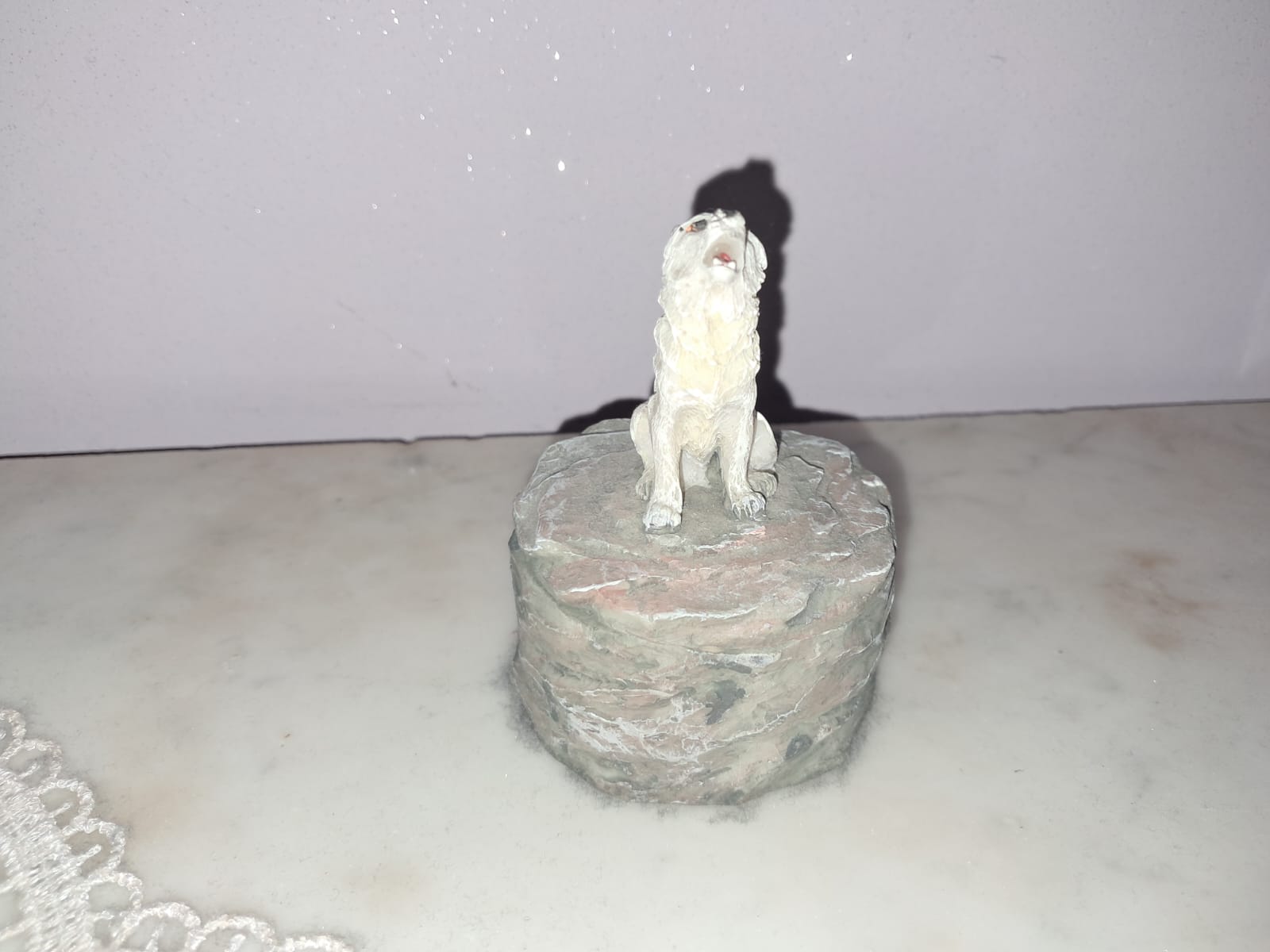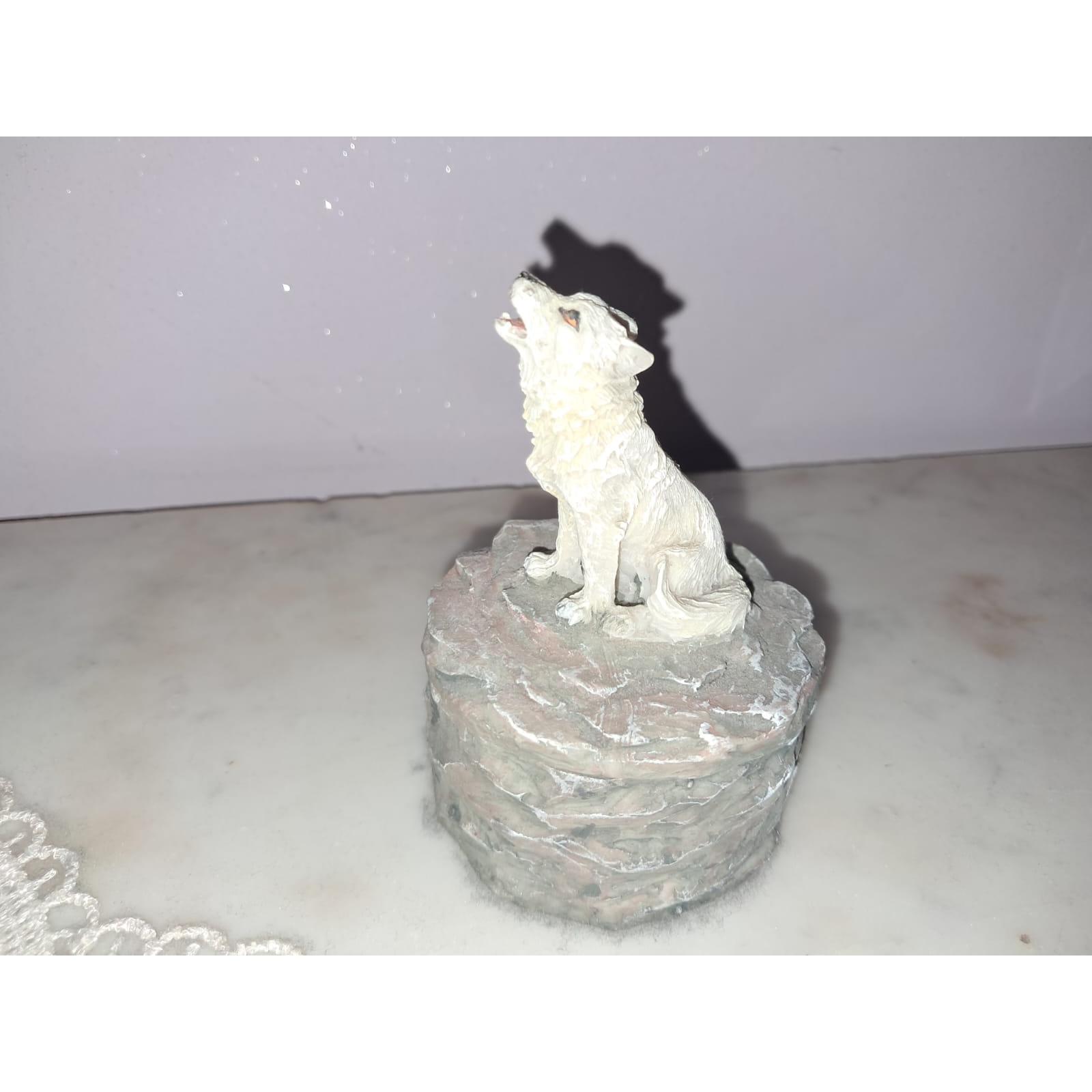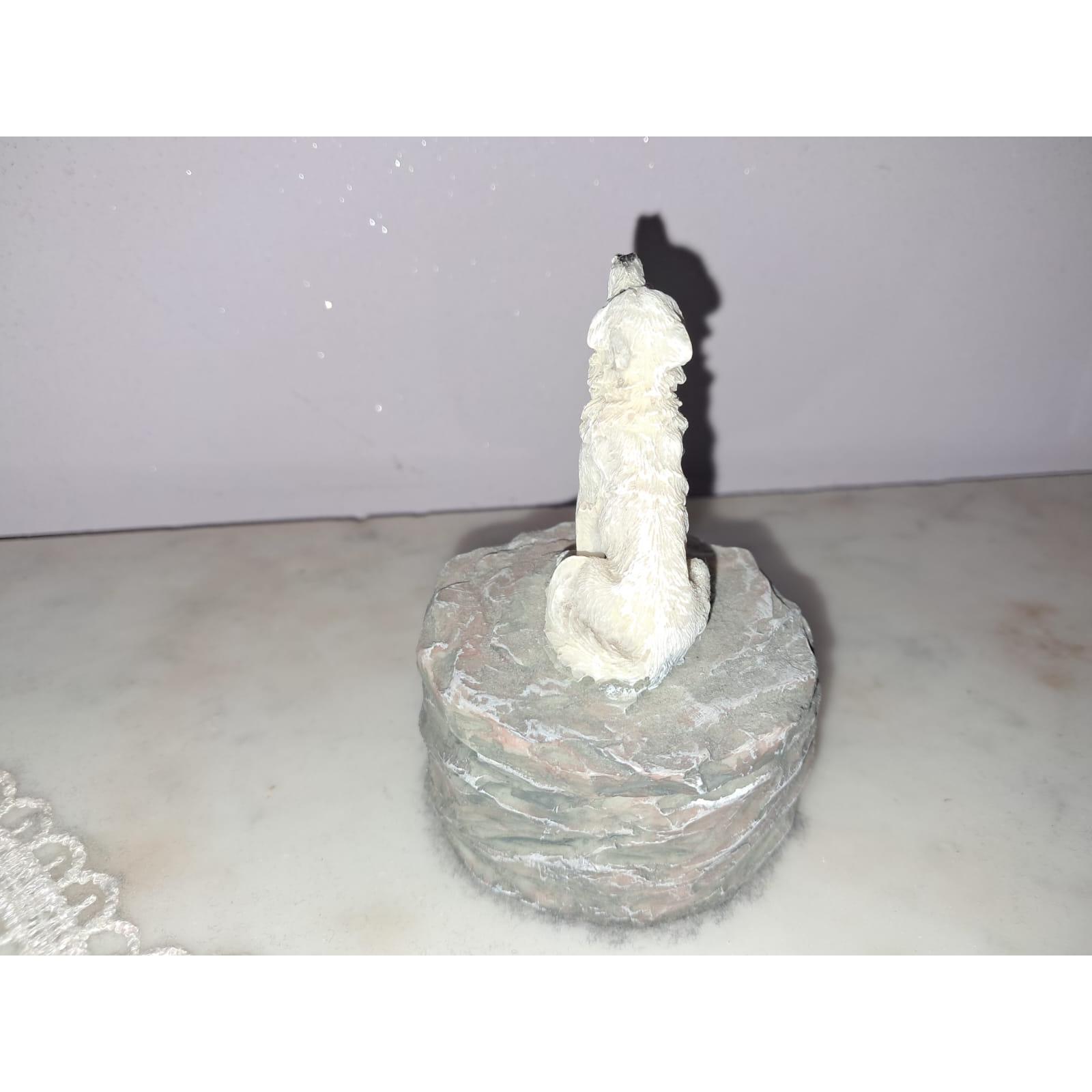 A finely detailed resin sculpture depicting a white wolf in a howling pose. The animal is perched on a circular base that mimics the texture of natural rock.