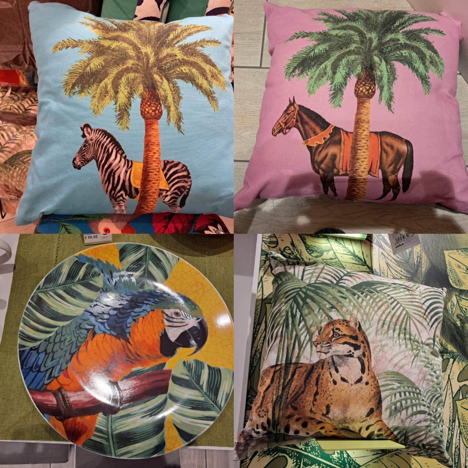 Cushions version camel, ocelot, horse, zebra ????????????and a plate with macaw parrot brand Excelsa