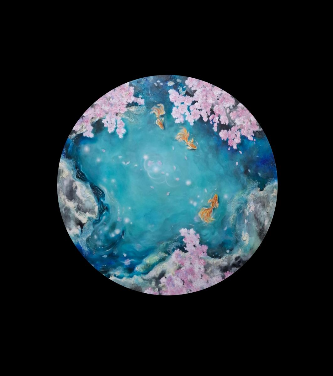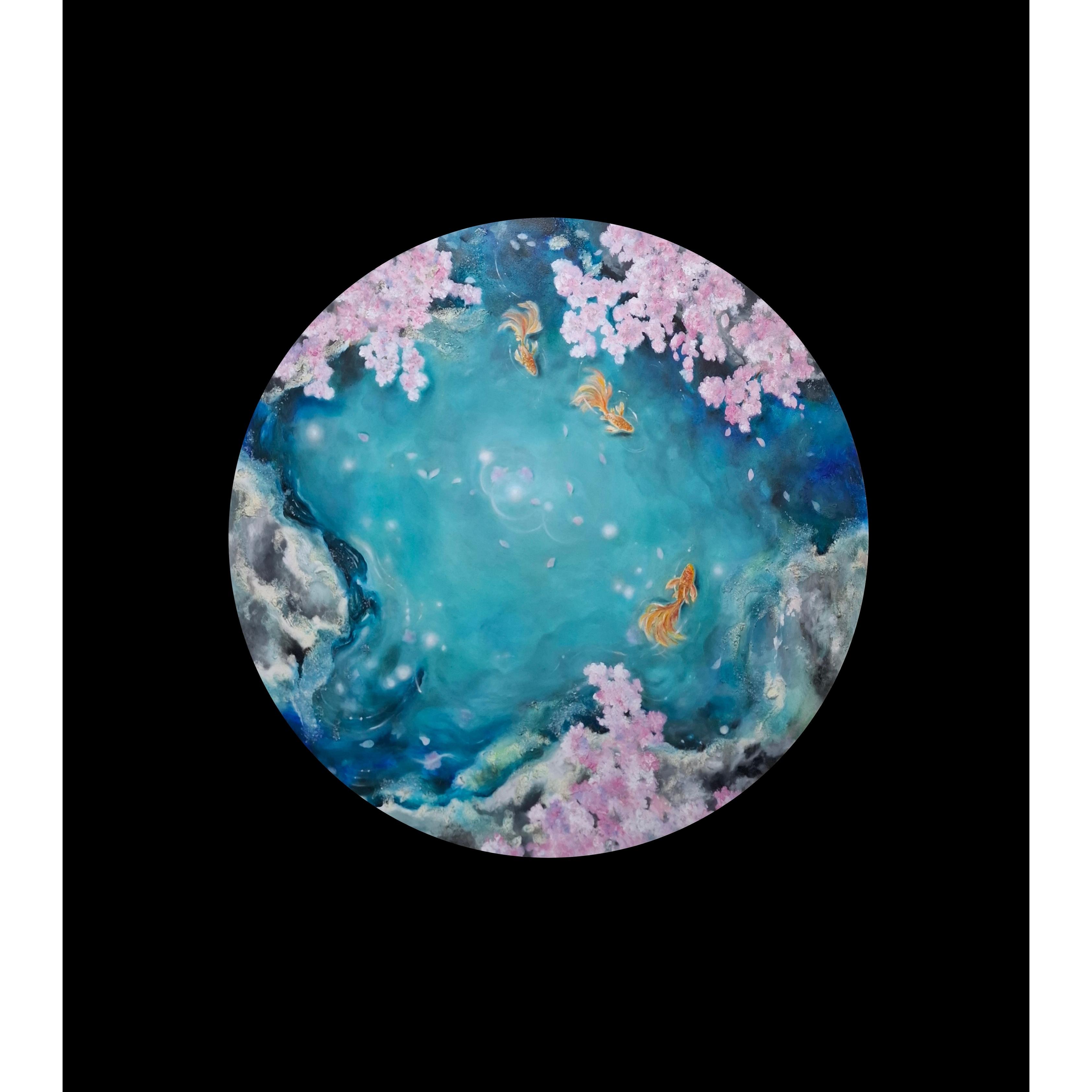 In quest’ opera l’ artista ricerca l’ emozione e il senso dell’ esistenza tramite la natura.Si esplora il quadro come uno spazio di pausa, dove il tempo fluttua e la presenza si dispiega silenziosamente.I fiori rosa e l’acqua che scorre segnano la natura effimera dei momenti, mentre i pesci dorati si muovono delicatamente attraverso la scena, suggerendo continuità e calma.Il formato circolare enfatizza l’armonia e il ciclo, creando uno spazio contemplativo. L’ apertura dei flussi d’ acqua suggeriscono una continuità, come se il quadro potesse andare oltre i suoi margini tramite la mente e l’ immaginazione dell’ osservatore. La tecnica mista lascia emergere la durezza delle rocce, che accostata alla quiete dell’acqua rivela una luce inattesa. È nel loro incontro — grezzo e fluido, forza e calma — che nasce una nuova bellezza, fragile e perfetta, una poesia silenziosa che solo l’osservatore può percepire.L’opera è una meditazione originale sulla presenza, l’impermanenza e la bellezza silenziosa.