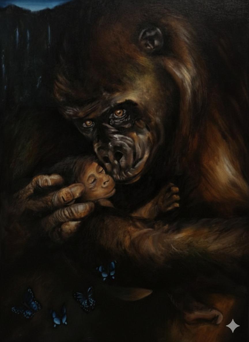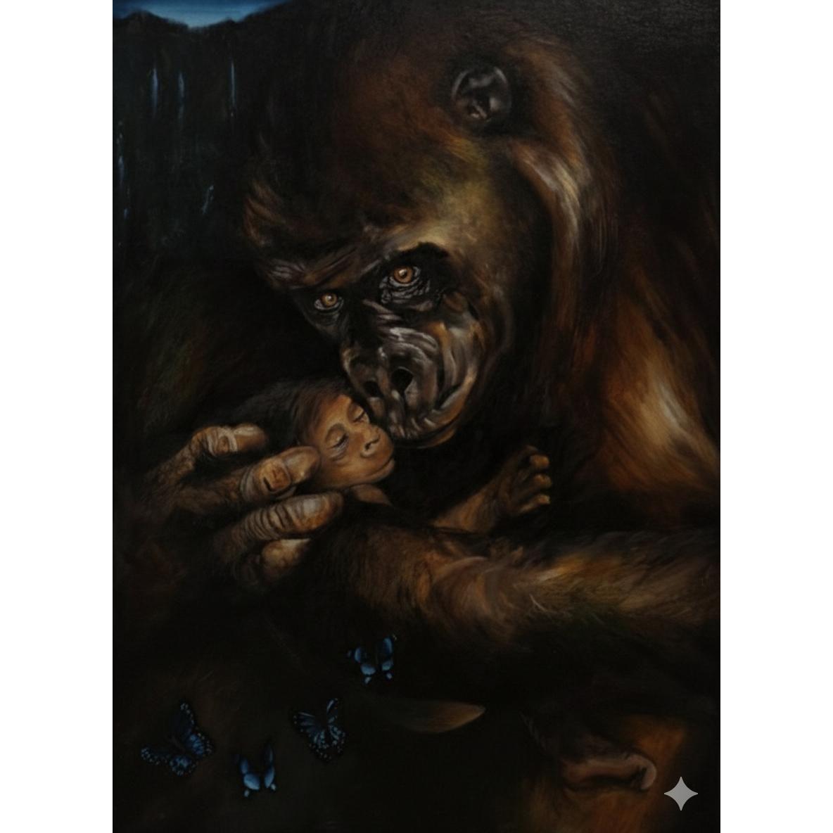 In quest’ opera l’ artista rappredenta la protezione primordiale. Una mamma gorilla che tiene stretto il suo piccolo: fragile, silenzioso.Tutto intorno è vita: le farfalle, lievi presenze. E le fontane in lontananza in una giungla scura piena di pericoli.L’opera esplora la tensione tra istinto e compassione, tra amore e il dover lasciare andare un giorno. Gli occhi della mamma dicono tutto, sono consapevoli di una forza interiore, di presenza e un pò di paura mascherata da determinazione.